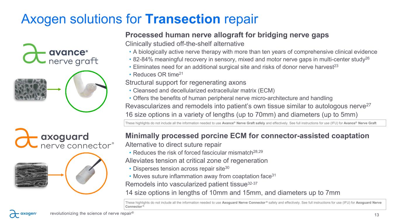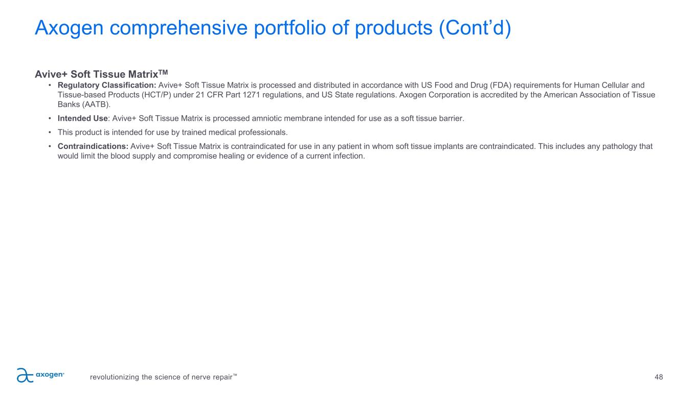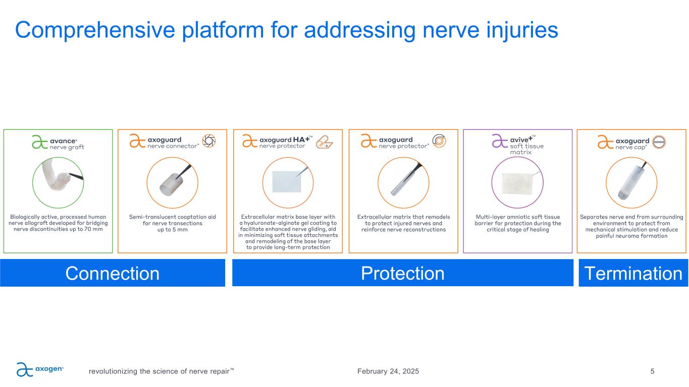 Axogenの製品ポートフォリオには、切断された末梢神経を二次手術部位に伴う合併症を伴わずに橋渡しするための、生物学的に活性な既製加工ヒト神経移植片であるAvance® Nerve Graftが含まれる;Axoguard Nerve Connector®は、切断された末梢神経を無緊張で修復するためのブタ粘膜下層ECMコアプテーション補助材である。Axoguard Nerve Protector®は、損傷した末梢神経を包んで保護し、軟組織の癒着を防ぎながら神経の再建を補強するために使用されるブタ粘膜下層ECM製品である;Axoguard HA+ Nerve Protector™ は、独自のヒアルロン酸アルギン酸ゲルでコーティングされたブタ粘膜下層ECMベースレイヤーで、末梢神経損傷を短期的・長期的に保護するために設計された次世代技術である;Avive+ Soft Tissue Matrix™は、組織修復の重要な段階において、手術床の組織を保護し分離するために使用される多層羊膜移植片であり、Axoguard Nerve Cap®は、末梢神経末端を保護し、神経を周囲の環境から分離して症候性神経腫や有痛性神経腫の発生を抑えるために使用されるブタ粘膜下ECM製品である。アクソジェン社の製品群は、米国、カナダ、ドイツ、英国、スペイン、韓国、その他数カ国で販売されている。