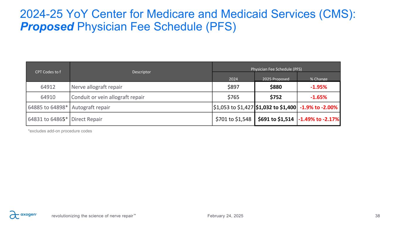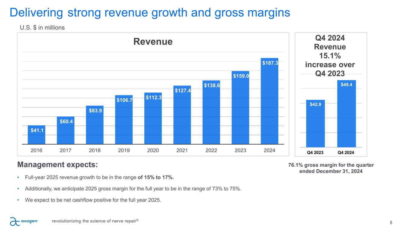 「2024 年第 4 四半期および通年の業績に満足しています。アクソジェン社CEO兼取締役のマイケル・デイルは、次のように述べています。「2024年の業績は、当社の全ポートフォリオにまたがる幅広いものであり、当社の事業のあらゆる部分にわたる継続的な実行の改善を反映したものでした。「2024年を基盤に、末梢神経機能の回復を将来の標準治療とすることで、健康を回復し、生活の質を向上させるための重要な取り組みを拡大することに興奮しています。アクソジェン社のCEO兼取締役であるマイケル・デール氏は、次のように述べています。「私たちは、今後数年間に事業のために確立した優先順位と仕事の流れが、アクソジェン社の事業目的を達成することにつながると考えており、3月4日のインベスター・デイのイベントで私たちの計画を詳しくお話しできることを楽しみにしています。