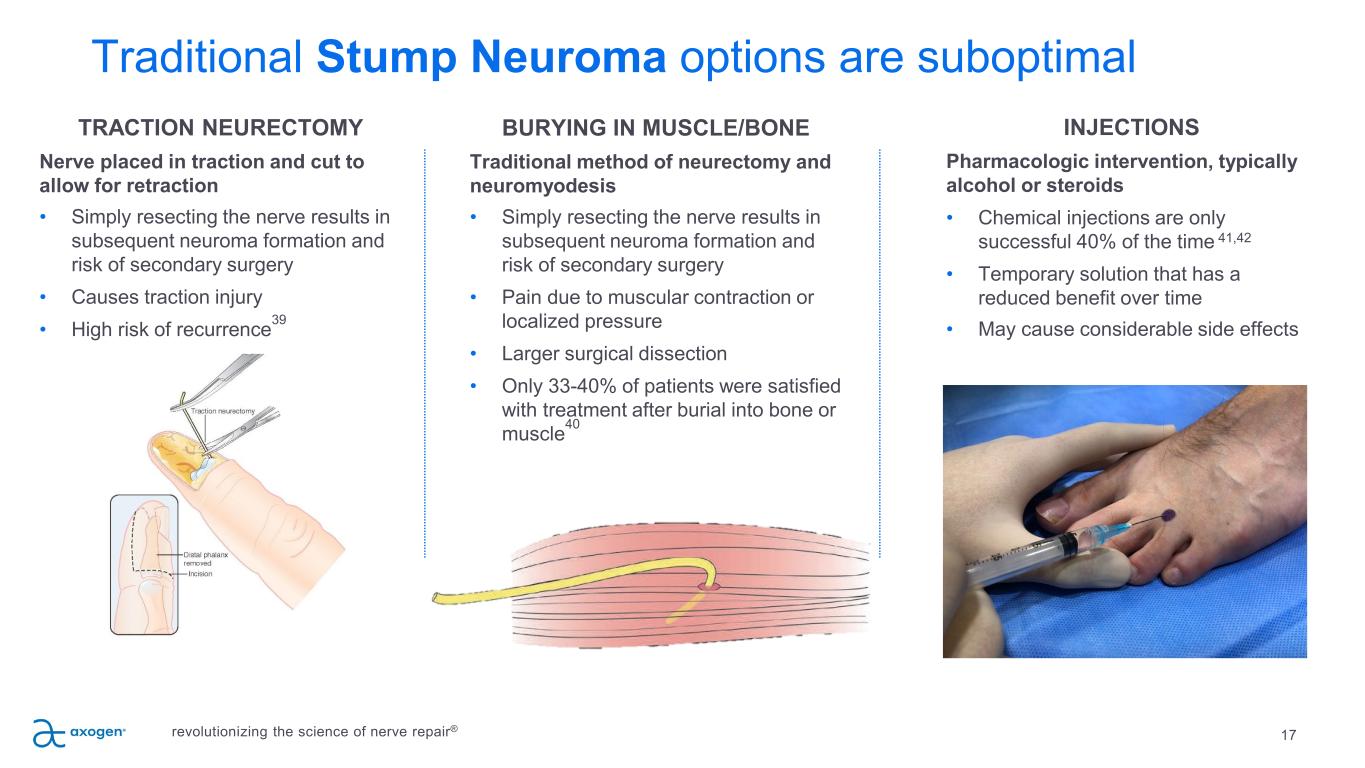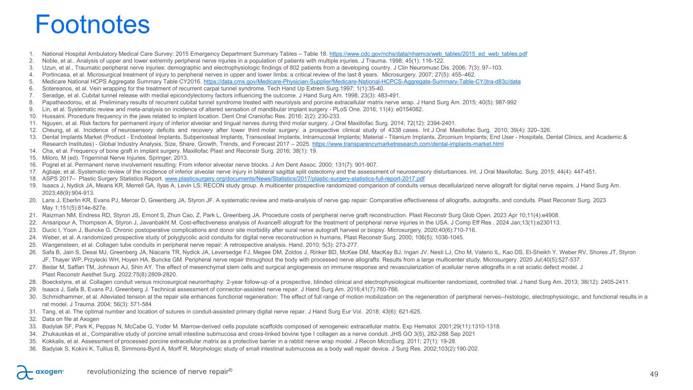 Axogenの末梢神経修復のためのプラットフォームは、2つの主要なアプリケーションカテゴリー(予定された非外傷処置と緊急の外傷処置)で使用される製品の包括的なポートフォリオを特徴としています。予定された処置とは、一般的に、神経欠損や外科的処置によって引き起こされる症状の緩和を患者が求めている処置を指します。このような処置には、乳房切除後の乳房再建、有痛性神経鞘腫の外科的除去後の神経再建、口腔および顎顔面処置、神経減圧術を求める女性に感覚を提供することが含まれる。緊急処置は一般的に、ERで最初に受診した傷害に起因する処置である。これらの処置は通常、最初の受傷後すぐに、または数日以内に専門医に紹介され、完了する。