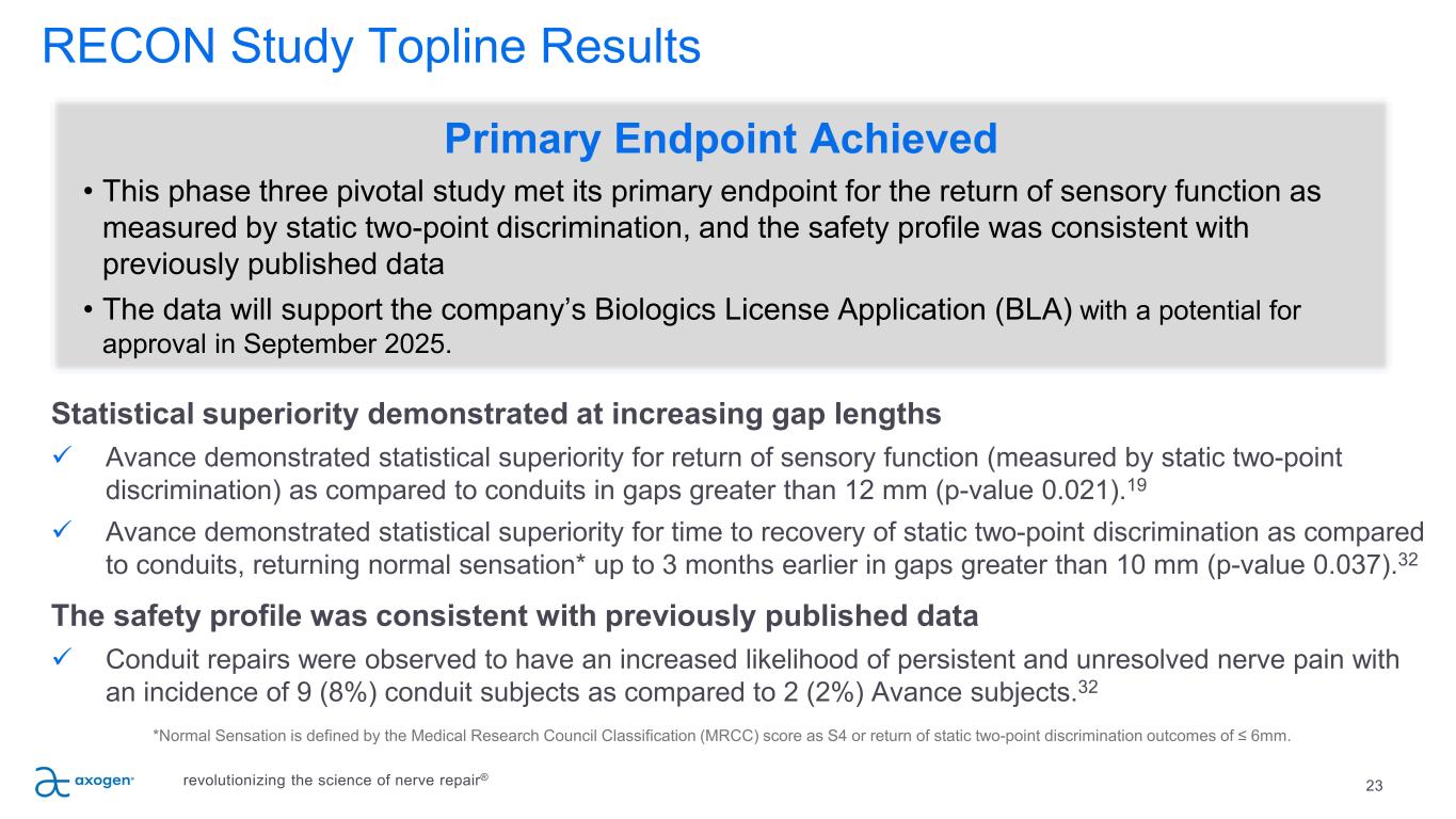 -米国食品医薬品局(以下「FDA」)は、Avance® Nerve Graftの生物製剤承認申請(以下「BLA」)を2024年11月1日に受理し、処方薬ユーザーフィー法(以下「PDUFA」)の目標日を2025年9月5日に指定した。当社は引き続きFDAとの手続きを進めており、2025年9月の承認を見込んでいる。