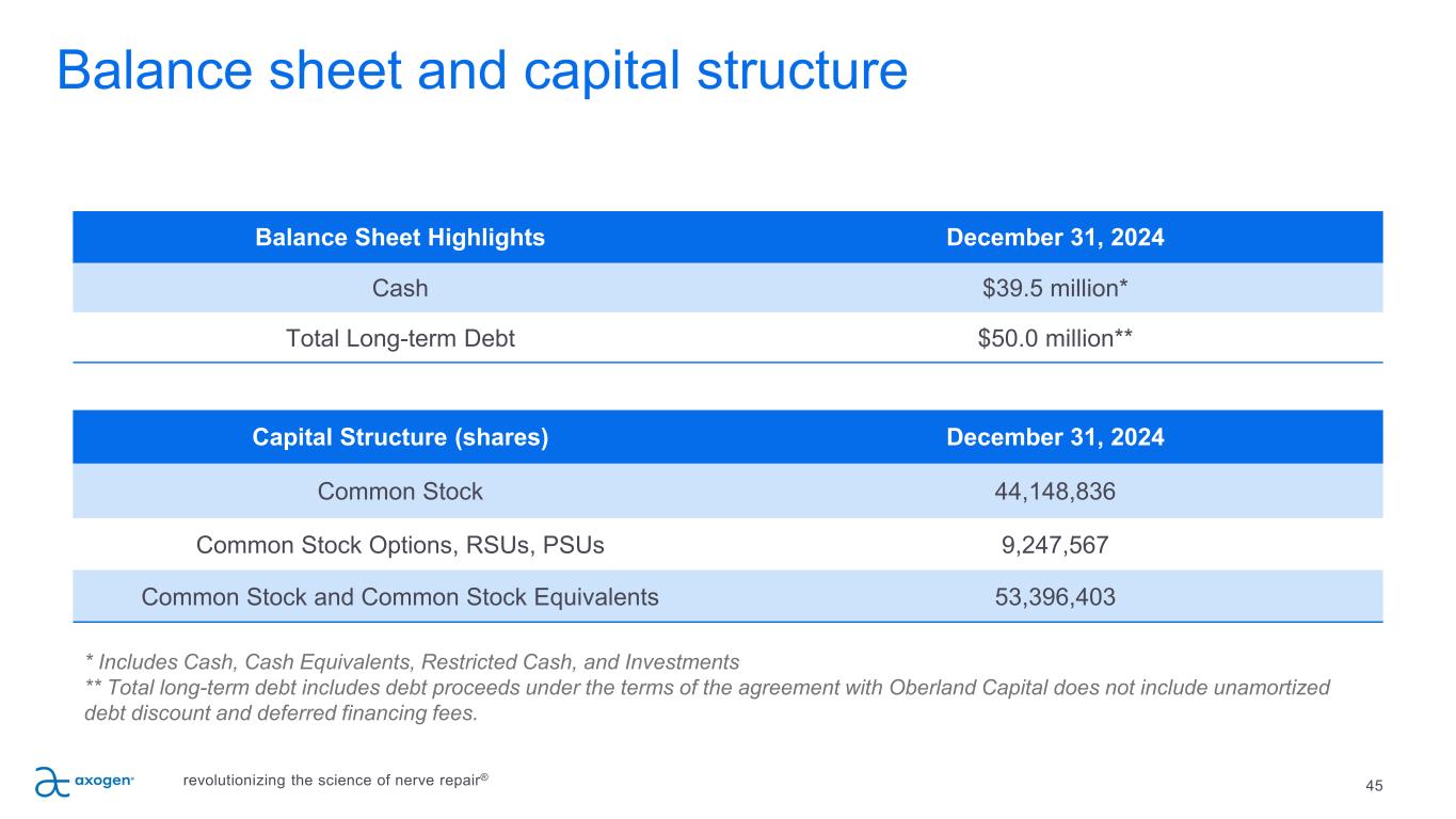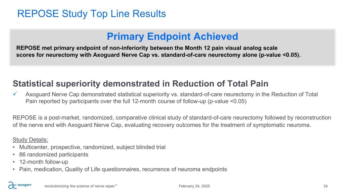 フロリダ州アラチュアおよびタンパ - 2025年2月25日 - 末梢神経損傷に対する革新的な外科的ソリューションの開発・販売で世界をリードするアクソジェン・インク(NASDAQ: AXGN)は本日、2024年12月31日を期末とする第4四半期および通期の決算と事業ハイライトを発表しました。