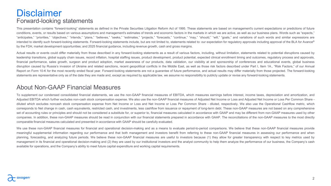 本プレスリリースには、1995年米国私募証券訴訟改革法(Private Securities Litigation Reform Act of 1995)で定義された「将来の見通し」に関する記述が含まれています。これらの記述は、当社が活動する市場の動向や経済要因、事業計画に関するさまざまな仮定や経営陣の推定に基づく、将来の状況、出来事、結果に関する経営陣の現在の予想や予測に基づいています。期待する」、「予想する」、「優先事項」、「目的」、「目標」、「意図する」、「計画する」、「考える」、「求める」、「推定する」、「プロジェクト」、「予測する」、「継続する」、「かもしれない」、「はずである」、「予定である」、「目標」などの言葉やその変化形、および同様の表現は、このような将来の見通しに関する記述を特定するためのものです。将来予想に関する記述には、当社のビジネスモデル最適化計画、市場開発戦略および目標、当社の商業的実行の強みと規律に関する当社の信念、末梢神経機能の回復を期待される標準治療とすることで健康を回復し、生活の質を向上させるという当社の事業目的、2025年9月のBLA承認への期待に関する記述、ならびに "2025年財務ガイダンス "の小見出しに記載された記述が含まれますが、これらに限定されるものではありません。実際の結果や事象は、指導者の交代による潜在的な混乱、グローバル・サプライチェーンの問題、記録的なインフレ、病院の人員配置の課題、製品開発のスケジュール、製品の可能性、予想される臨床登録のタイミングと結果、規制当局のプロセスと承認、財務実績など(ただし必ずしもこれらに限定されない)、さまざまな要因の結果として、将来の見通しに関する記述に記載されているものとは大きく異なる可能性があります、売上成長率、外科医および製品採用率、当社製品の市場認知度、データ検証プロセス、学会および教育イベントにおける当社の知名度およびスポンサーシップ、ロシアのウクライナ侵攻および関連制裁による世界的な事業の混乱、中東における最近の地政学的紛争、進化するマクロ経済環境(金融市場の変動を含む)、地政学的緊張の激化および米国貿易相手国との貿易紛争。の「リスク要因」に記載されているリスク要因と同様である、「に記載されているリスク要因、および当社がSECに提出した報告書に随時詳述されているその他のリスクや不確実性です。将来予想に関する記述は将来の業績を保証するものではなく、実際の業績は予測とは大きく異なる可能性があります。将来予想に関する記述は、それらが作成された時点における代表的なものに過ぎず、適用法で義務付けられている場合を除き、当社は将来予想に関する記述を公に更新または修正する責任を負いません。
