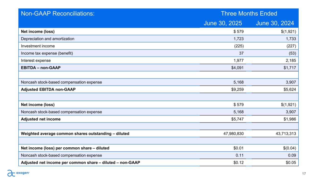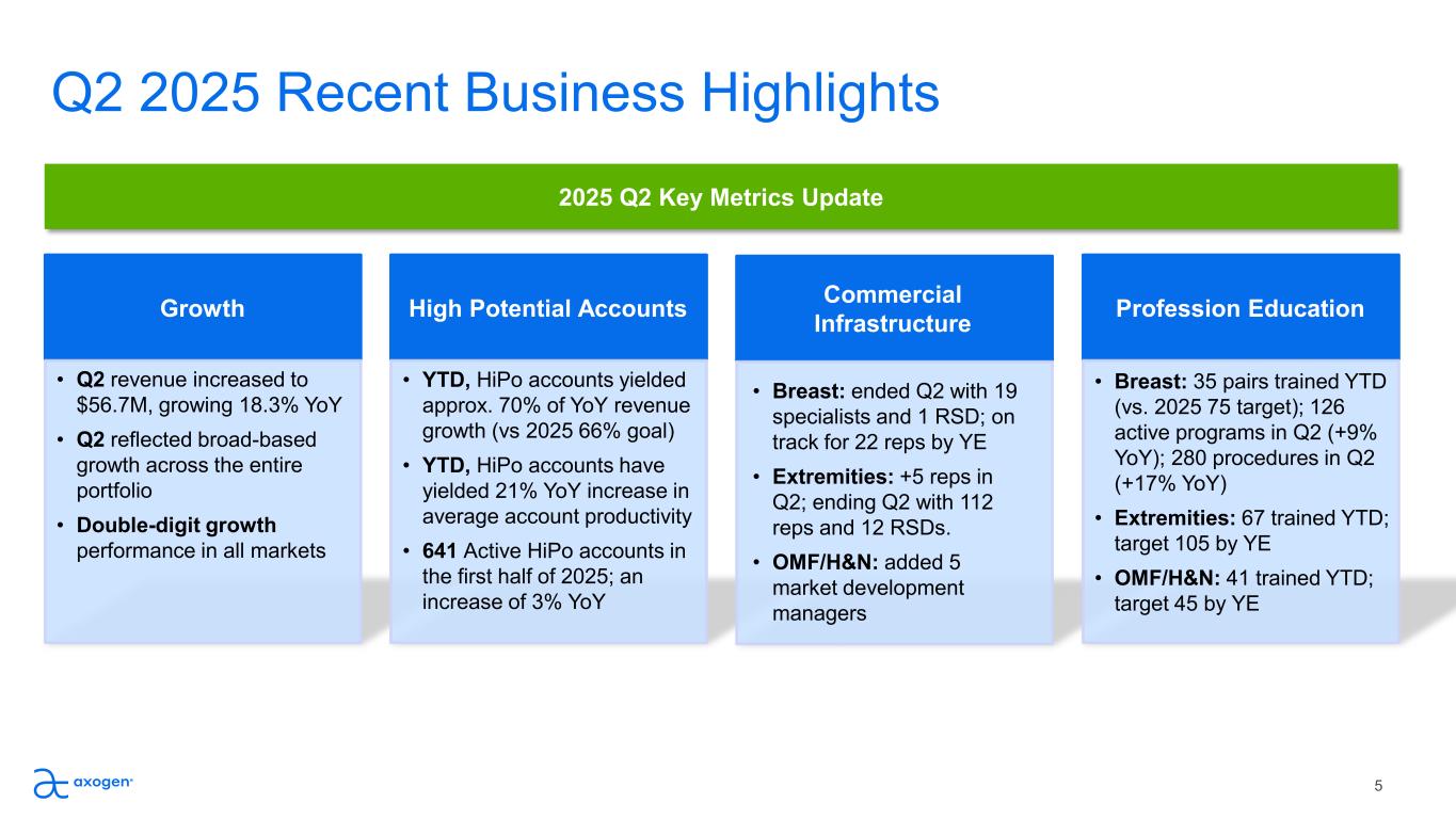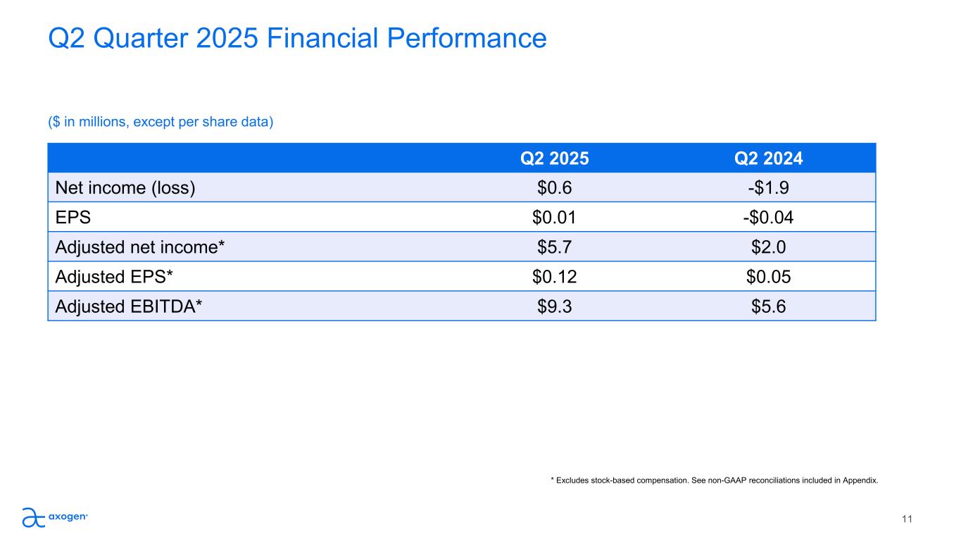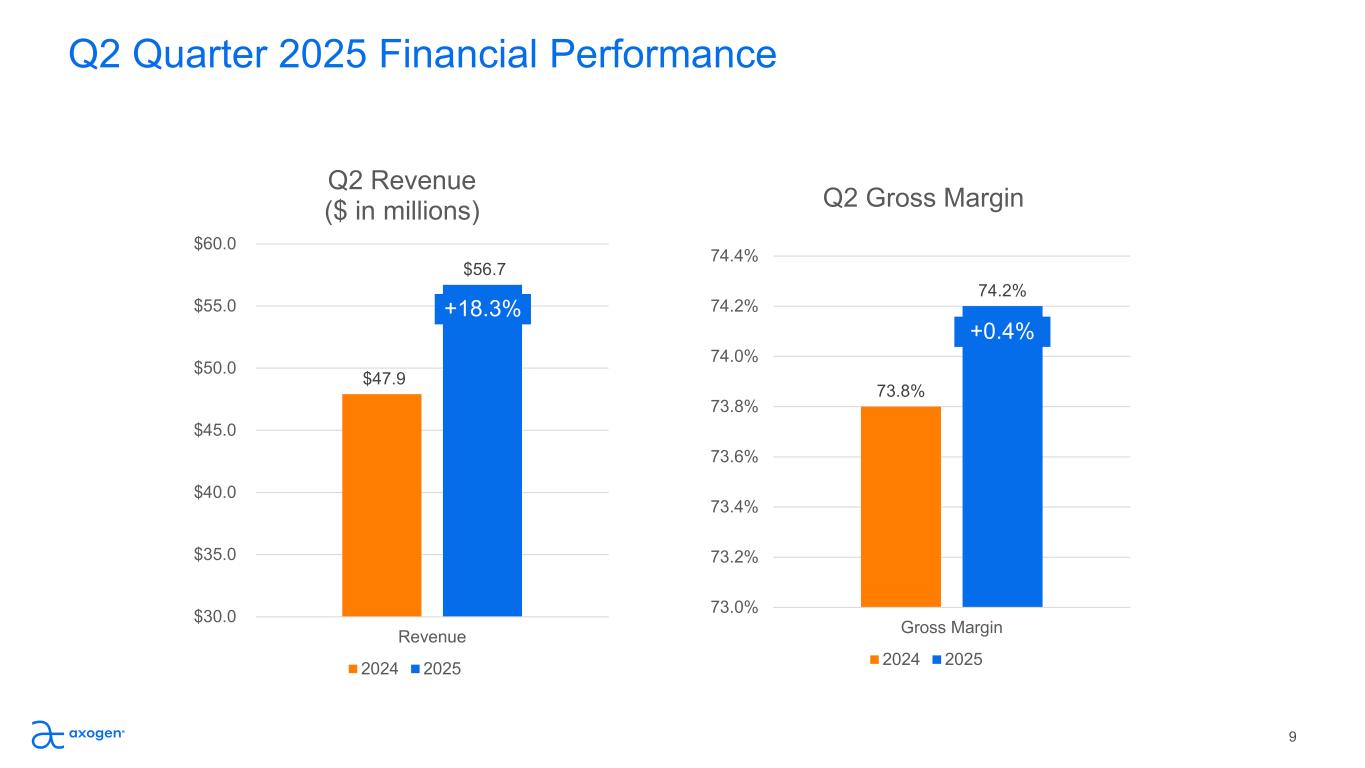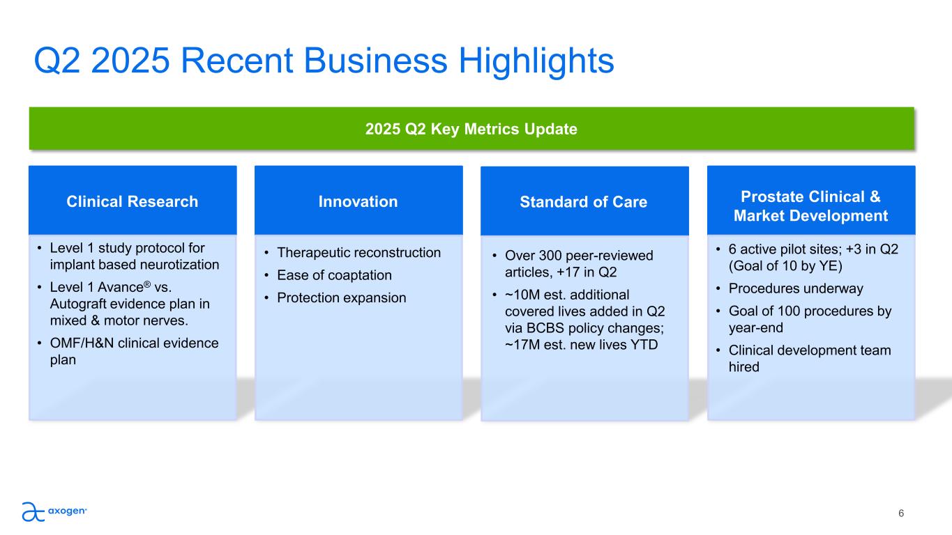 フロリダ州アラチュアおよびタンパ - 2025年8月5日 - 末梢神経機能回復のための革新的な外科的ソリューションの開発・販売で世界をリードするアクソジェン社(NASDAQ: AXGN)は本日、2025年6月30日に終了した第2四半期の業績と事業ハイライトを発表しました。