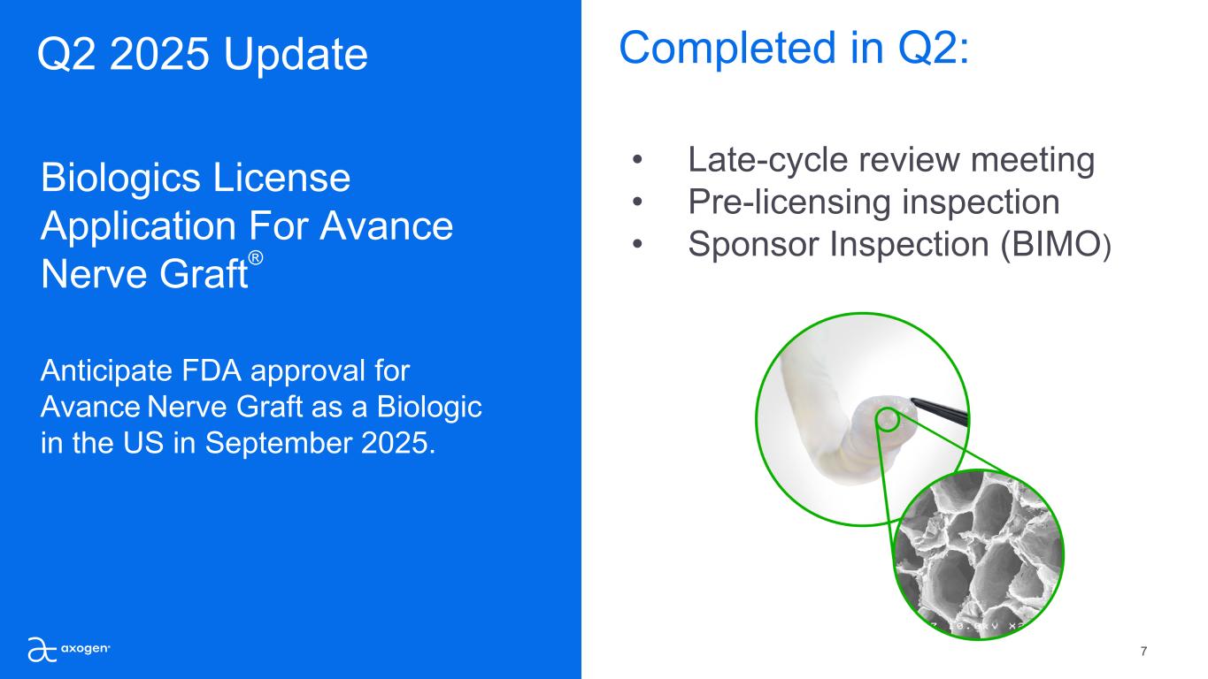 -米国食品医薬品局(以下「FDA」)は、2024年11月1日に当社のAvance® Nerve Graftの生物製剤承認申請(以下「BLA」)を受理し、処方薬ユーザーフィー法の目標日を2025年9月5日に指定した。2025年第2四半期中、当社は2025年9月に予想される承認をサポートするため、以下の規制上のマイルストーンを完了しました。FDAとのレイトサイクル会議、ライセンス前検査、FDAのBioresearch Monitoringプログラムに基づくスポンサー検査です。