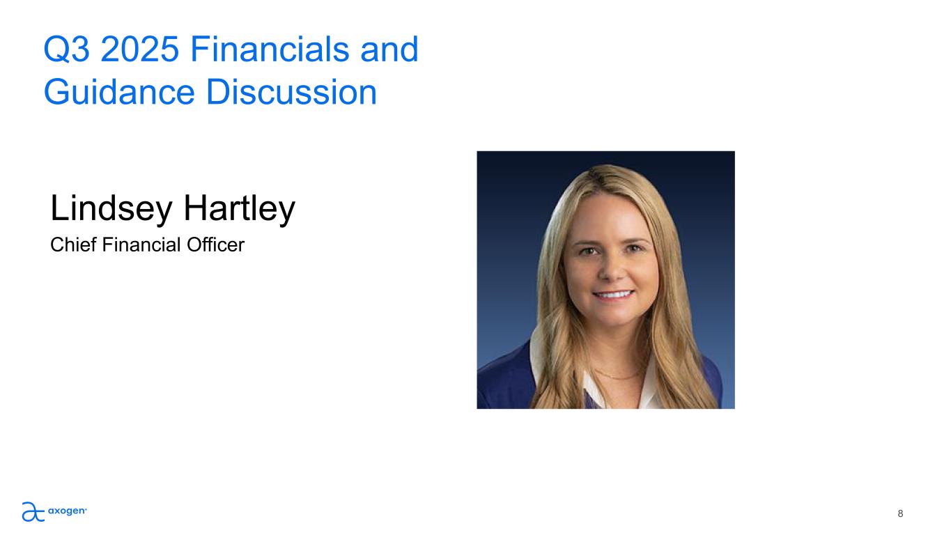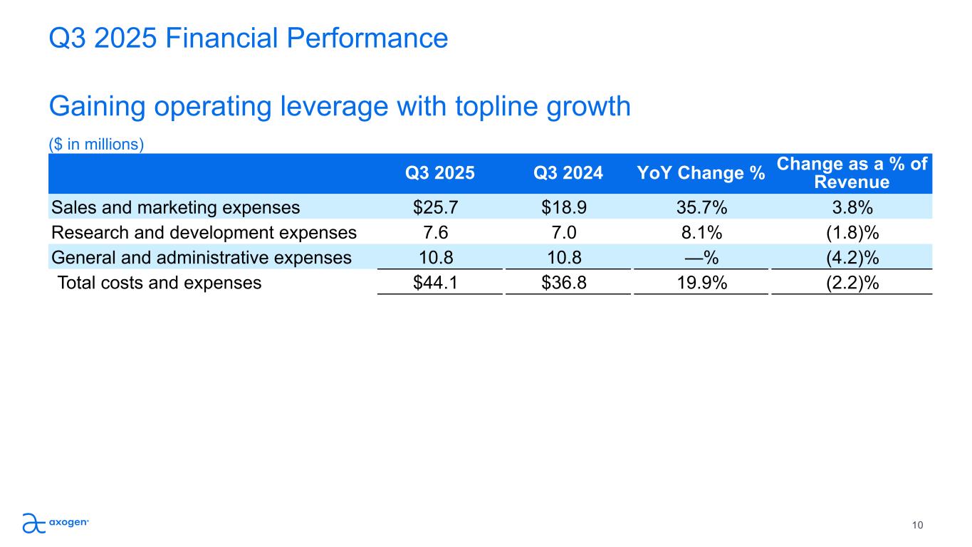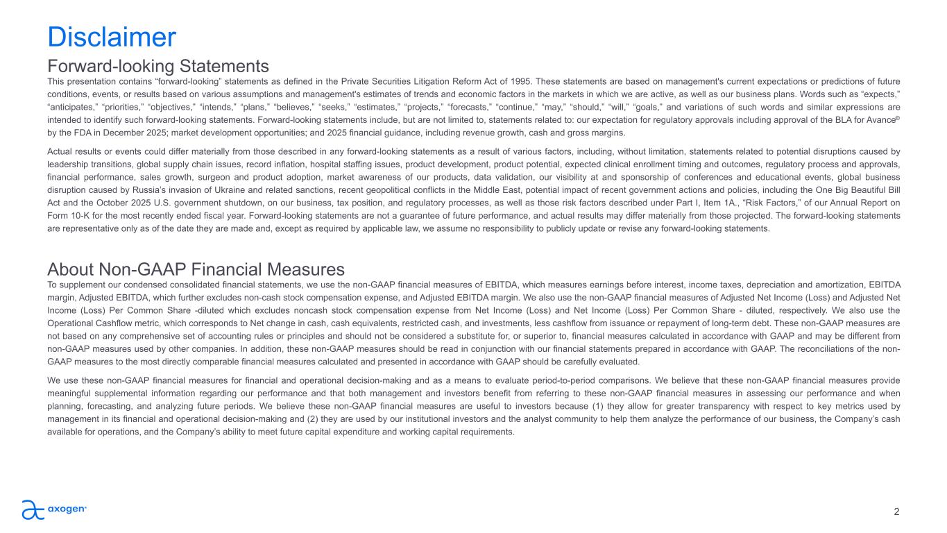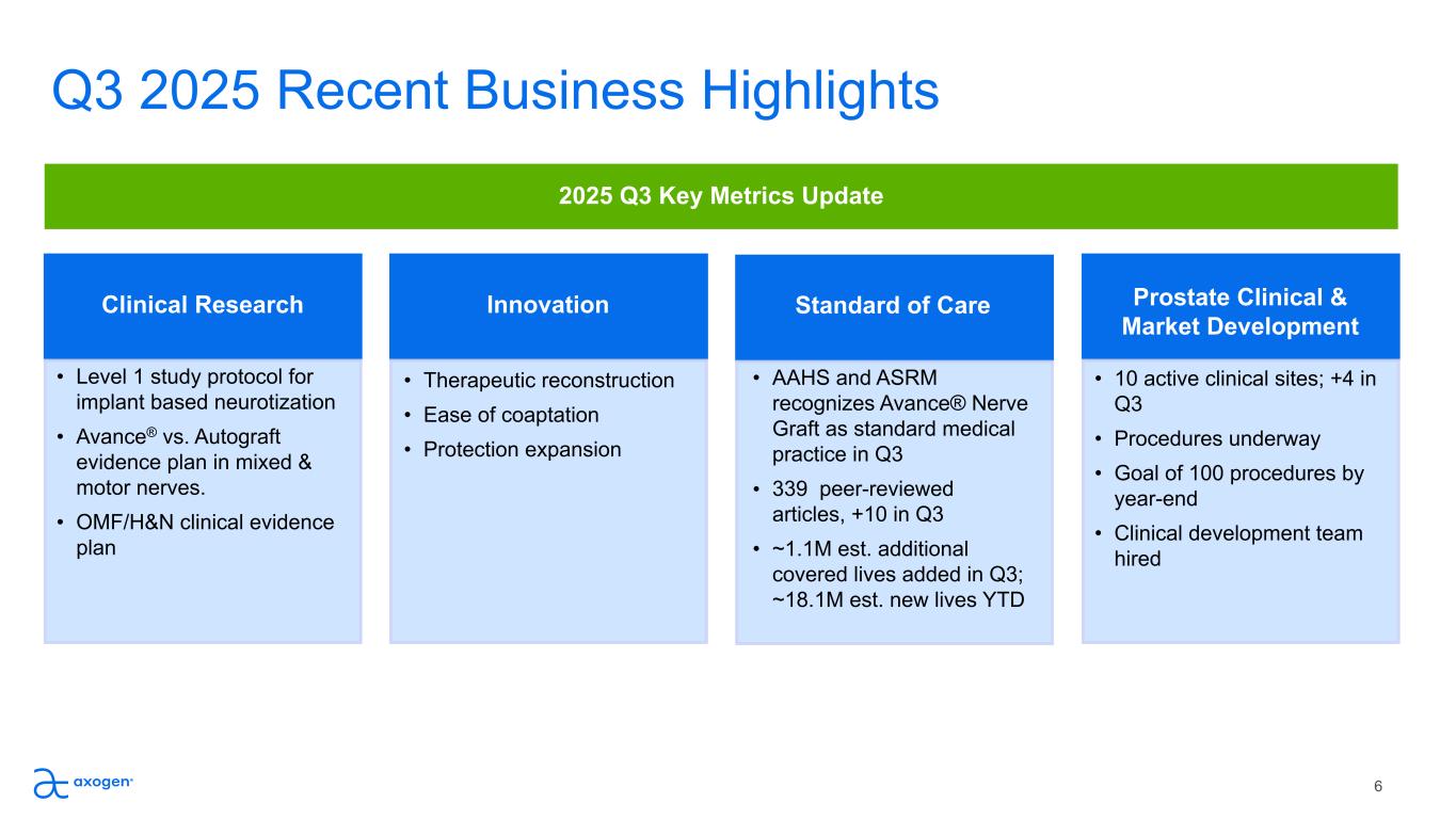 フロリダ州アラチュアおよびタンパ - 2025年10月29日 - 末梢神経機能回復のための革新的な外科的ソリューションの開発・販売で世界をリードするアクソジェン社(NASDAQ: AXGN)は本日、2025年9月30日に終了した第3四半期の業績および事業ハイライトを発表しました。