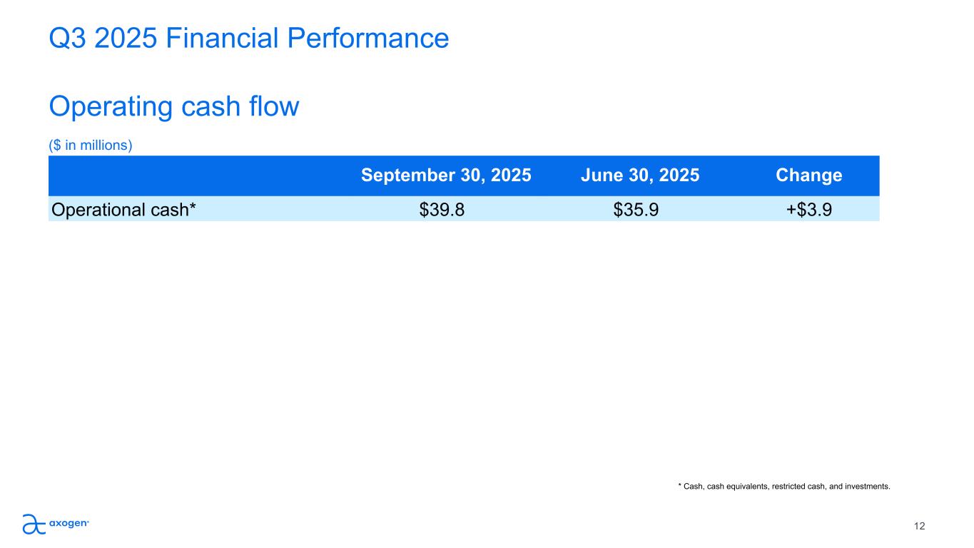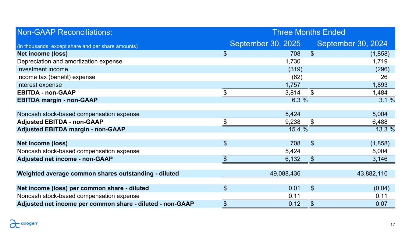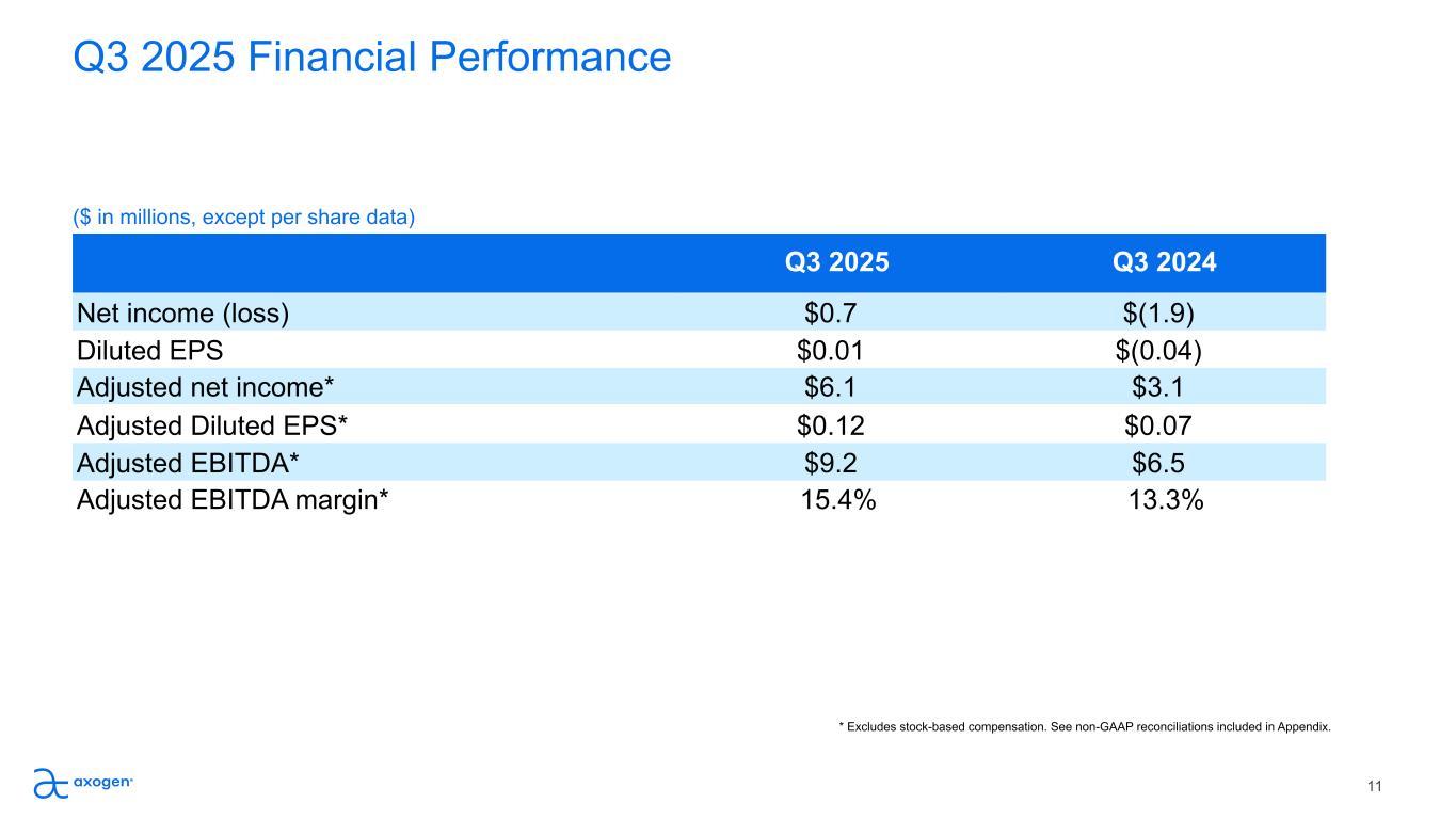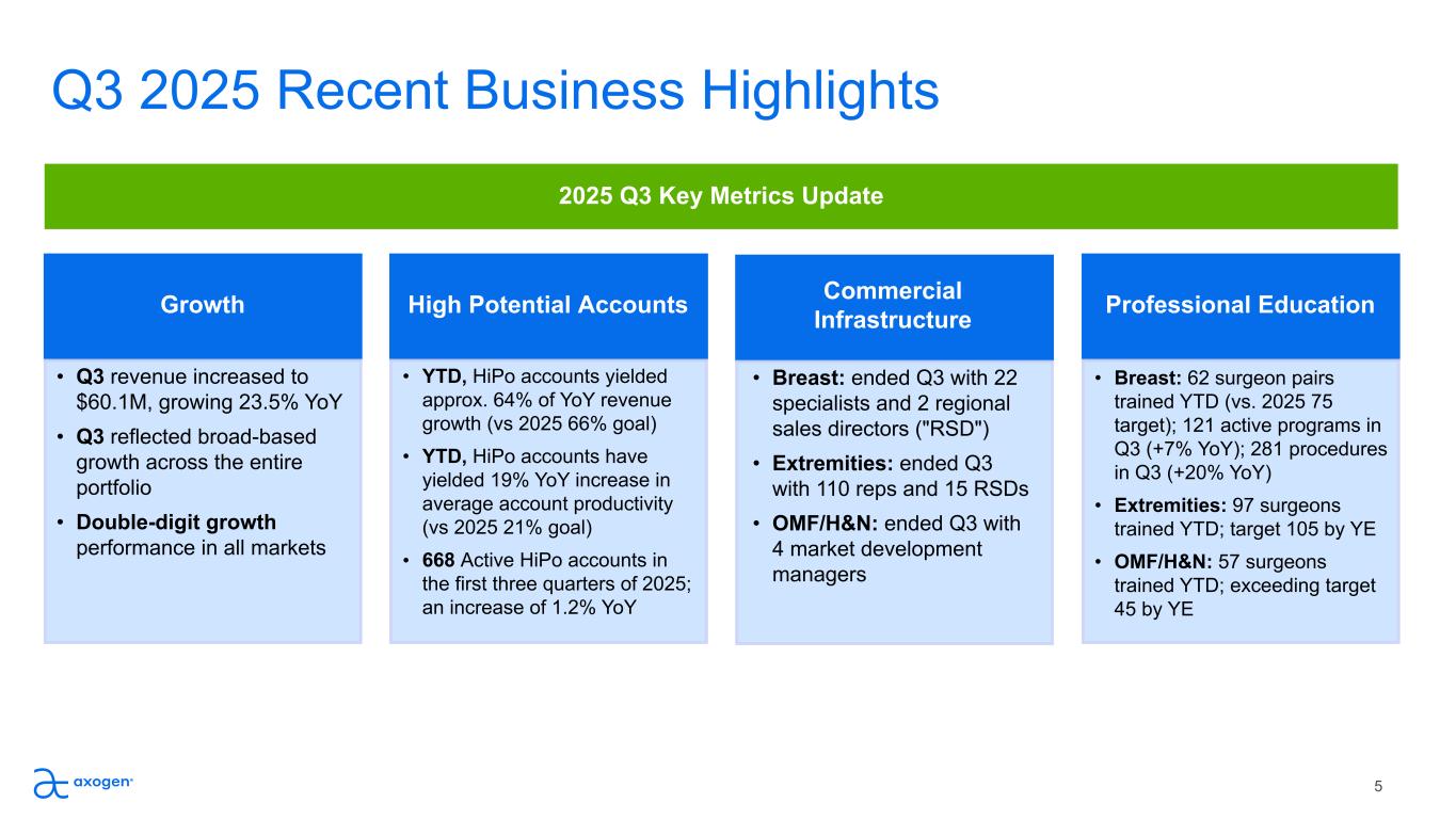 フロリダ州アラチュアおよびタンパ - 2025年10月29日 - 末梢神経機能回復のための革新的な外科的ソリューションの開発・販売で世界をリードするアクソジェン社(NASDAQ: AXGN)は本日、2025年9月30日に終了した第3四半期の業績および事業ハイライトを発表しました。