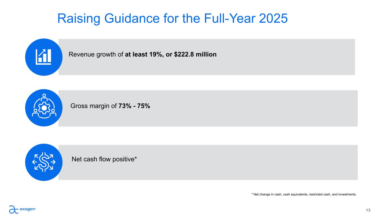 通年の売上高ガイダンスを少なくとも19%増の2億2280万ドルに引き上げる。通年の売上総利益率は引き続き73%から75%の範囲と予想しています。この範囲には、主にAvance® Nerve GraftのBLA承認取得に関連する一時的な費用が反映されており、売上総利益率に約1%(200万ドル)のマイナスの影響を与えると予想しています。最後に、通期のネット・キャッシュ・フローは黒字になると改めて見込んでいます。