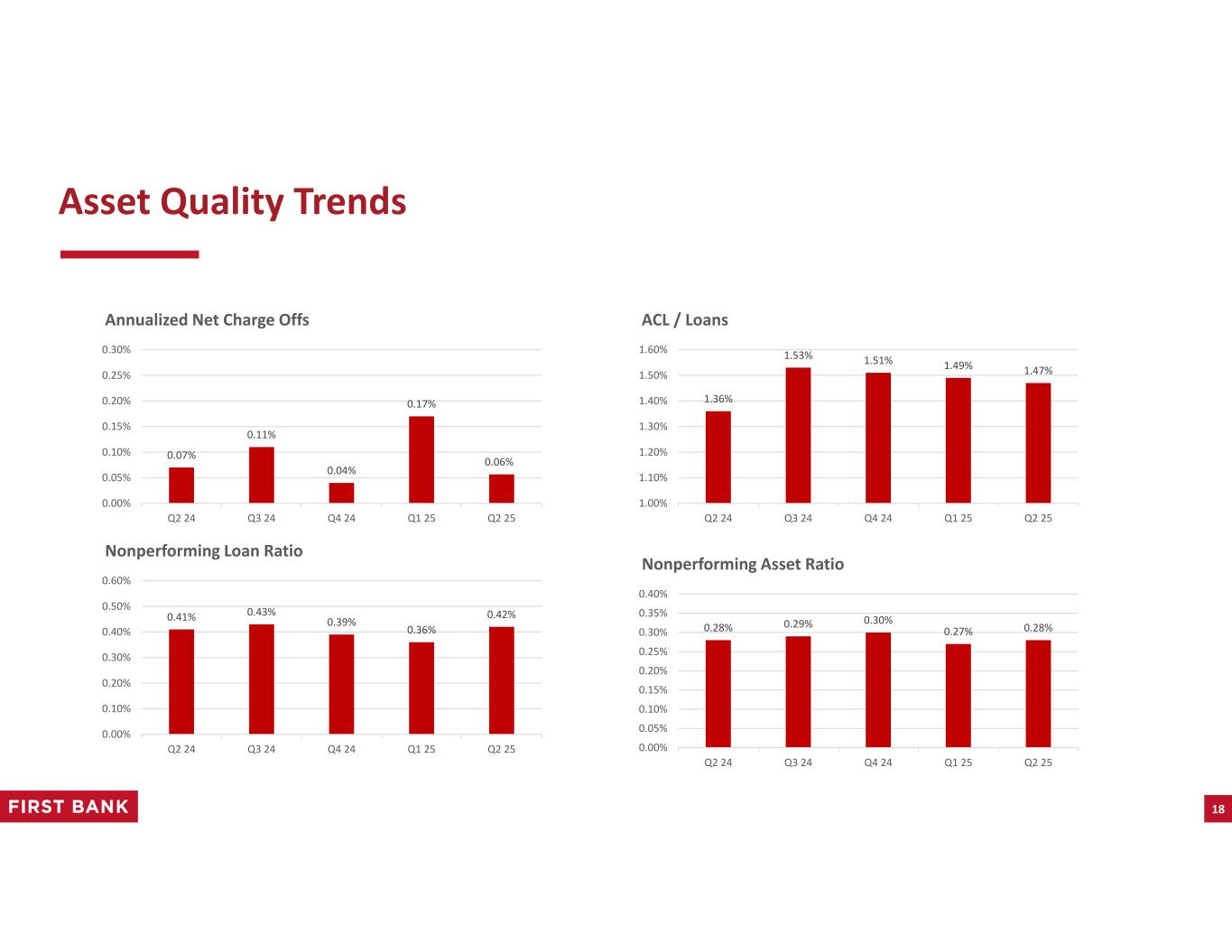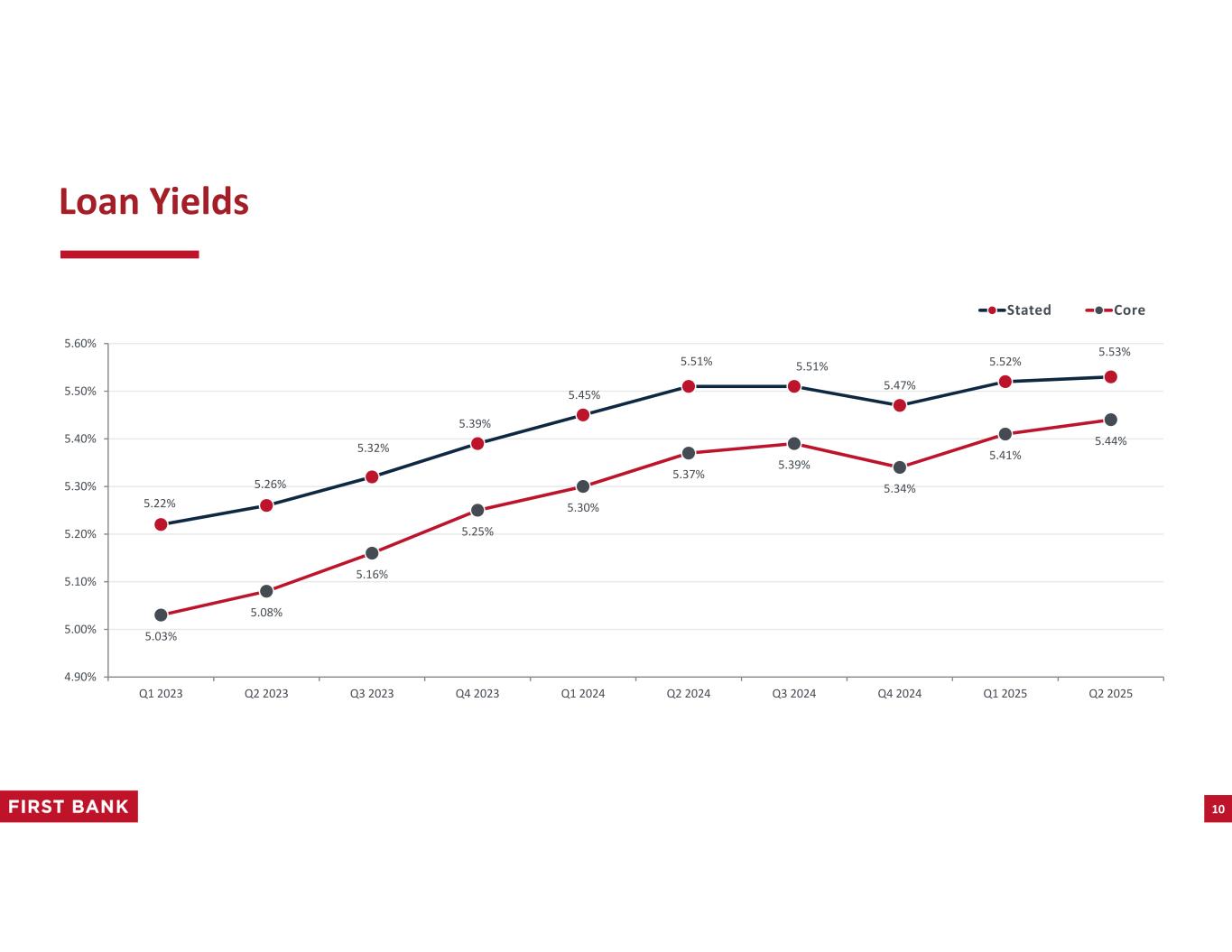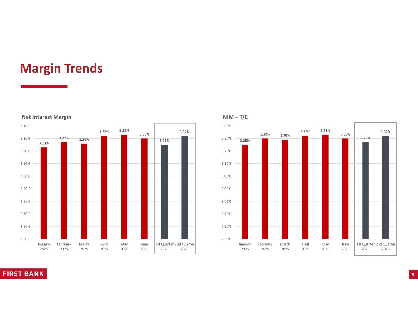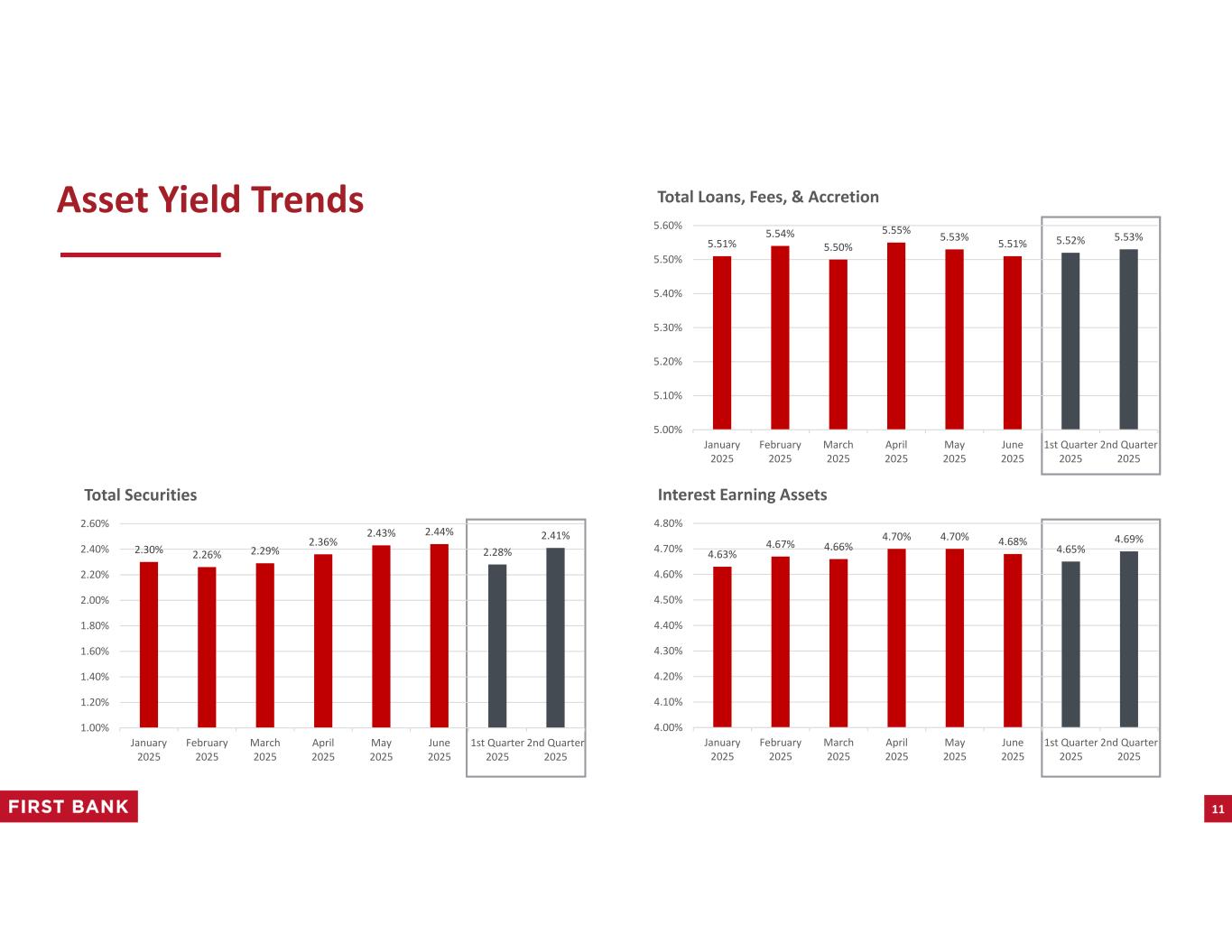 •Total loan yield expanded to 5.53%, up 1 basis point from the linked quarter and 3 basis points from the like quarter. Total cost of funds contracted 3 basis points to 1.48% for the quarter ended June 30, 2025 from 1.51% for the linked quarter and from 1.81% for the like quarter.