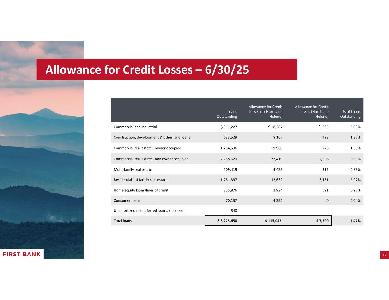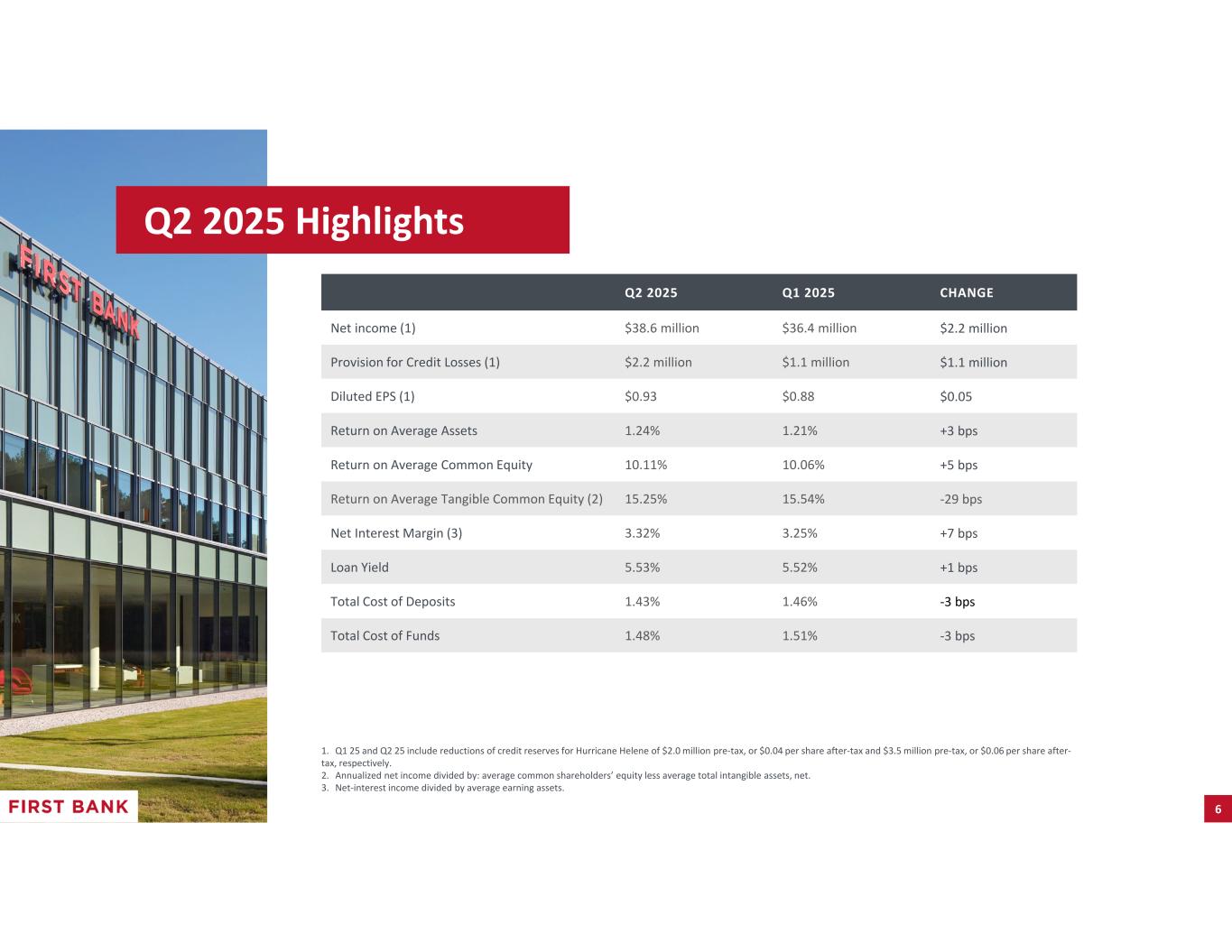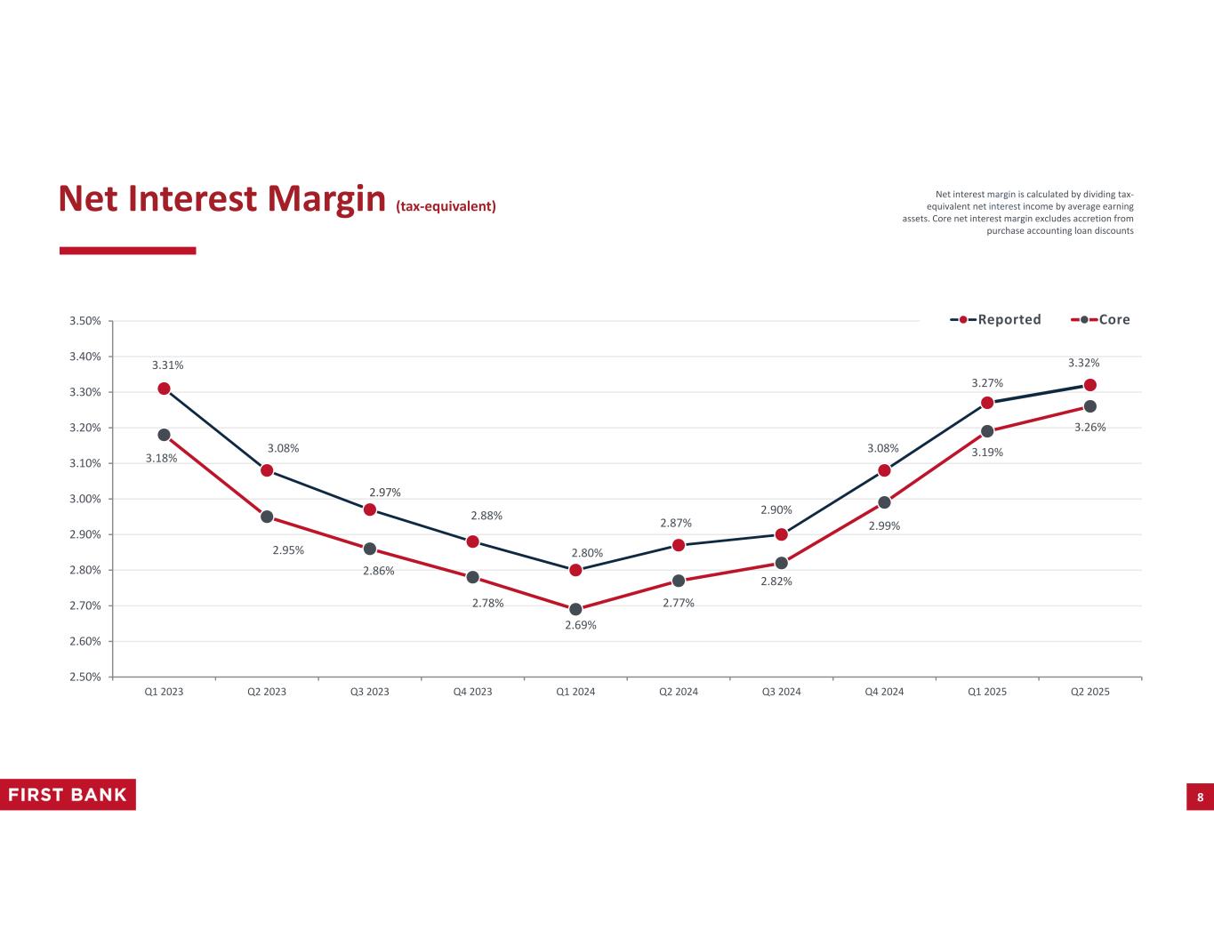 •Total loan yield expanded to 5.53%, up 1 basis point from the linked quarter and 3 basis points from the like quarter. Total cost of funds contracted 3 basis points to 1.48% for the quarter ended June 30, 2025 from 1.51% for the linked quarter and from 1.81% for the like quarter.