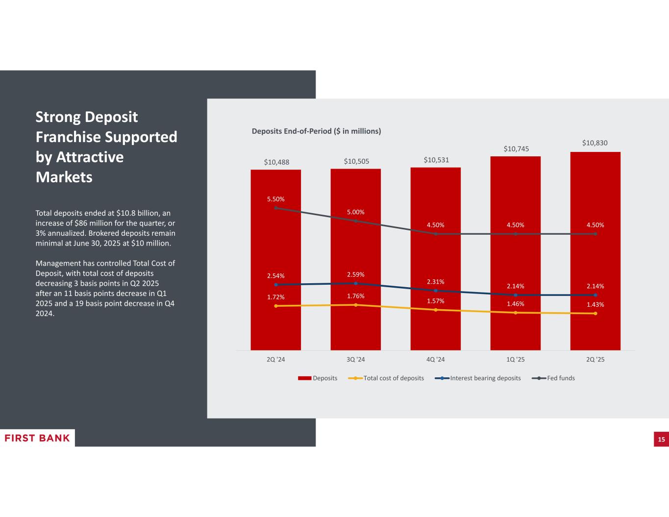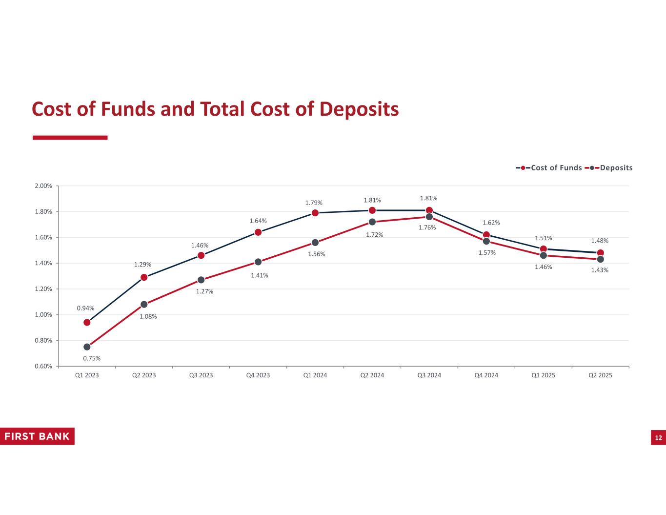 •Average core deposits were $10.7 billion for the second quarter of 2025, an increase of $140.4 million from the linked quarter, with $147.0 million of growth in noninterest bearing deposits and $21.3 million of growth in average money market accounts, partially offset by a decline of $30.7 million in average time deposits. Total cost of deposits was 1.43%, a decrease of 3 basis points from 1.46% for the linked quarter and 29 basis points from the like quarter at 1.72%. The Company continues to maintain a low level of wholesale funding with average borrowings of $92.2 million for the quarter ended June 30, 2025.