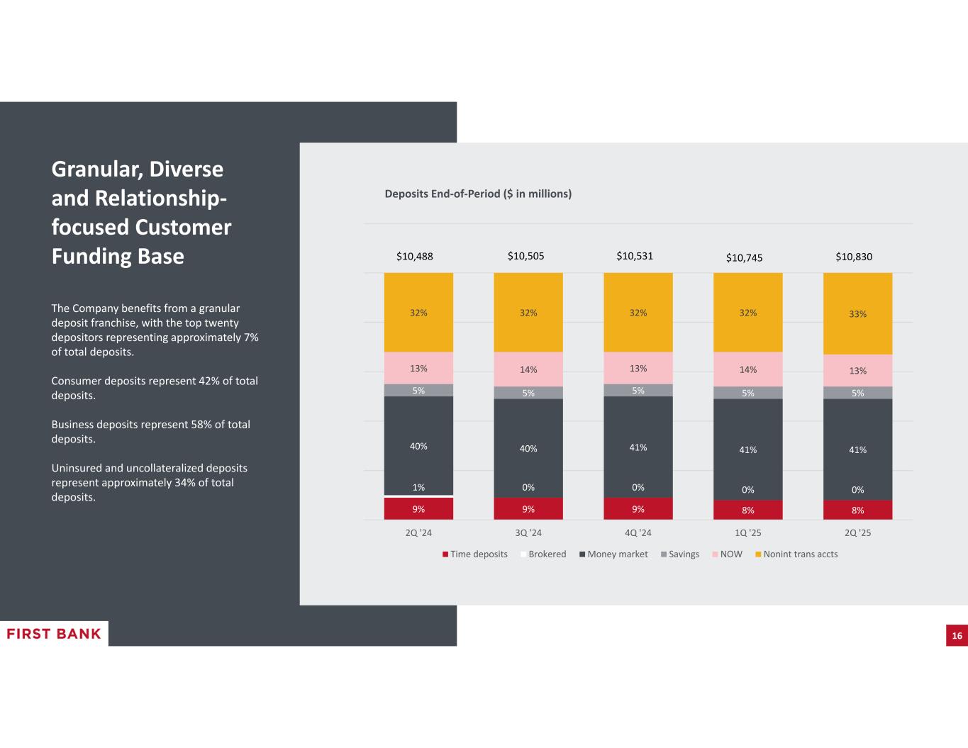 •Noninterest-bearing demand deposits were $3.5 billion, representing 33% of total deposits at June 30, 2025. During the second quarter of 2025, customer deposits grew $85.6 million driven by increases of $65.8 million in noninterest bearing deposits and $60.0 million in money market accounts.