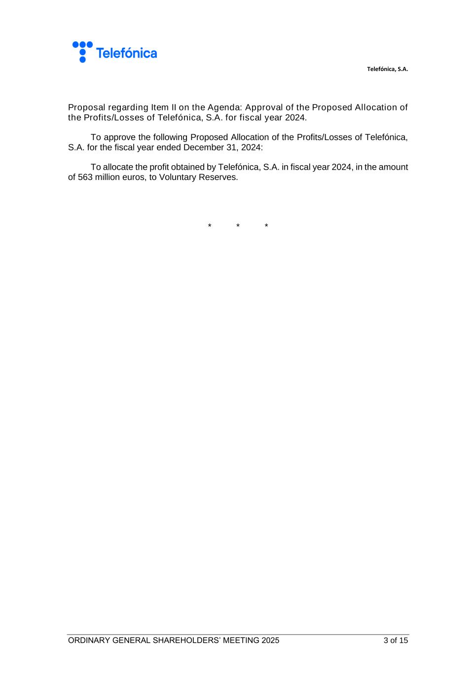 Telefónica, S.A. ORDINARY GENERAL SHAREHOLDERS’ MEETING 2025 3 of 15 Proposal regarding Item II on the Agenda: Approval of the Proposed Allocation of the Profits/Losses of Telefónica, S.A. for fiscal year 2024. To approve the following Proposed Allocation of the Profits/Losses of Telefónica, S.A. for the fiscal year ended December 31, 2024: To allocate the profit obtained by Telefónica, S.A. in fiscal year 2024, in the amount of 563 million euros, to Voluntary Reserves. * * *