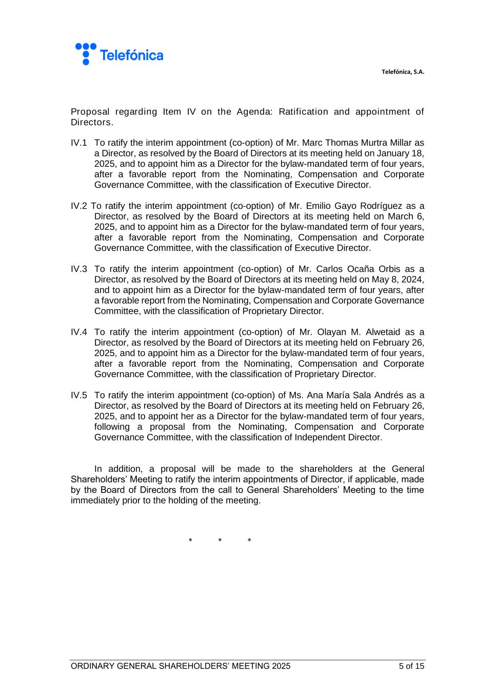 Telefónica, S.A. ORDINARY GENERAL SHAREHOLDERS’ MEETING 2025 5 of 15 Proposal regarding Item IV on the Agenda: Ratification and appointment of Directors. IV.1 To ratify the interim appointment (co-option) of Mr. Marc Thomas Murtra Millar as a Director, as resolved by the Board of Directors at its meeting held on January 18, 2025, and to appoint him as a Director for the bylaw-mandated term of four years, after a favorable report from the Nominating, Compensation and Corporate Governance Committee, with the classification of Executive Director. IV.2 To ratify the interim appointment (co-option) of Mr. Emilio Gayo Rodríguez as a Director, as resolved by the Board of Directors at its meeting held on March 6, 2025, and to appoint him as a Director for the bylaw-mandated term of four years, after a favorable report from the Nominating, Compensation and Corporate Governance Committee, with the classification of Executive Director. IV.3 To ratify the interim appointment (co-option) of Mr. Carlos Ocaña Orbis as a Director, as resolved by the Board of Directors at its meeting held on May 8, 2024, and to appoint him as a Director for the bylaw-mandated term of four years, after a favorable report from the Nominating, Compensation and Corporate Governance Committee, with the classification of Proprietary Director. IV.4 To ratify the interim appointment (co-option) of Mr. Olayan M. Alwetaid as a Director, as resolved by the Board of Directors at its meeting held on February 26, 2025, and to appoint him as a Director for the bylaw-mandated term of four years, after a favorable report from the Nominating, Compensation and Corporate Governance Committee, with the classification of Proprietary Director. IV.5 To ratify the interim appointment (co-option) of Ms. Ana María Sala Andrés as a Director, as resolved by the Board of Directors at its meeting held on February 26, 2025, and to appoint her as a Director for the bylaw-mandated term of four years, following a proposal from the Nominating, Compensation and Corporate Governance Committee, with the classification of Independent Director. In addition, a proposal will be made to the shareholders at the General Shareholders’ Meeting to ratify the interim appointments of Director, if applicable, made by the Board of Directors from the call to General Shareholders’ Meeting to the time immediately prior to the holding of the meeting. * * *