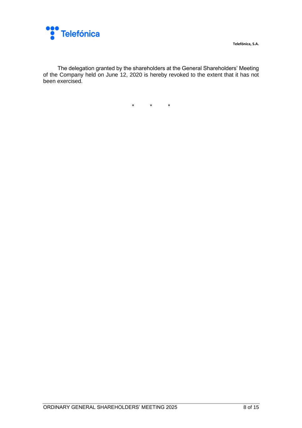 Telefónica, S.A. ORDINARY GENERAL SHAREHOLDERS’ MEETING 2025 8 of 15 The delegation granted by the shareholders at the General Shareholders’ Meeting of the Company held on June 12, 2020 is hereby revoked to the extent that it has not been exercised. * * *