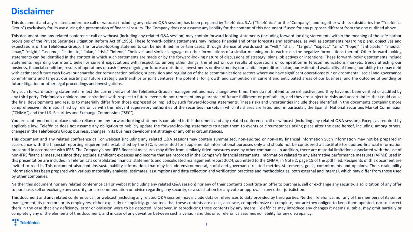 ***Este documento está clasificado como USO INTERNO por TELEFÓNICA. ***This document is classified as INTERNAL USE by TELEFÓNICA. Disclaimer This document and any related conference call or webcast (including any related Q&A session) has been prepared by Telefónica, S.A. (“Telefónica” or the “Company”, and together with its subsidiaries the “Telefónica Group”) exclusively for its use during the presentation of financial results. The Company does not assume any liability for the content of this document if used for any purposes different from the one outlined above. This document and any related conference call or webcast (including any related Q&A session) may contain forward-looking statements (including forward-looking statements within the meaning of the safe-harbor provisions of the Private Securities Litigation Reform Act of 1995). These forward-looking statements may include financial and other forecasts and estimates, as well as statements regarding plans, objectives and expectations of the Telefónica Group. The forward-looking statements can be identified, in certain cases, through the use of words such as “will,” “shall,” “target,” “expect,” “aim,” “hope,” “anticipate,” “should,” “may,” “might,” “assume,” “estimate,” “plan,” “risk,” “intend,” “believe” and similar language or other formulations of a similar meaning or, in each case, the negative formulations thereof. Other forward-looking statements can be identified in the context in which such statements are made or by the forward-looking nature of discussions of strategy, plans, objectives or intentions. These forward-looking statements include statements regarding our intent, belief or current expectations with respect to, among other things, the effect on our results of operations of competition in telecommunications markets; trends affecting our business, financial condition, results of operations or cash flows; ongoing or future acquisitions, investments or divestments; our capital expenditures plan; our estimated availability of funds; our ability to repay debt with estimated future cash flows; our shareholder remuneration policies; supervision and regulation of the telecommunications sectors where we have significant operations; our environmental, social and governance commitments and targets; our existing or future strategic partnerships or joint ventures; the potential for growth and competition in current and anticipated areas of our business; and the outcome of pending or future litigation or other legal proceedings and investigations. Any such forward-looking statements reflect the current views of the Telefónica Group’s management and may change over time. They do not intend to be exhaustive, and they have not been verified or audited by any third party. Telefónica's opinions and aspirations with respect to future events do not represent any guarantee of future fulfilment or profitability, and they are subject to risks and uncertainties that could cause the final developments and results to materially differ from those expressed or implied by such forward-looking statements. These risks and uncertainties include those identified in the documents containing more comprehensive information filed by Telefónica with the relevant supervisory authorities of the securities markets in which its shares are listed and, in particular, the Spanish National Securities Market Commission (“CNMV”) and the U.S. Securities and Exchange Commission (“SEC”). You are cautioned not to place undue reliance on any forward-looking statements contained in this document and any related conference call or webcast (including any related Q&A session). Except as required by applicable law, Telefónica does not assume any obligation to publicly update the forward-looking statements to adapt them to events or circumstances taking place after the date hereof, including, among others, changes in the Telefónica’s Group business, changes in its business development strategy or any other circumstances. This document and any related conference call or webcast (including any related Q&A session) may contain summarised, non-audited or non-IFRS financial information Such information may not be prepared in accordance with the financial reporting requirements established by the SEC, is presented for supplemental informational purposes only and should not be considered a substitute for audited financial information presented in accordance with IFRS. The Company’s non-IFRS financial measures may differ from similarly titled measures used by other companies. In addition, there are material limitations associated with the use of non-IFRS financial measures since they exclude significant expenses and income that are recorded in the Company’s financial statements. Information related to any alternative performance measures (APMs) used in this presentation are included in Telefónica’s consolidated financial statements and consolidated management report 2024, submitted to the CNMV, in Note 2, page 15 of the .pdf filed. Recipients of this document are invited to read it. This document also contains sustainability information, that may include environmental, social and governance-related metrics, statements, goals, commitments and opinions. The sustainability information has been prepared with various materiality analyses, estimates, assumptions and data collection and verification practices and methodologies, both external and internal, which may differ from those used by other companies. Neither this document nor any related conference call or webcast (including any related Q&A session) nor any of their contents constitute an offer to purchase, sell or exchange any security, a solicitation of any offer to purchase, sell or exchange any security, or a recommendation or advice regarding any security, or a solicitation for any vote or approval in any other jurisdict