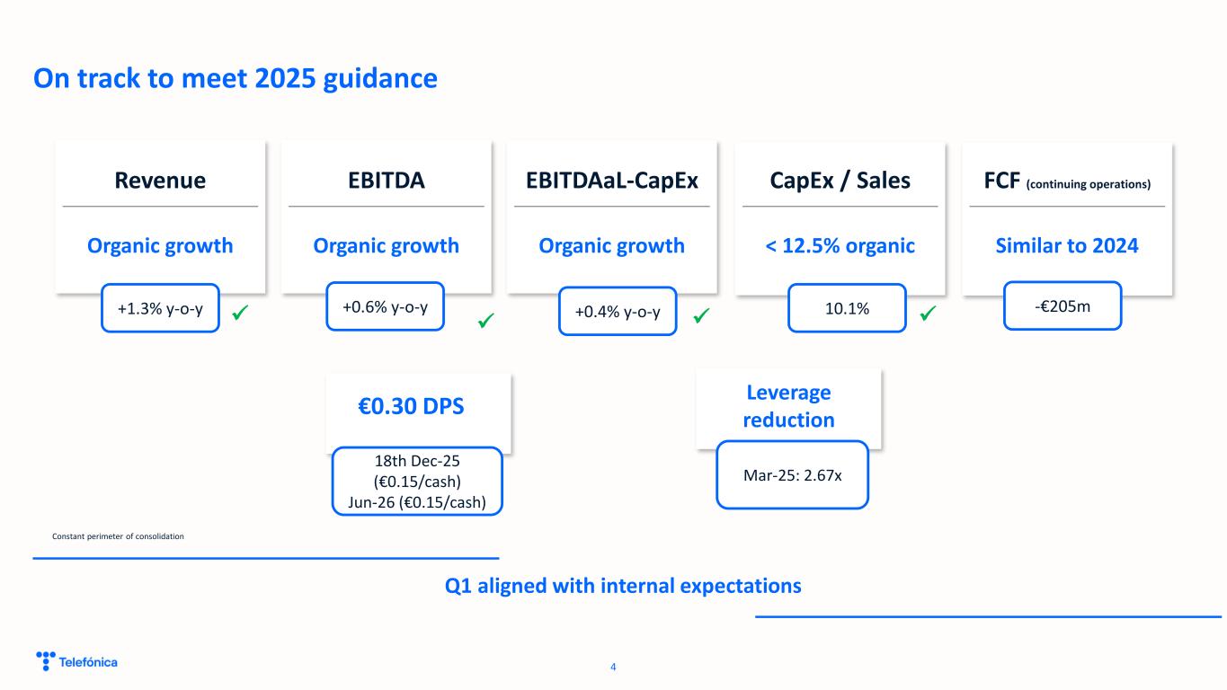 ***Este documento está clasificado como USO INTERNO por TELEFÓNICA. ***This document is classified as INTERNAL USE by TELEFÓNICA. On track to meet 2025 guidance Revenue EBITDA EBITDAaL-CapEx CapEx / Sales FCF (continuing operations) Organic growth Organic growth Organic growth < 12.5% organic Similar to 2024 €0.30 DPS Leverage reduction Q1 aligned with internal expectations 18th Dec-25 (€0.15/cash) Jun-26 (€0.15/cash) Mar-25: 2.67x +1.3% y-o-y +0.6% y-o-y +0.4% y-o-y 10.1% -€205m ✓ ✓✓ ✓ Constant perimeter of consolidation 4