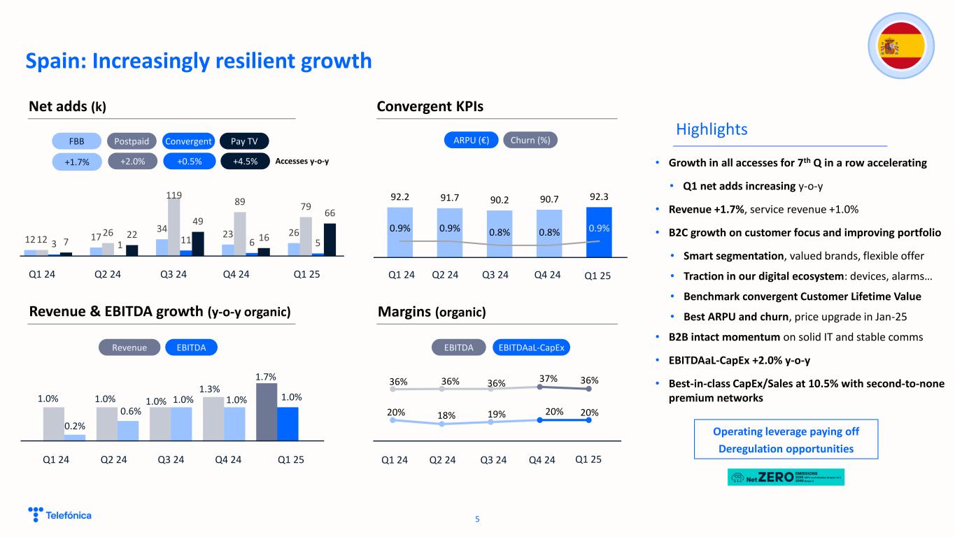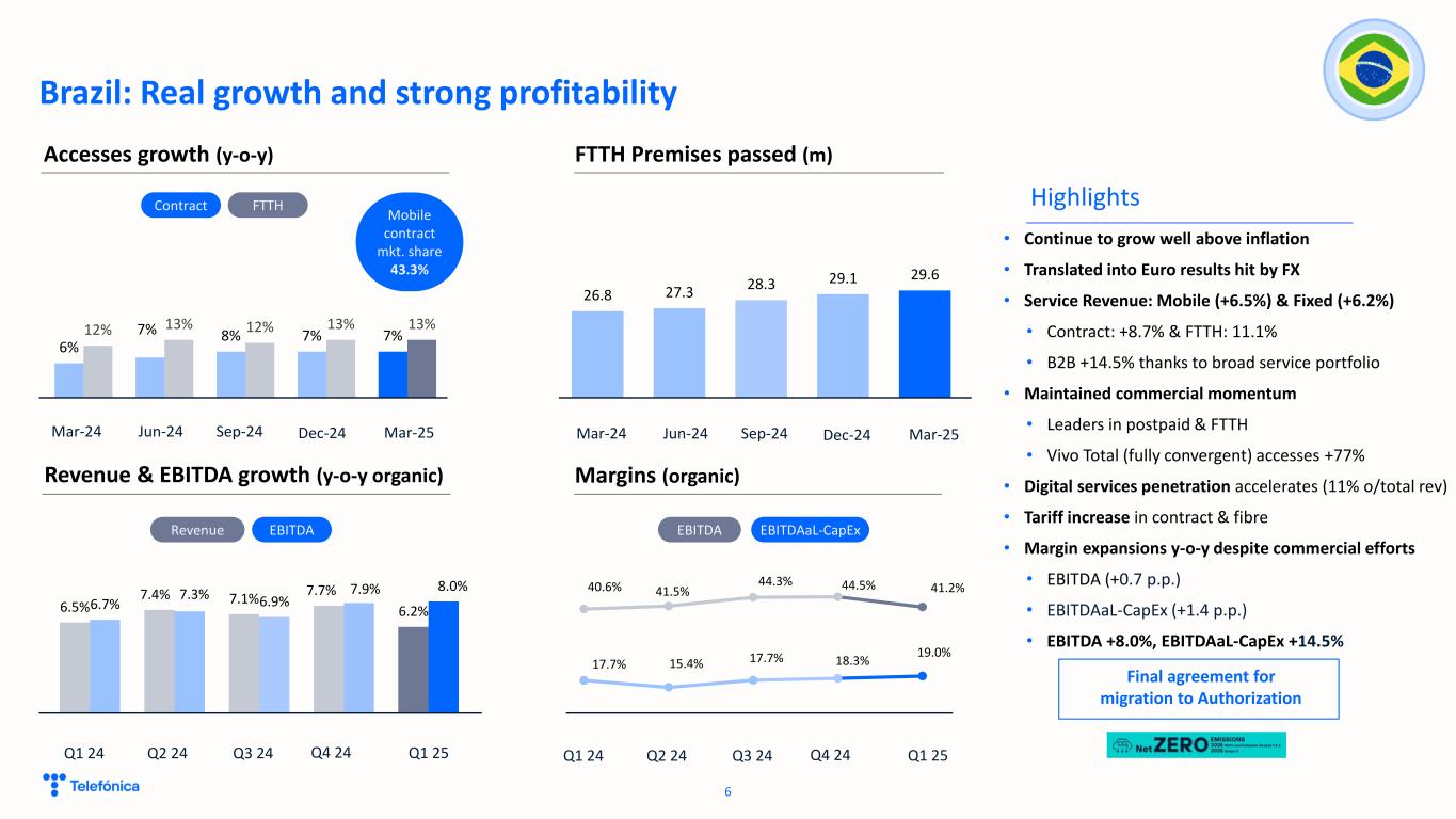 ***Este documento está clasificado como USO INTERNO por TELEFÓNICA. ***This document is classified as INTERNAL USE by TELEFÓNICA. Brazil: Real growth and strong profitability • Continue to grow well above inflation • Translated into Euro results hit by FX • Service Revenue: Mobile (+6.5%) & Fixed (+6.2%) • Contract: +8.7% & FTTH: 11.1% • B2B +14.5% thanks to broad service portfolio • Maintained commercial momentum • Leaders in postpaid & FTTH • Vivo Total (fully convergent) accesses +77% • Digital services penetration accelerates (11% o/total rev) • Tariff increase in contract & fibre • Margin expansions y-o-y despite commercial efforts • EBITDA (+0.7 p.p.) • EBITDAaL-CapEx (+1.4 p.p.) • EBITDA +8.0%, EBITDAaL-CapEx +14.5% Accesses growth (y-o-y) 6% 7% 8% 7% 7%12% 13% 12% 13% 13% FTTHContract Mar-24 40.6% 41.5% 44.3% 44.5% 41.2% 17.7% 15.4% 17.7% 18.3% 19.0% Mobile contract mkt. share 43.3% Final agreement for migration to Authorization Jun-24 FTTH Premises passed (m) 26.8 27.3 28.3 29.1 29.6 6.5% 7.4% 7.1% 7.7% 6.2%6.7% 7.3% 6.9% 7.9% 8.0% Q1 24 Q2 24 Sep-24 Q3 24 Dec-24 Q4 24 Mar-25 Mar-24 Jun-24 Sep-24 Dec-24 Mar-25 Q1 25 Q1 24 Q2 24 Q3 24 Q4 24 Q1 25 Margins (organic) Revenue & EBITDA growth (y-o-y organic) EBITDAaL-CapExEBITDARevenue EBITDA Highlights 6