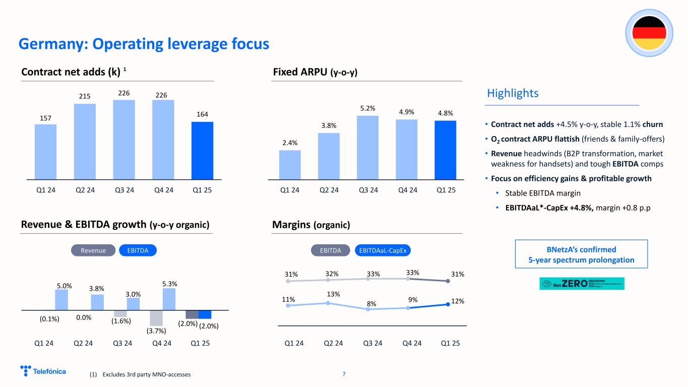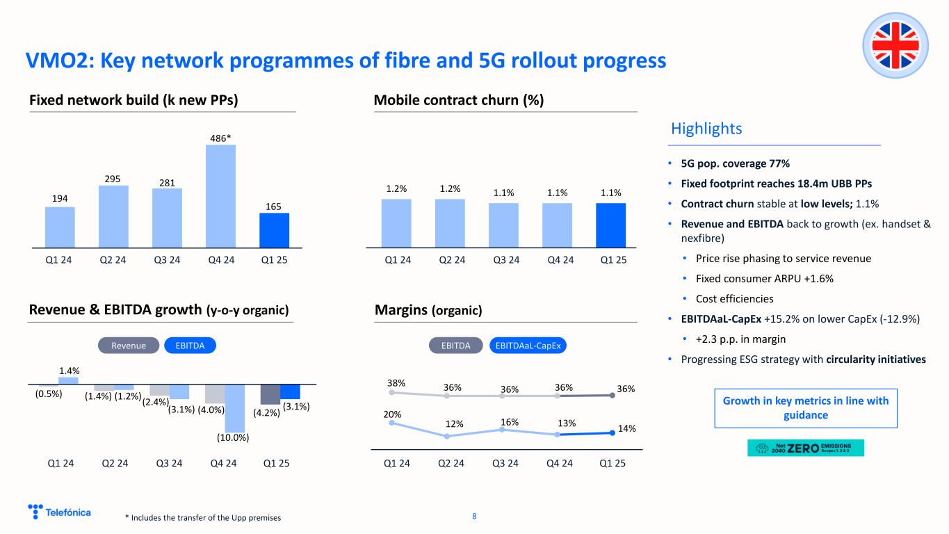 ***Este documento está clasificado como USO INTERNO por TELEFÓNICA. ***This document is classified as INTERNAL USE by TELEFÓNICA. (0.1%) 0.0% (1.6%) (3.7%) (2.0%) 5.0% 3.8% 3.0% 5.3% (2.0%) Contract net adds (k) 1 157 215 226 226 164 Germany: Operating leverage focus • Contract net adds +4.5% y-o-y, stable 1.1% churn • O2 contract ARPU flattish (friends & family-offers) • Revenue headwinds (B2P transformation, market weakness for handsets) and tough EBITDA comps • Focus on efficiency gains & profitable growth • Stable EBITDA margin • EBITDAaL*-CapEx +4.8%, margin +0.8 p.p Highlights Fixed ARPU (y-o-y) 2.4% 3.8% 5.2% 4.9% 4.8% 31% 32% 33% 33% 31% 11% 13% 8% 9% 12% (1) Excludes 3rd party MNO-accesses Q4 24Q1 24 Q3 24 Q1 25Q2 24 Q4 24Q1 24 Q3 24 Q1 25Q2 24 Q4 24Q1 24 Q3 24 Q1 25Q2 24Q4 24Q1 24 Q3 24 Q1 25Q2 24 BNetzA’s confirmed 5-year spectrum prolongation Margins (organic) Revenue & EBITDA growth (y-o-y organic) EBITDAaL-CapExEBITDARevenue EBITDA 7