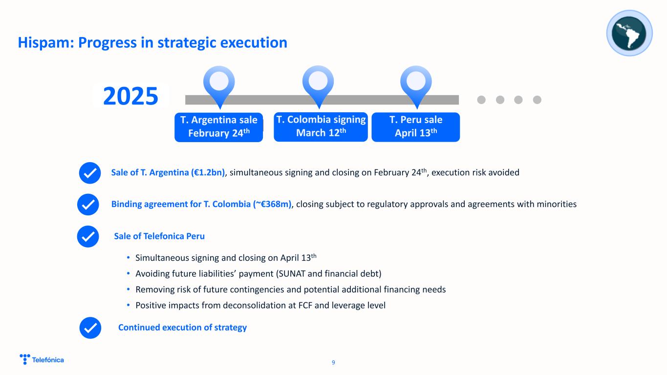 ***Este documento está clasificado como USO INTERNO por TELEFÓNICA. ***This document is classified as INTERNAL USE by TELEFÓNICA. Hispam: Progress in strategic execution Sale of T. Argentina (€1.2bn), simultaneous signing and closing on February 24th, execution risk avoided Binding agreement for T. Colombia (~€368m), closing subject to regulatory approvals and agreements with minorities Sale of Telefonica Peru • Simultaneous signing and closing on April 13th • Avoiding future liabilities’ payment (SUNAT and financial debt) • Removing risk of future contingencies and potential additional financing needs • Positive impacts from deconsolidation at FCF and leverage level Continued execution of strategy 2025 T. Argentina sale February 24th T. Colombia signing March 12th T. Peru sale April 13th 9