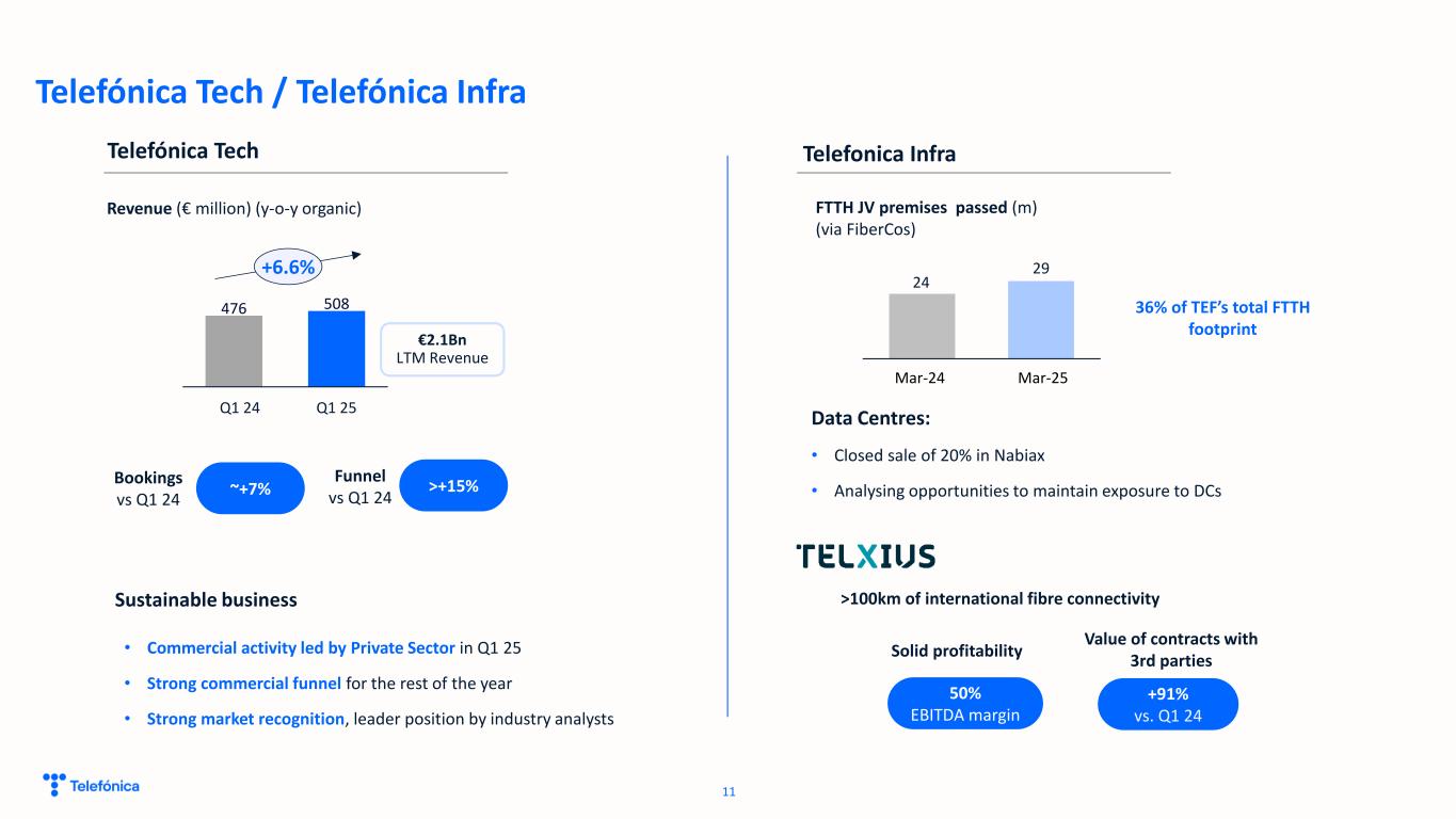 ***Este documento está clasificado como USO INTERNO por TELEFÓNICA. ***This document is classified as INTERNAL USE by TELEFÓNICA. Telefónica Tech / Telefónica Infra Telefónica Tech Revenue (€ million) (y-o-y organic) +6.6% 476 508 Q1 24 Q1 25 €2.1Bn LTM Revenue ~+7% Bookings vs Q1 24 Funnel vs Q1 24 >+15% • Commercial activity led by Private Sector in Q1 25 • Strong commercial funnel for the rest of the year • Strong market recognition, leader position by industry analysts Sustainable business 24 29 Mar-24 Mar-25 FTTH JV premises passed (m) (via FiberCos) Telefonica Infra >100km of international fibre connectivity 50% EBITDA margin Solid profitability Value of contracts with 3rd parties +91% vs. Q1 24 36% of TEF’s total FTTH footprint Data Centres: • Closed sale of 20% in Nabiax • Analysing opportunities to maintain exposure to DCs 11