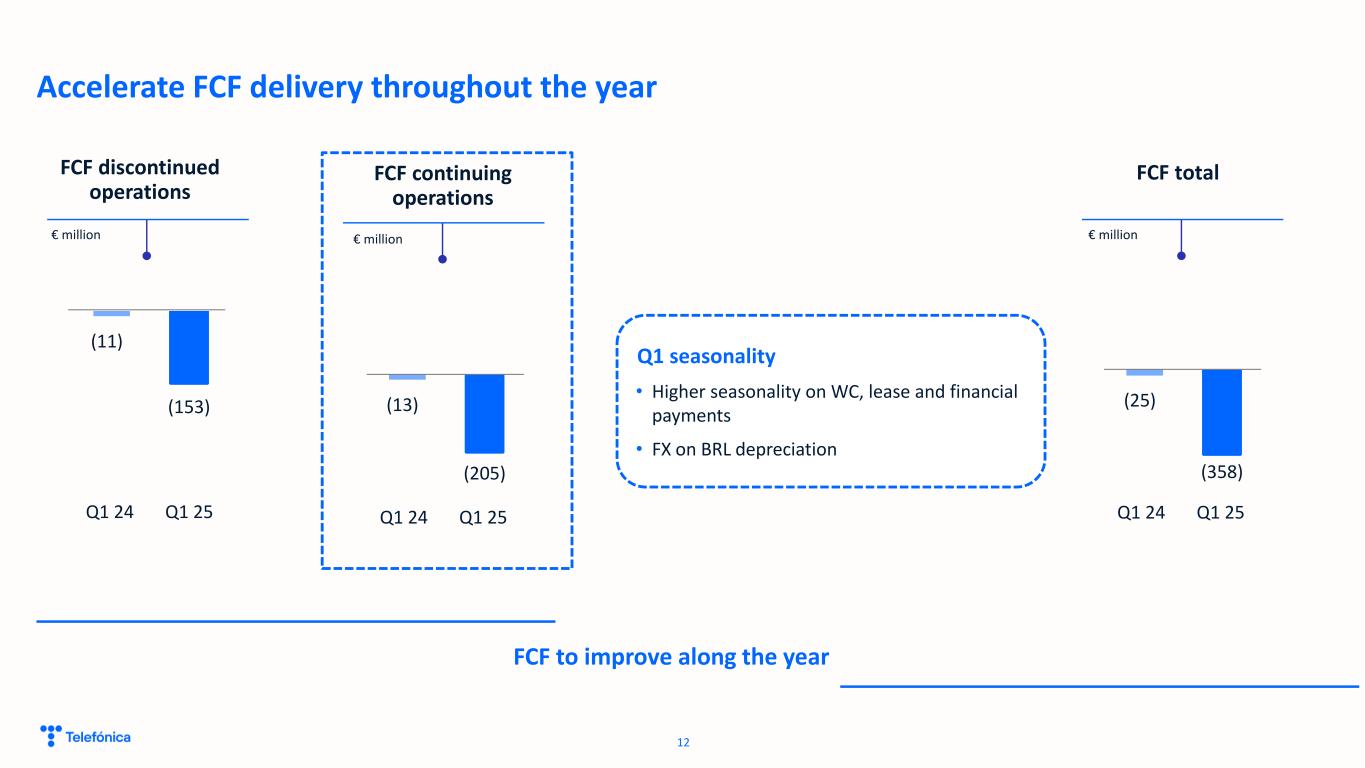***Este documento está clasificado como USO INTERNO por TELEFÓNICA. ***This document is classified as INTERNAL USE by TELEFÓNICA. Accelerate FCF delivery throughout the year 12 FCF totalFCF continuing operations FCF discontinued operations FCF to improve along the year (25) (358) Q1 24 Q1 25 (13) (205) Q1 24 Q1 25Q1 24 Q1 25 Q1 seasonality • Higher seasonality on WC, lease and financial payments • FX on BRL depreciation (11) (153) € million € million € million
