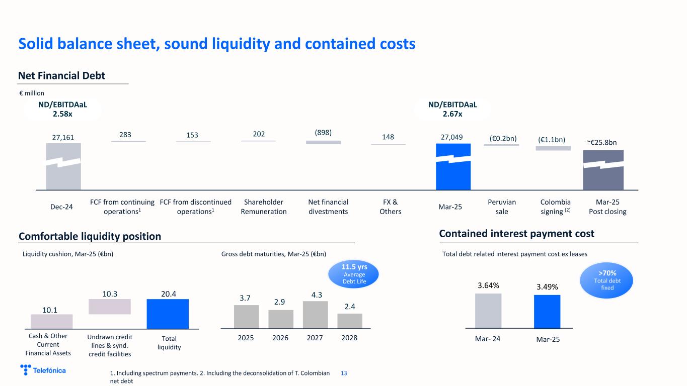 ***Este documento está clasificado como USO INTERNO por TELEFÓNICA. ***This document is classified as INTERNAL USE by TELEFÓNICA. 3.64% 3.49% Net Financial Debt € million 27,161 283 202 Solid balance sheet, sound liquidity and contained costs ND/EBITDAaL 2.67x Dec-24 FCF from continuing operations1 Mar-25 FX & Others Net financial divestments Shareholder Remuneration 27,049 (898) 148 ND/EBITDAaL 2.58x Comfortable liquidity position Liquidity cushion, Mar-25 (€bn) 3.7 2.9 4.3 2.4 20262025 2027 2028 Gross debt maturities, Mar-25 (€bn) Total debt related interest payment cost ex leases Contained interest payment cost Mar- 24 Mar-25 >70% Total debt fixed 11.5 yrs Average Debt Life Mar-25 Post closing 1. Including spectrum payments. 2. Including the deconsolidation of T. Colombian net debt ~€25.8bn FCF from discontinued operations1 153 13 10.1 10.3 Undrawn credit lines & synd. credit facilities Total liquidity 20.4 Cash & Other Current Financial Assets Peruvian sale Colombia signing (2) (€0.2bn) (€1.1bn)