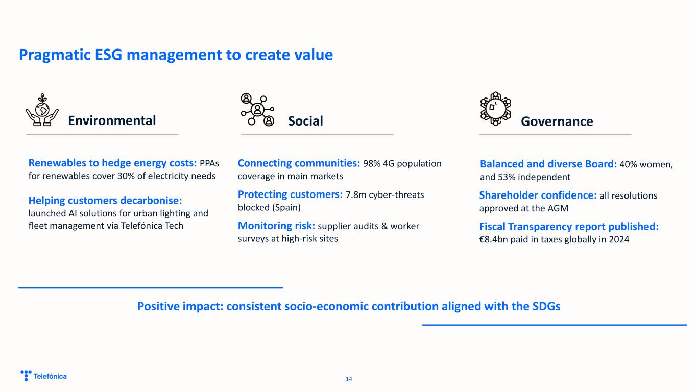 ***Este documento está clasificado como USO INTERNO por TELEFÓNICA. ***This document is classified as INTERNAL USE by TELEFÓNICA. Pragmatic ESG management to create value Environmental Renewables to hedge energy costs: PPAs for renewables cover 30% of electricity needs Helping customers decarbonise: launched AI solutions for urban lighting and fleet management via Telefónica Tech Social Connecting communities: 98% 4G population coverage in main markets Protecting customers: 7.8m cyber-threats blocked (Spain) Monitoring risk: supplier audits & worker surveys at high-risk sites Governance Balanced and diverse Board: 40% women, and 53% independent Shareholder confidence: all resolutions approved at the AGM Fiscal Transparency report published: €8.4bn paid in taxes globally in 2024 Positive impact: consistent socio-economic contribution aligned with the SDGs 14