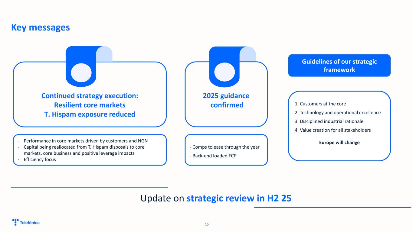 ***Este documento está clasificado como USO INTERNO por TELEFÓNICA. ***This document is classified as INTERNAL USE by TELEFÓNICA. Key messages Continued strategy execution: Resilient core markets T. Hispam exposure reduced Update on strategic review in H2 25 - Performance in core markets driven by customers and NGN - Capital being reallocated from T. Hispam disposals to core markets, core business and positive leverage impacts - Efficiency focus 2025 guidance confirmed - Comps to ease through the year - Back-end loaded FCF Guidelines of our strategic framework 1. Customers at the core 2. Technology and operational excellence 3. Disciplined industrial rationale 4. Value creation for all stakeholders Europe will change 15
