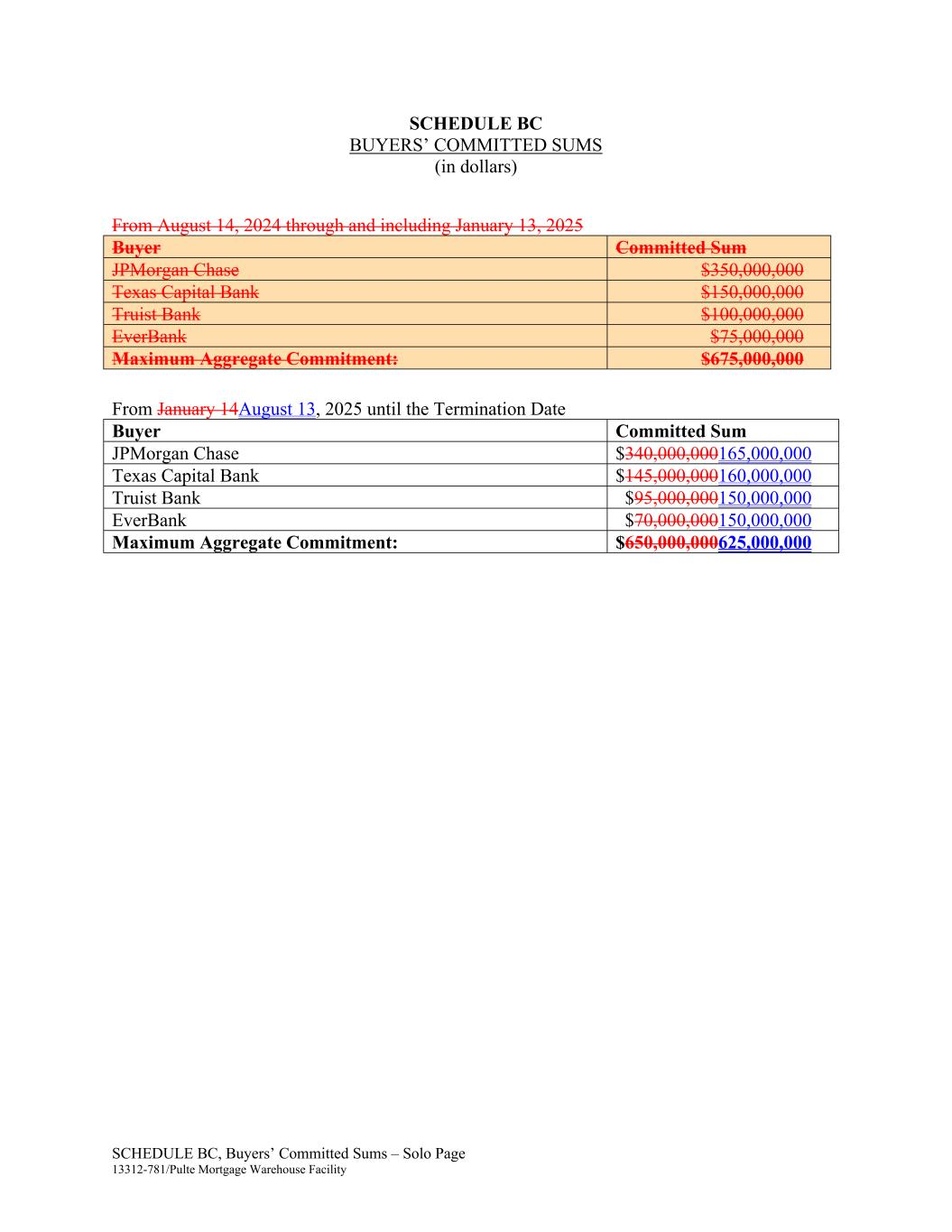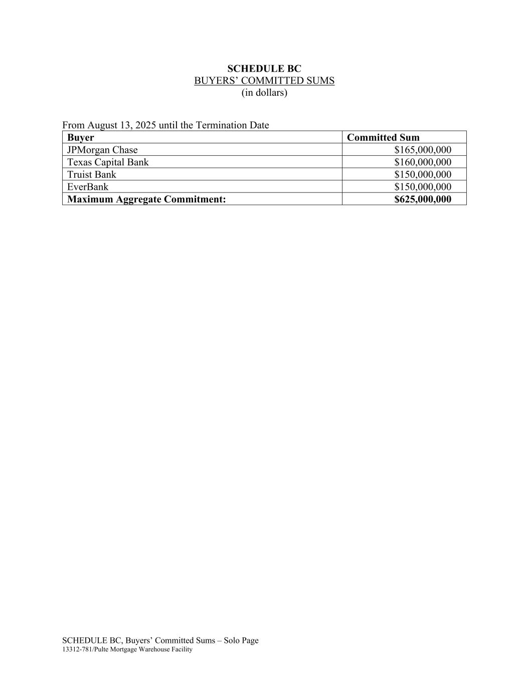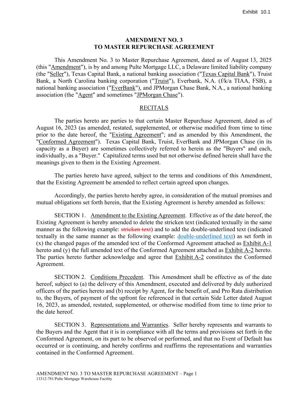 AMENDMENT NO. 3 TO MASTER REPURCHASE AGREEMENT – Page 1 13312-781/Pulte Mortgage Warehouse Facility AMENDMENT NO. 3 TO MASTER REPURCHASE AGREEMENT This Amendment No. 3 to Master Repurchase Agreement, dated as of August 13, 2025 (this "Amendment"), is by and among Pulte Mortgage LLC, a Delaware limited liability company (the "Seller"), Texas Capital Bank, a national banking association ("Texas Capital Bank"), Truist Bank, a North Carolina banking corporation ("Truist"), Everbank, N.A. (f/k/a TIAA, FSB), a national banking association ("EverBank"), and JPMorgan Chase Bank, N.A., a national banking association (the "Agent" and sometimes "JPMorgan Chase"). RECITALS The parties hereto are parties to that certain Master Repurchase Agreement, dated as of August 16, 2023 (as amended, restated, supplemented, or otherwise modified from time to time prior to the date hereof, the "Existing Agreement"; and as amended by this Amendment, the "Conformed Agreement"). Texas Capital Bank, Truist, EverBank and JPMorgan Chase (in its capacity as a Buyer) are sometimes collectively referred to herein as the "Buyers" and each, individually, as a "Buyer." Capitalized terms used but not otherwise defined herein shall have the meanings given to them in the Existing Agreement. The parties hereto have agreed, subject to the terms and conditions of this Amendment, that the Existing Agreement be amended to reflect certain agreed upon changes. Accordingly, the parties hereto hereby agree, in consideration of the mutual promises and mutual obligations set forth herein, that the Existing Agreement is hereby amended as follows: SECTION 1. Amendment to the Existing Agreement. Effective as of the date hereof, the Existing Agreement is hereby amended to delete the stricken text (indicated textually in the same manner as the following example: stricken text) and to add the double-underlined text (indicated textually in the same manner as the following example: double-underlined text) as set forth in (x) the changed pages of the amended text of the Conformed Agreement attached as Exhibit A-1 hereto and (y) the full amended text of the Conformed Agreement attached as Exhibit A-2 hereto. The parties hereto further acknowledge and agree that Exhibit A-2 constitutes the Conformed Agreement. SECTION 2. Conditions Precedent. This Amendment shall be effective as of the date hereof, subject to (a) the delivery of this Amendment, executed and delivered by duly authorized officers of the parties hereto and (b) receipt by Agent, for the benefit of, and Pro Rata distribution to, the Buyers, of payment of the upfront fee referenced in that certain Side Letter dated August 16, 2023, as amended, restated, supplemented, or otherwise modified from time to time prior to the date hereof. SECTION 3. Representations and Warranties. Seller hereby represents and warrants to the Buyers and the Agent that it is in compliance with all the terms and provisions set forth in the Conformed Agreement, on its part to be observed or performed, and that no Event of Default has occurred or is continuing, and hereby confirms and reaffirms the representations and warranties contained in the Conformed Agreement.