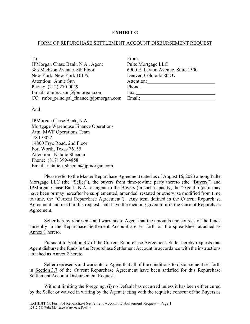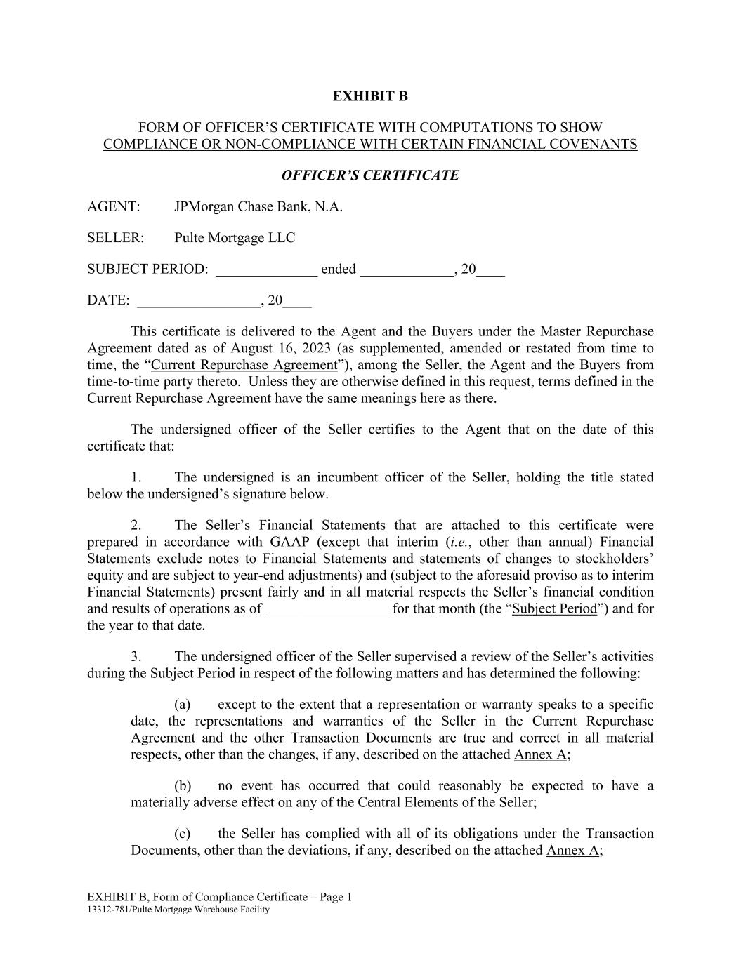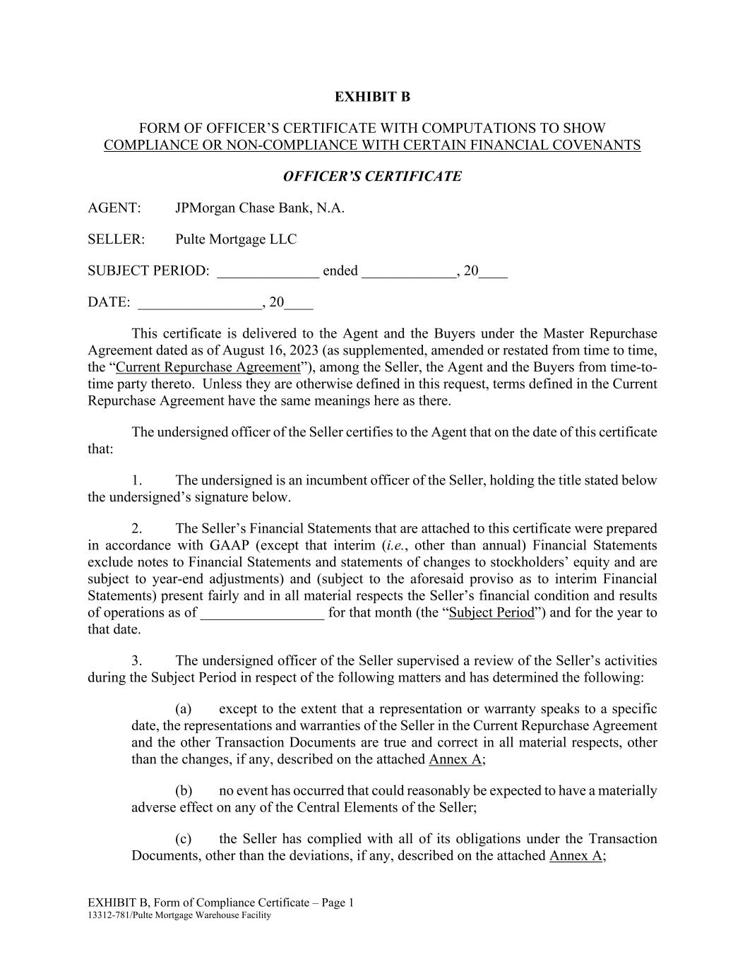 AMENDMENT NO. 3 TO MASTER REPURCHASE AGREEMENT – Page 1 13312-781/Pulte Mortgage Warehouse Facility AMENDMENT NO. 3 TO MASTER REPURCHASE AGREEMENT This Amendment No. 3 to Master Repurchase Agreement, dated as of August 13, 2025 (this "Amendment"), is by and among Pulte Mortgage LLC, a Delaware limited liability company (the "Seller"), Texas Capital Bank, a national banking association ("Texas Capital Bank"), Truist Bank, a North Carolina banking corporation ("Truist"), Everbank, N.A. (f/k/a TIAA, FSB), a national banking association ("EverBank"), and JPMorgan Chase Bank, N.A., a national banking association (the "Agent" and sometimes "JPMorgan Chase"). RECITALS The parties hereto are parties to that certain Master Repurchase Agreement, dated as of August 16, 2023 (as amended, restated, supplemented, or otherwise modified from time to time prior to the date hereof, the "Existing Agreement"; and as amended by this Amendment, the "Conformed Agreement"). Texas Capital Bank, Truist, EverBank and JPMorgan Chase (in its capacity as a Buyer) are sometimes collectively referred to herein as the "Buyers" and each, individually, as a "Buyer." Capitalized terms used but not otherwise defined herein shall have the meanings given to them in the Existing Agreement. The parties hereto have agreed, subject to the terms and conditions of this Amendment, that the Existing Agreement be amended to reflect certain agreed upon changes. Accordingly, the parties hereto hereby agree, in consideration of the mutual promises and mutual obligations set forth herein, that the Existing Agreement is hereby amended as follows: SECTION 1. Amendment to the Existing Agreement. Effective as of the date hereof, the Existing Agreement is hereby amended to delete the stricken text (indicated textually in the same manner as the following example: stricken text) and to add the double-underlined text (indicated textually in the same manner as the following example: double-underlined text) as set forth in (x) the changed pages of the amended text of the Conformed Agreement attached as Exhibit A-1 hereto and (y) the full amended text of the Conformed Agreement attached as Exhibit A-2 hereto. The parties hereto further acknowledge and agree that Exhibit A-2 constitutes the Conformed Agreement. SECTION 2. Conditions Precedent. This Amendment shall be effective as of the date hereof, subject to (a) the delivery of this Amendment, executed and delivered by duly authorized officers of the parties hereto and (b) receipt by Agent, for the benefit of, and Pro Rata distribution to, the Buyers, of payment of the upfront fee referenced in that certain Side Letter dated August 16, 2023, as amended, restated, supplemented, or otherwise modified from time to time prior to the date hereof. SECTION 3. Representations and Warranties. Seller hereby represents and warrants to the Buyers and the Agent that it is in compliance with all the terms and provisions set forth in the Conformed Agreement, on its part to be observed or performed, and that no Event of Default has occurred or is continuing, and hereby confirms and reaffirms the representations and warranties contained in the Conformed Agreement.