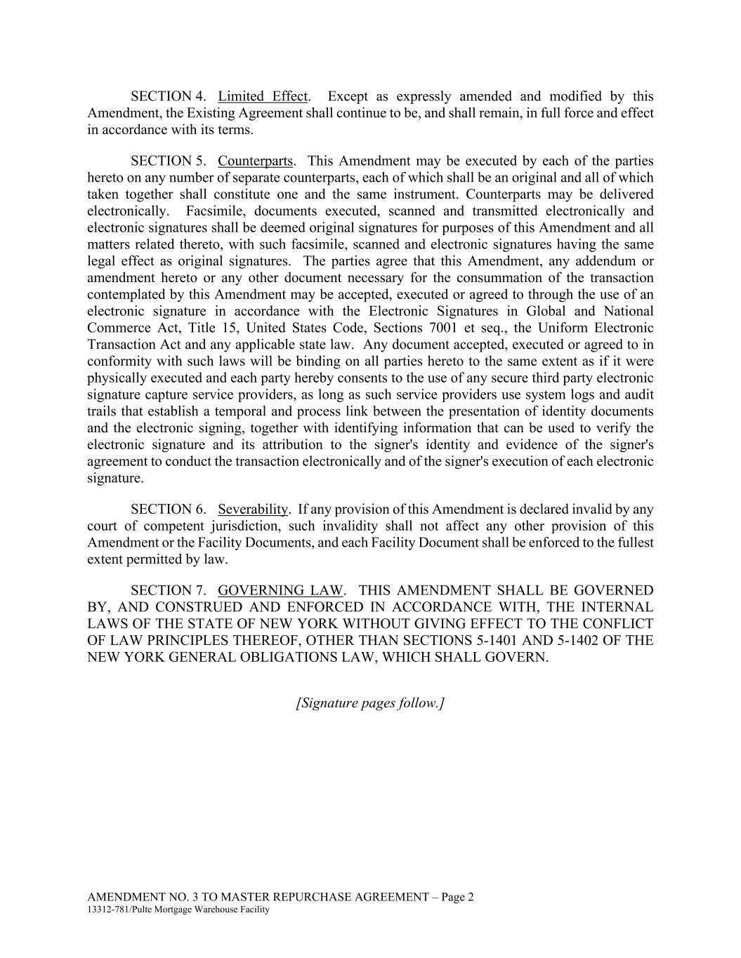 AMENDMENT NO. 3 TO MASTER REPURCHASE AGREEMENT – Page 2 13312-781/Pulte Mortgage Warehouse Facility SECTION 4. Limited Effect. Except as expressly amended and modified by this Amendment, the Existing Agreement shall continue to be, and shall remain, in full force and effect in accordance with its terms. SECTION 5. Counterparts. This Amendment may be executed by each of the parties hereto on any number of separate counterparts, each of which shall be an original and all of which taken together shall constitute one and the same instrument. Counterparts may be delivered electronically. Facsimile, documents executed, scanned and transmitted electronically and electronic signatures shall be deemed original signatures for purposes of this Amendment and all matters related thereto, with such facsimile, scanned and electronic signatures having the same legal effect as original signatures. The parties agree that this Amendment, any addendum or amendment hereto or any other document necessary for the consummation of the transaction contemplated by this Amendment may be accepted, executed or agreed to through the use of an electronic signature in accordance with the Electronic Signatures in Global and National Commerce Act, Title 15, United States Code, Sections 7001 et seq., the Uniform Electronic Transaction Act and any applicable state law. Any document accepted, executed or agreed to in conformity with such laws will be binding on all parties hereto to the same extent as if it were physically executed and each party hereby consents to the use of any secure third party electronic signature capture service providers, as long as such service providers use system logs and audit trails that establish a temporal and process link between the presentation of identity documents and the electronic signing, together with identifying information that can be used to verify the electronic signature and its attribution to the signer's identity and evidence of the signer's agreement to conduct the transaction electronically and of the signer's execution of each electronic signature. SECTION 6. Severability. If any provision of this Amendment is declared invalid by any court of competent jurisdiction, such invalidity shall not affect any other provision of this Amendment or the Facility Documents, and each Facility Document shall be enforced to the fullest extent permitted by law. SECTION 7. GOVERNING LAW. THIS AMENDMENT SHALL BE GOVERNED BY, AND CONSTRUED AND ENFORCED IN ACCORDANCE WITH, THE INTERNAL LAWS OF THE STATE OF NEW YORK WITHOUT GIVING EFFECT TO THE CONFLICT OF LAW PRINCIPLES THEREOF, OTHER THAN SECTIONS 5-1401 AND 5-1402 OF THE NEW YORK GENERAL OBLIGATIONS LAW, WHICH SHALL GOVERN. [Signature pages follow.]