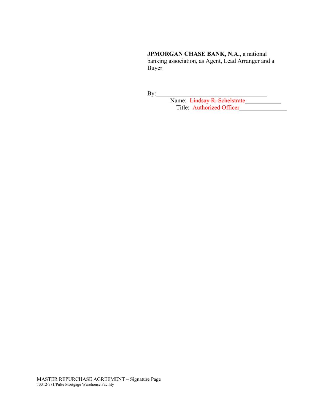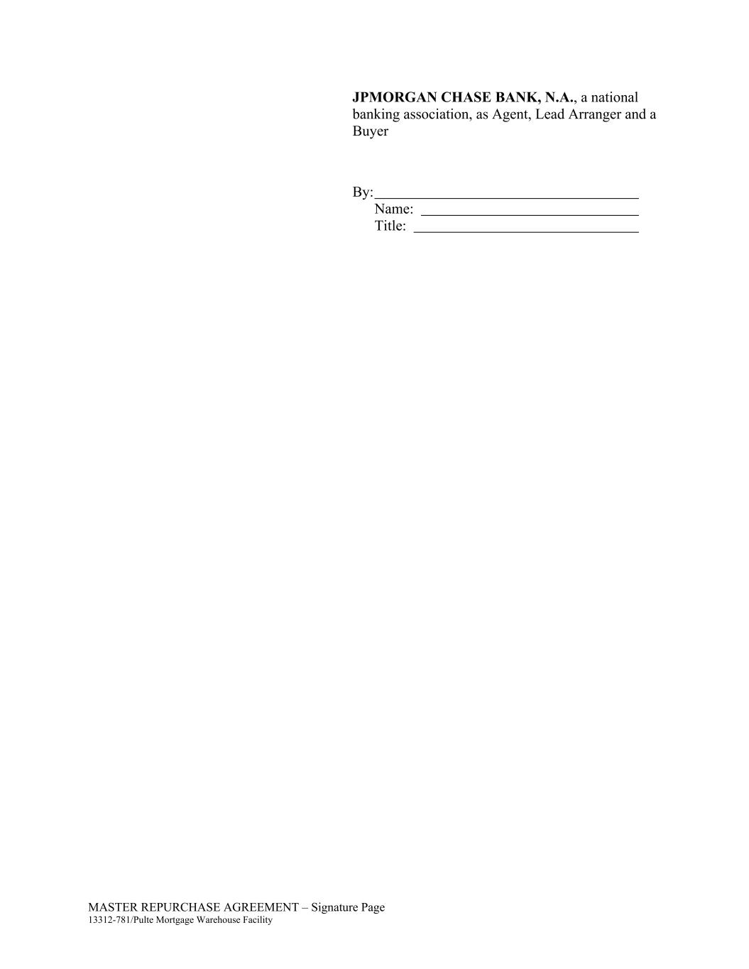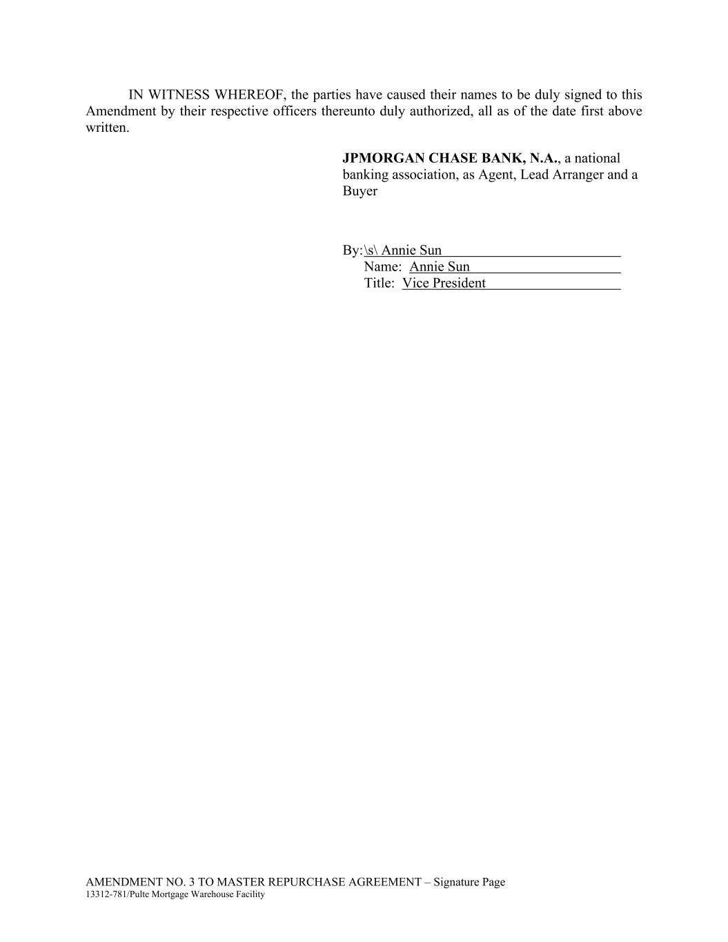 AMENDMENT NO. 3 TO MASTER REPURCHASE AGREEMENT – Signature Page 13312-781/Pulte Mortgage Warehouse Facility IN WITNESS WHEREOF, the parties have caused their names to be duly signed to this Amendment by their respective officers thereunto duly authorized, all as of the date first above written. JPMORGAN CHASE BANK, N.A., a national banking association, as Agent, Lead Arranger and a Buyer By: \s\ Annie Sun Name: Annie Sun Title: Vice President