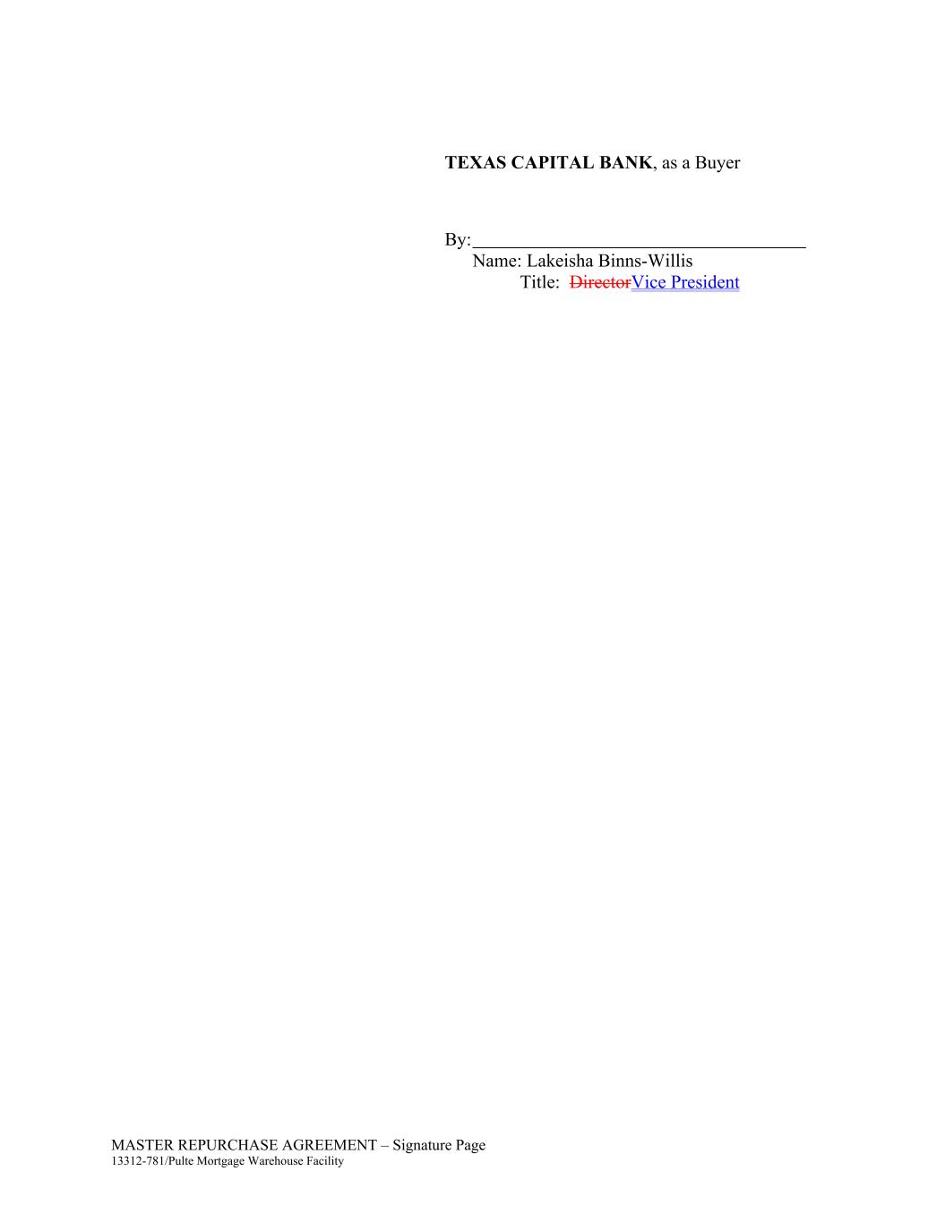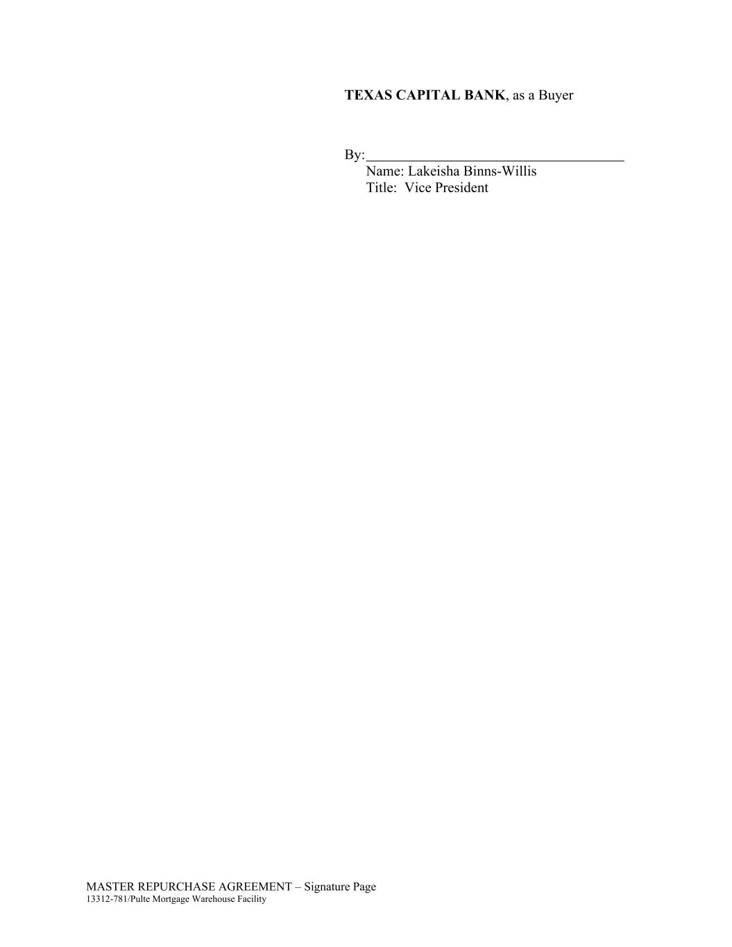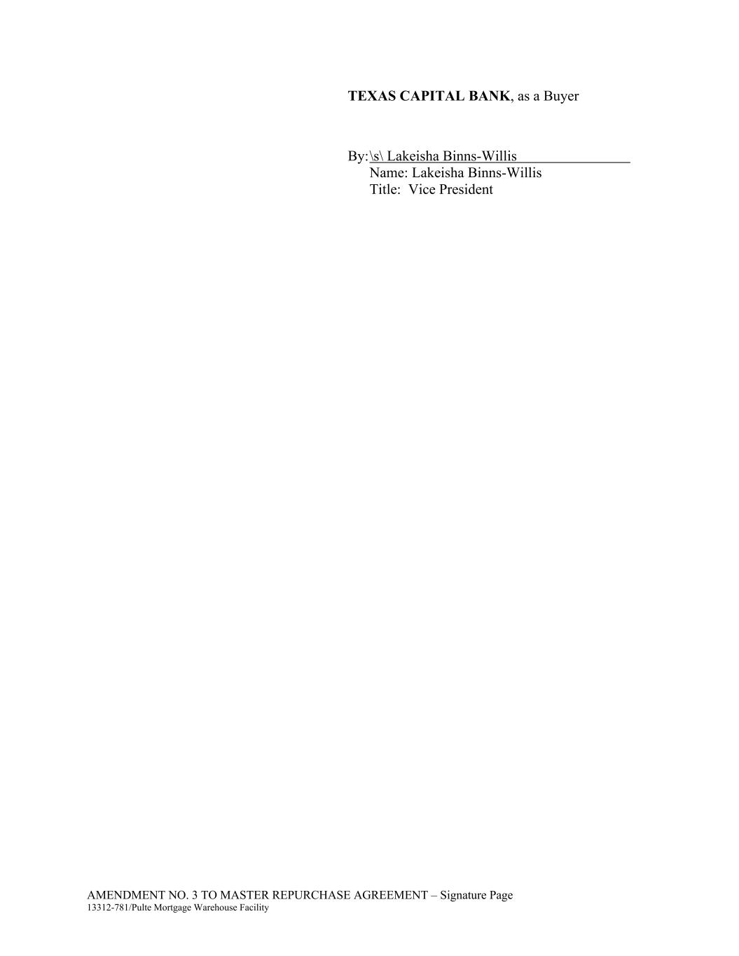 AMENDMENT NO. 3 TO MASTER REPURCHASE AGREEMENT – Signature Page 13312-781/Pulte Mortgage Warehouse Facility TEXAS CAPITAL BANK, as a Buyer By: \s\ Lakeisha Binns-Willis Name: Lakeisha Binns-Willis Title: Vice President