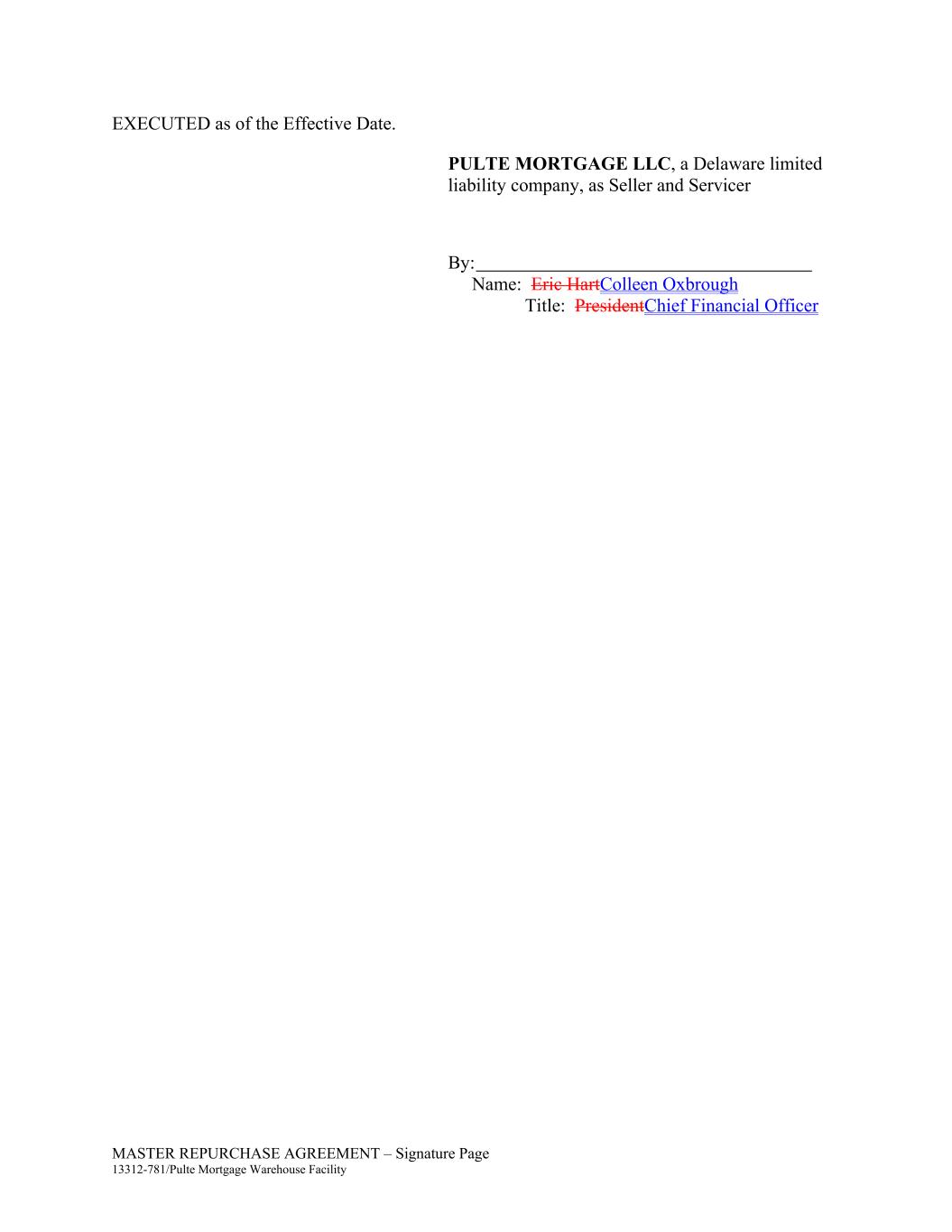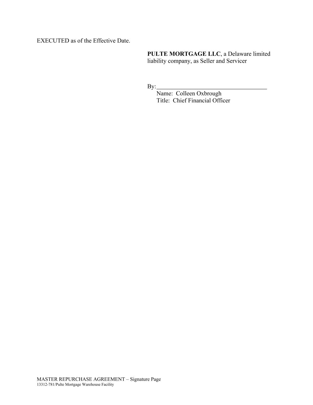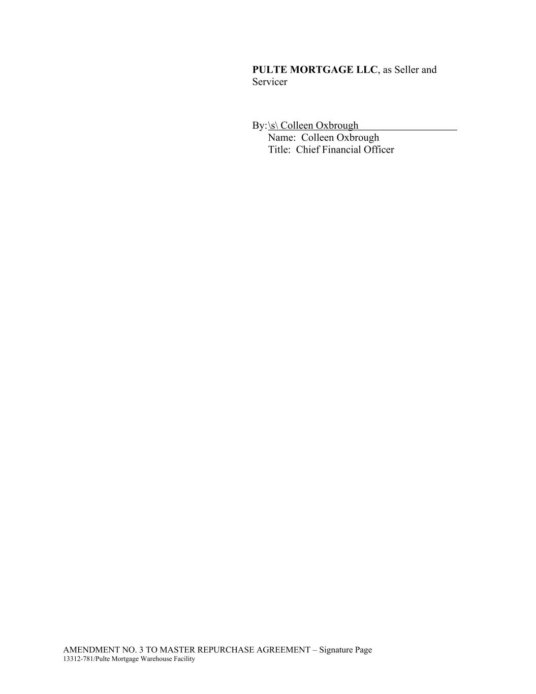AMENDMENT NO. 3 TO MASTER REPURCHASE AGREEMENT – Signature Page 13312-781/Pulte Mortgage Warehouse Facility PULTE MORTGAGE LLC, as Seller and Servicer By: \s\ Colleen Oxbrough Name: Colleen Oxbrough Title: Chief Financial Officer