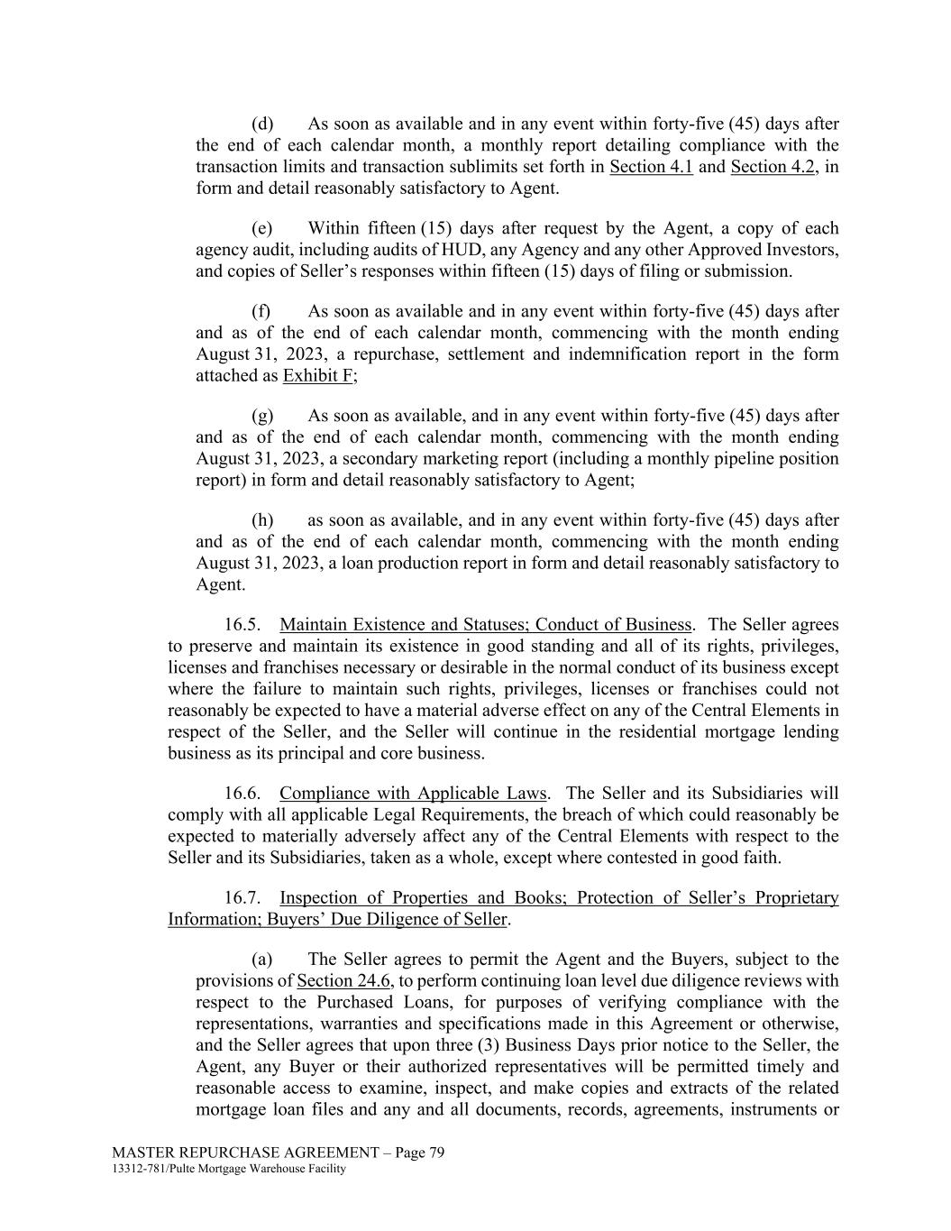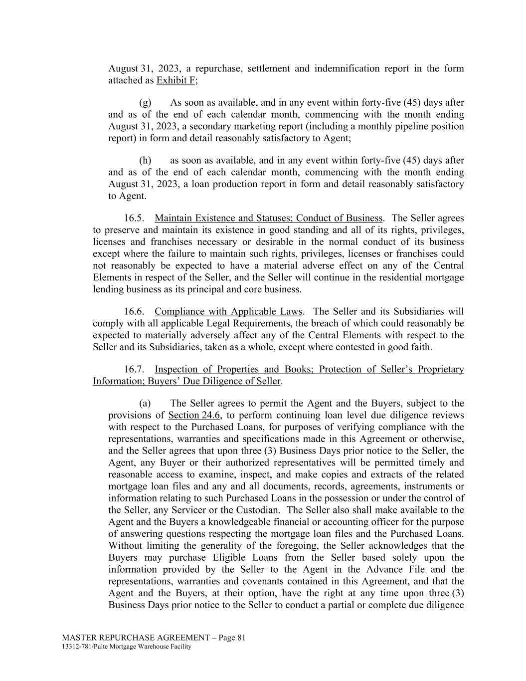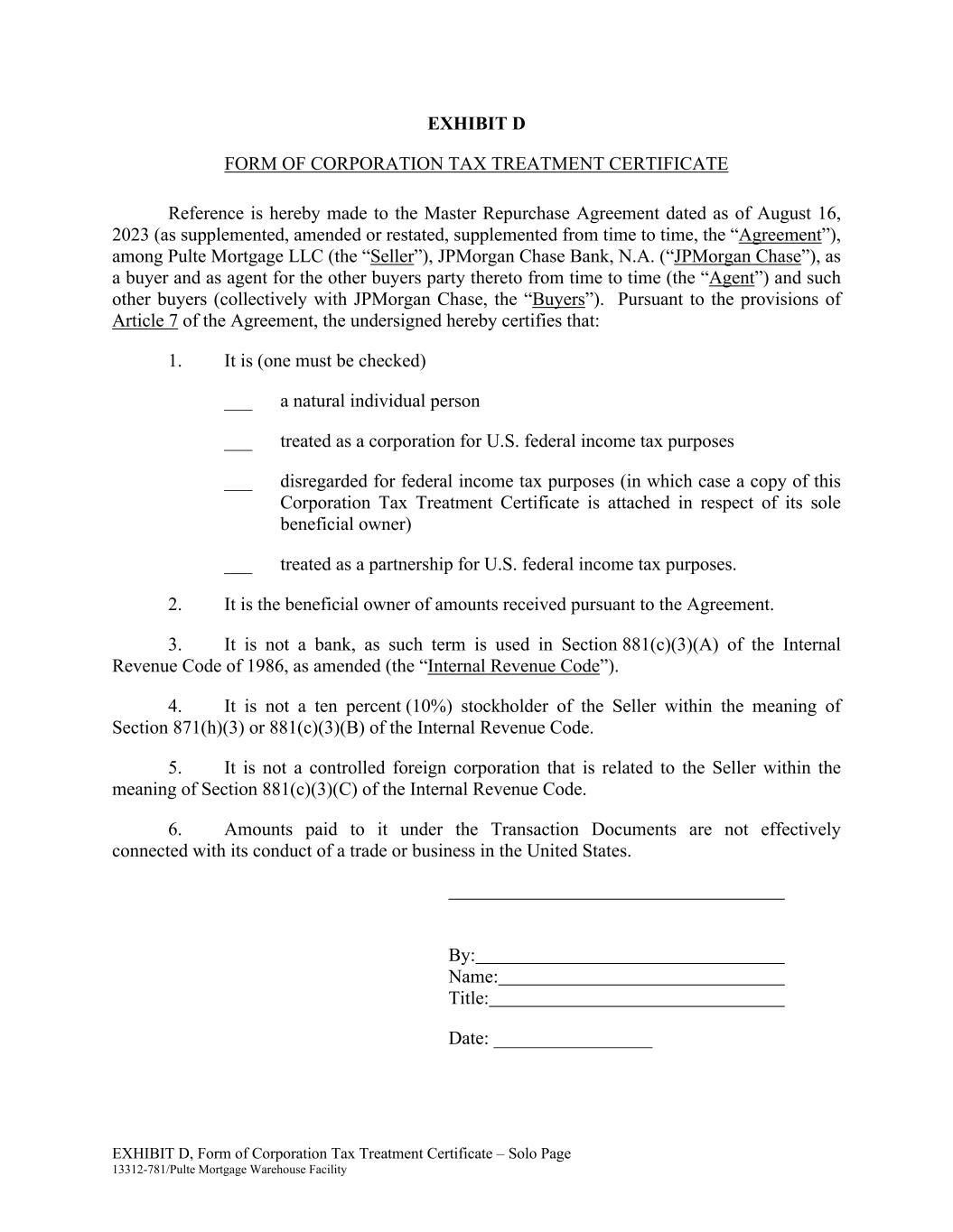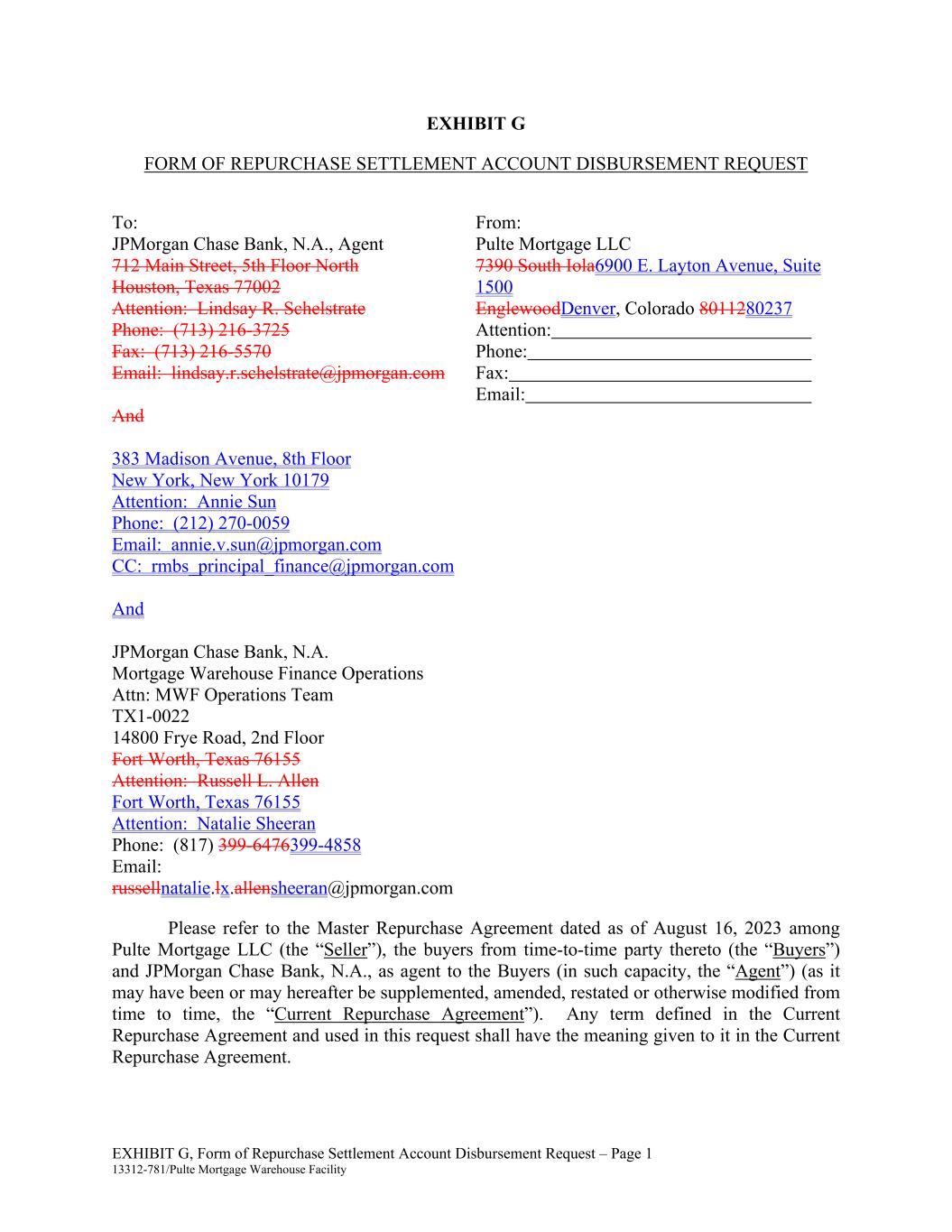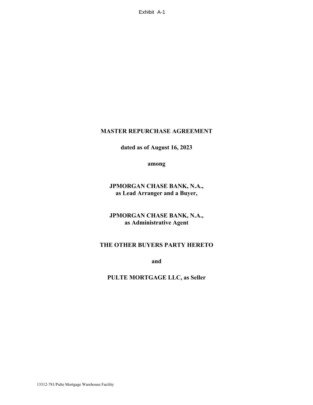 13312-781/Pulte Mortgage Warehouse Facility MASTER REPURCHASE AGREEMENT dated as of August 16, 2023 among JPMORGAN CHASE BANK, N.A., as Lead Arranger and a Buyer, JPMORGAN CHASE BANK, N.A., as Administrative Agent THE OTHER BUYERS PARTY HERETO and PULTE MORTGAGE LLC, as Seller
