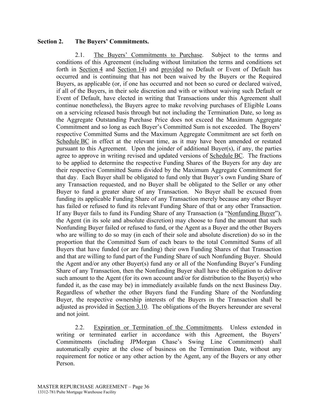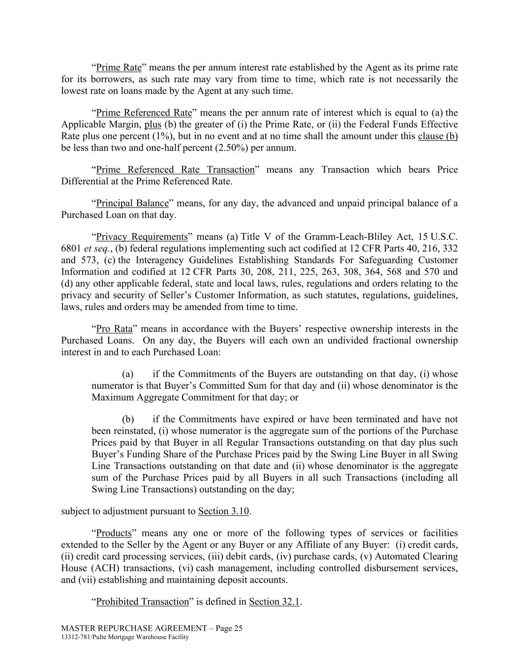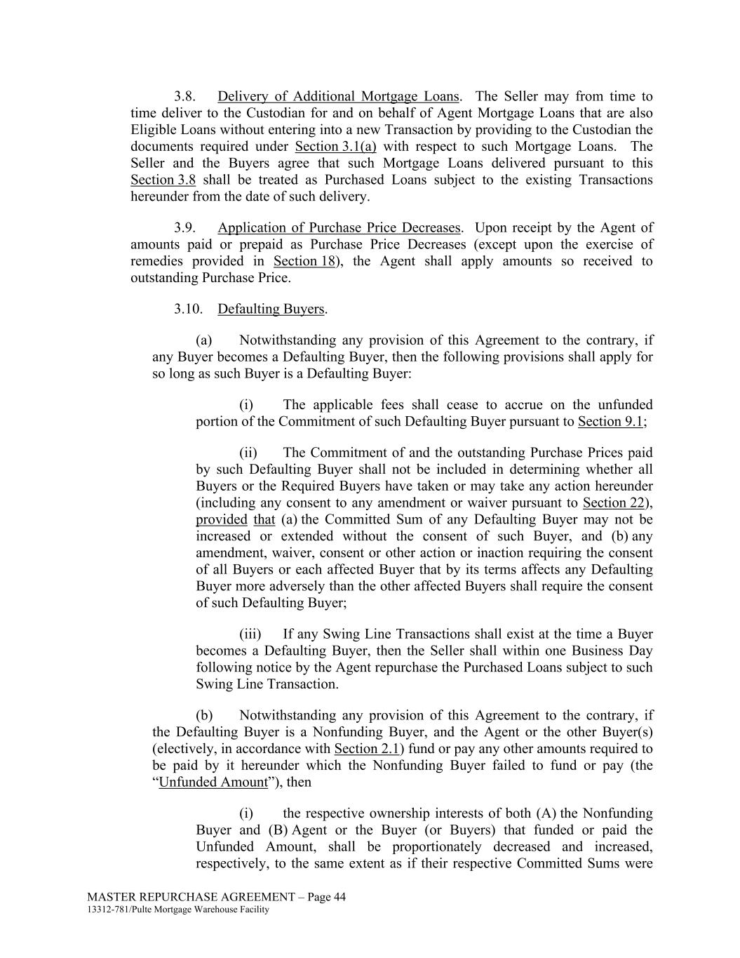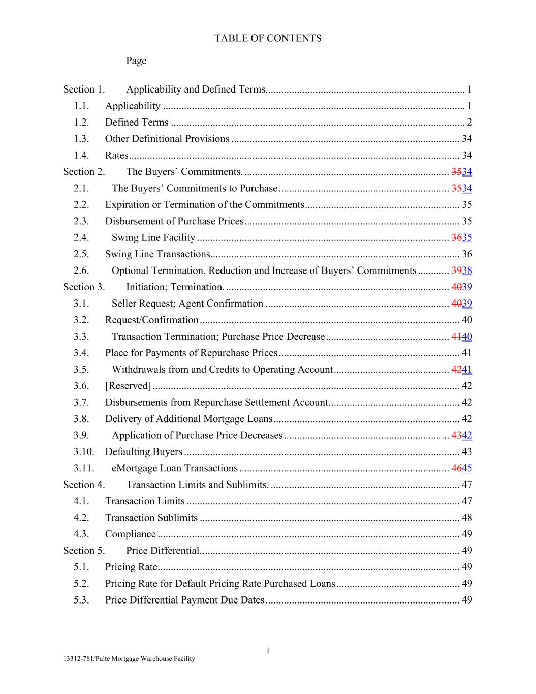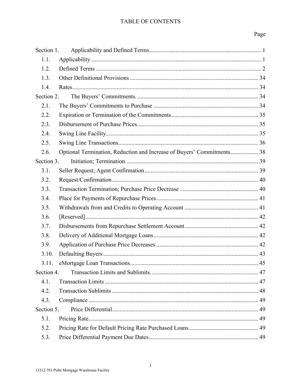 TABLE OF CONTENTS Page i 13312-781/Pulte Mortgage Warehouse Facility Section 1. Applicability and Defined Terms. ........................................................................... 1 1.1. Applicability ................................................................................................................... 1 1.2. Defined Terms ................................................................................................................ 2 1.3. Other Definitional Provisions ....................................................................................... 34 1.4. Rates .............................................................................................................................. 34 Section 2. The Buyers’ Commitments. .............................................................................. 3534 2.1. The Buyers’ Commitments to Purchase ................................................................. 3534 2.2. Expiration or Termination of the Commitments ........................................................... 35 2.3. Disbursement of Purchase Prices .................................................................................. 35 2.4. Swing Line Facility ................................................................................................ 3635 2.5. Swing Line Transactions............................................................................................... 36 2.6. Optional Termination, Reduction and Increase of Buyers’ Commitments ............ 3938 Section 3. Initiation; Termination. ..................................................................................... 4039 3.1. Seller Request; Agent Confirmation ...................................................................... 4039 3.2. Request/Confirmation ................................................................................................... 40 3.3. Transaction Termination; Purchase Price Decrease ............................................... 4140 3.4. Place for Payments of Repurchase Prices ..................................................................... 41 3.5. Withdrawals from and Credits to Operating Account ............................................ 4241 3.6. [Reserved] ..................................................................................................................... 42 3.7. Disbursements from Repurchase Settlement Account .................................................. 42 3.8. Delivery of Additional Mortgage Loans ....................................................................... 42 3.9. Application of Purchase Price Decreases ............................................................... 4342 3.10. Defaulting Buyers ......................................................................................................... 43 3.11. eMortgage Loan Transactions ................................................................................ 4645 Section 4. Transaction Limits and Sublimits. ........................................................................ 47 4.1. Transaction Limits ........................................................................................................ 47 4.2. Transaction Sublimits ................................................................................................... 48 4.3. Compliance ................................................................................................................... 49 Section 5. Price Differential. .................................................................................................. 49 5.1. Pricing Rate ................................................................................................................... 49 5.2. Pricing Rate for Default Pricing Rate Purchased Loans ............................................... 49 5.3. Price Differential Payment Due Dates .......................................................................... 49