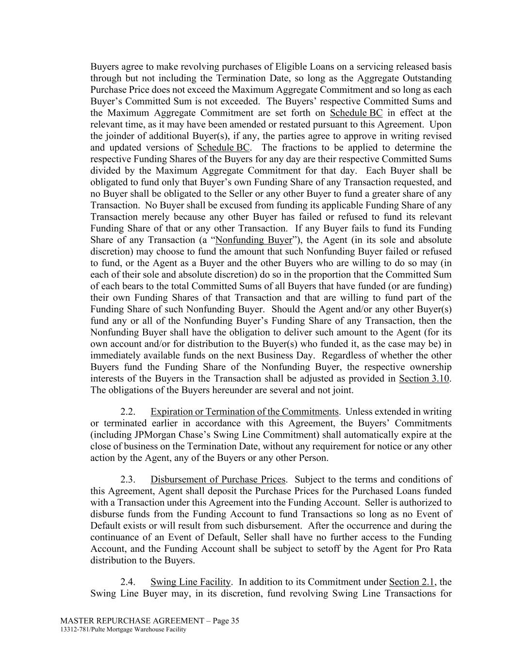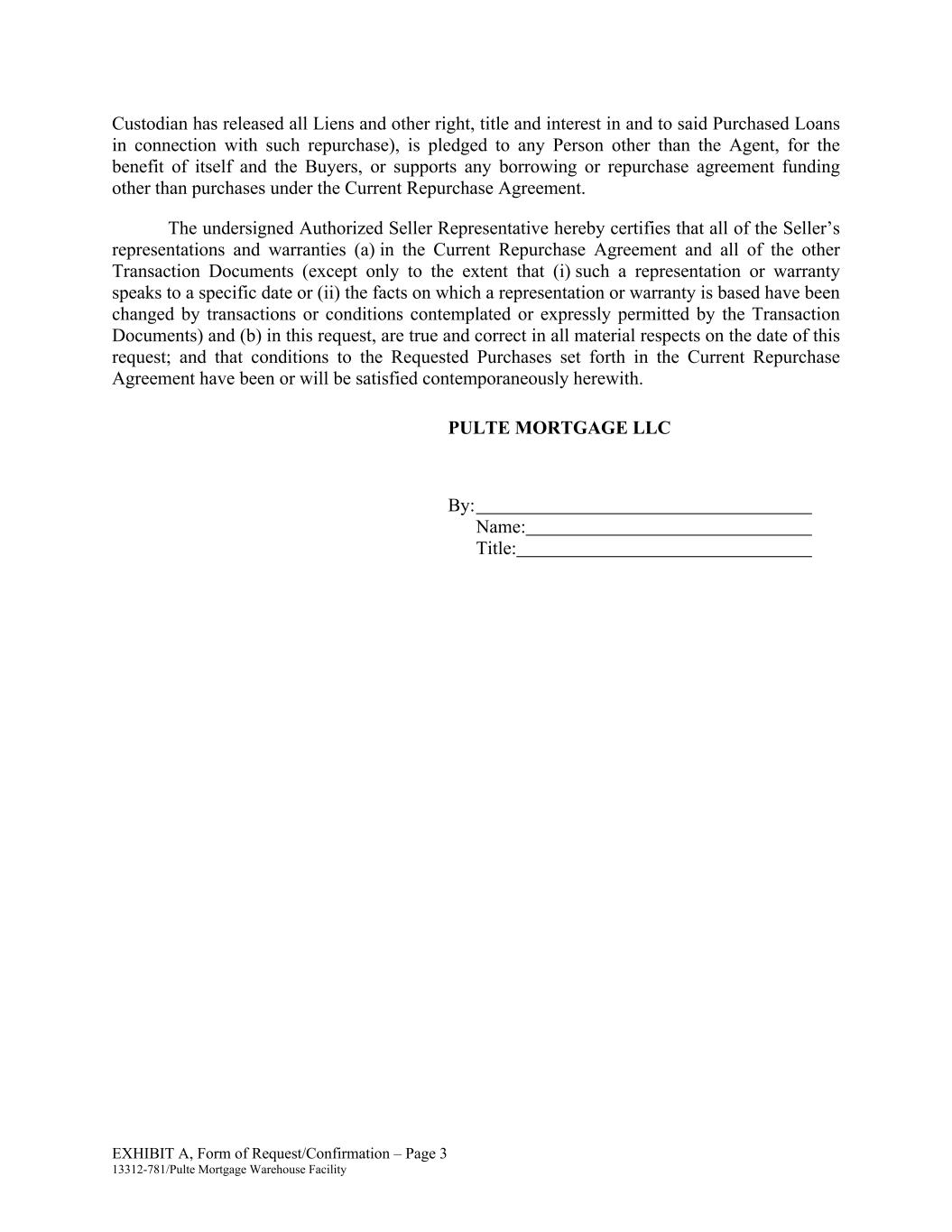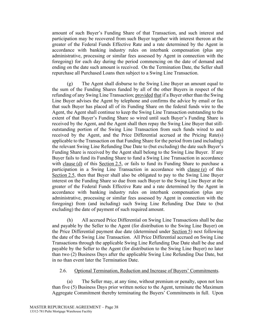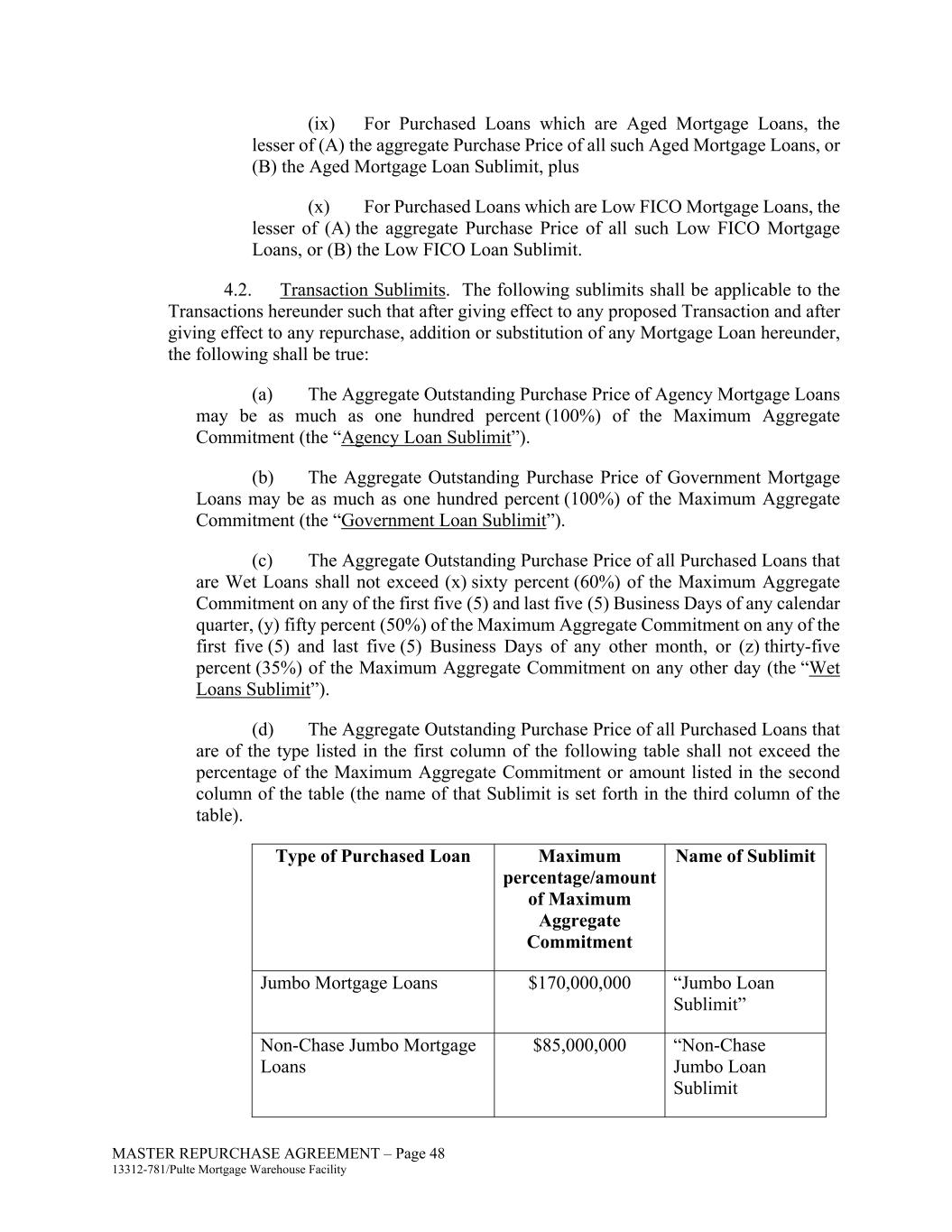 TABLE OF CONTENTS Page i 13312-781/Pulte Mortgage Warehouse Facility Section 1. Applicability and Defined Terms. ........................................................................... 1 1.1. Applicability ................................................................................................................... 1 1.2. Defined Terms ................................................................................................................ 2 1.3. Other Definitional Provisions ....................................................................................... 34 1.4. Rates .............................................................................................................................. 34 Section 2. The Buyers’ Commitments. .............................................................................. 3534 2.1. The Buyers’ Commitments to Purchase ................................................................. 3534 2.2. Expiration or Termination of the Commitments ........................................................... 35 2.3. Disbursement of Purchase Prices .................................................................................. 35 2.4. Swing Line Facility ................................................................................................ 3635 2.5. Swing Line Transactions............................................................................................... 36 2.6. Optional Termination, Reduction and Increase of Buyers’ Commitments ............ 3938 Section 3. Initiation; Termination. ..................................................................................... 4039 3.1. Seller Request; Agent Confirmation ...................................................................... 4039 3.2. Request/Confirmation ................................................................................................... 40 3.3. Transaction Termination; Purchase Price Decrease ............................................... 4140 3.4. Place for Payments of Repurchase Prices ..................................................................... 41 3.5. Withdrawals from and Credits to Operating Account ............................................ 4241 3.6. [Reserved] ..................................................................................................................... 42 3.7. Disbursements from Repurchase Settlement Account .................................................. 42 3.8. Delivery of Additional Mortgage Loans ....................................................................... 42 3.9. Application of Purchase Price Decreases ............................................................... 4342 3.10. Defaulting Buyers ......................................................................................................... 43 3.11. eMortgage Loan Transactions ................................................................................ 4645 Section 4. Transaction Limits and Sublimits. ........................................................................ 47 4.1. Transaction Limits ........................................................................................................ 47 4.2. Transaction Sublimits ................................................................................................... 48 4.3. Compliance ................................................................................................................... 49 Section 5. Price Differential. .................................................................................................. 49 5.1. Pricing Rate ................................................................................................................... 49 5.2. Pricing Rate for Default Pricing Rate Purchased Loans ............................................... 49 5.3. Price Differential Payment Due Dates .......................................................................... 49