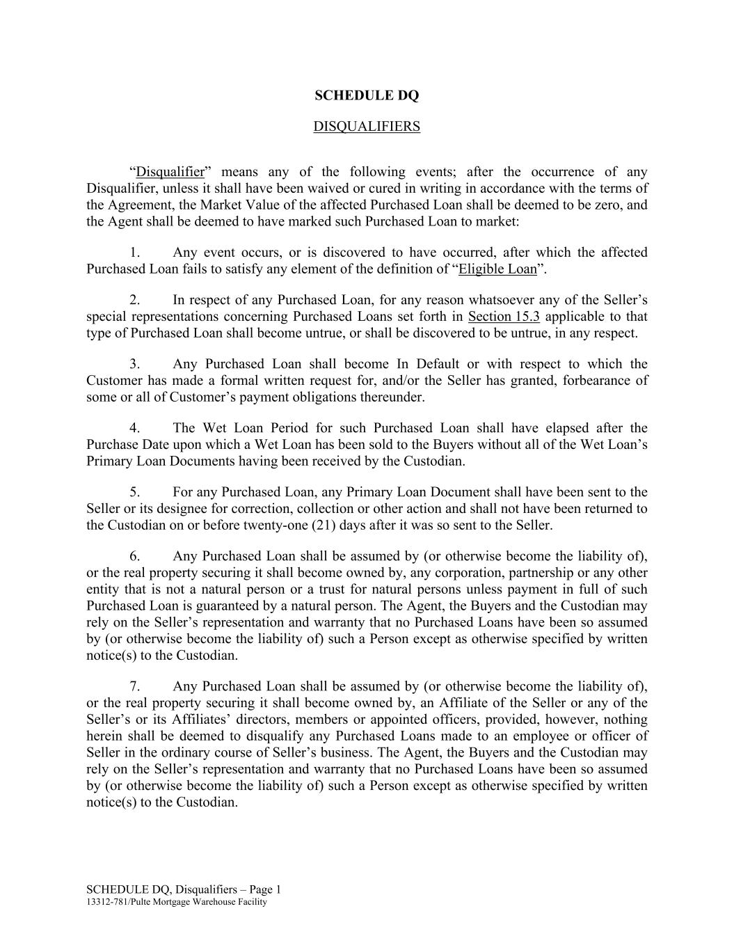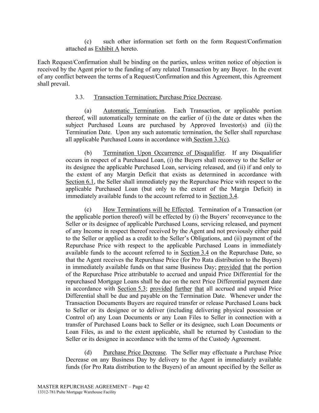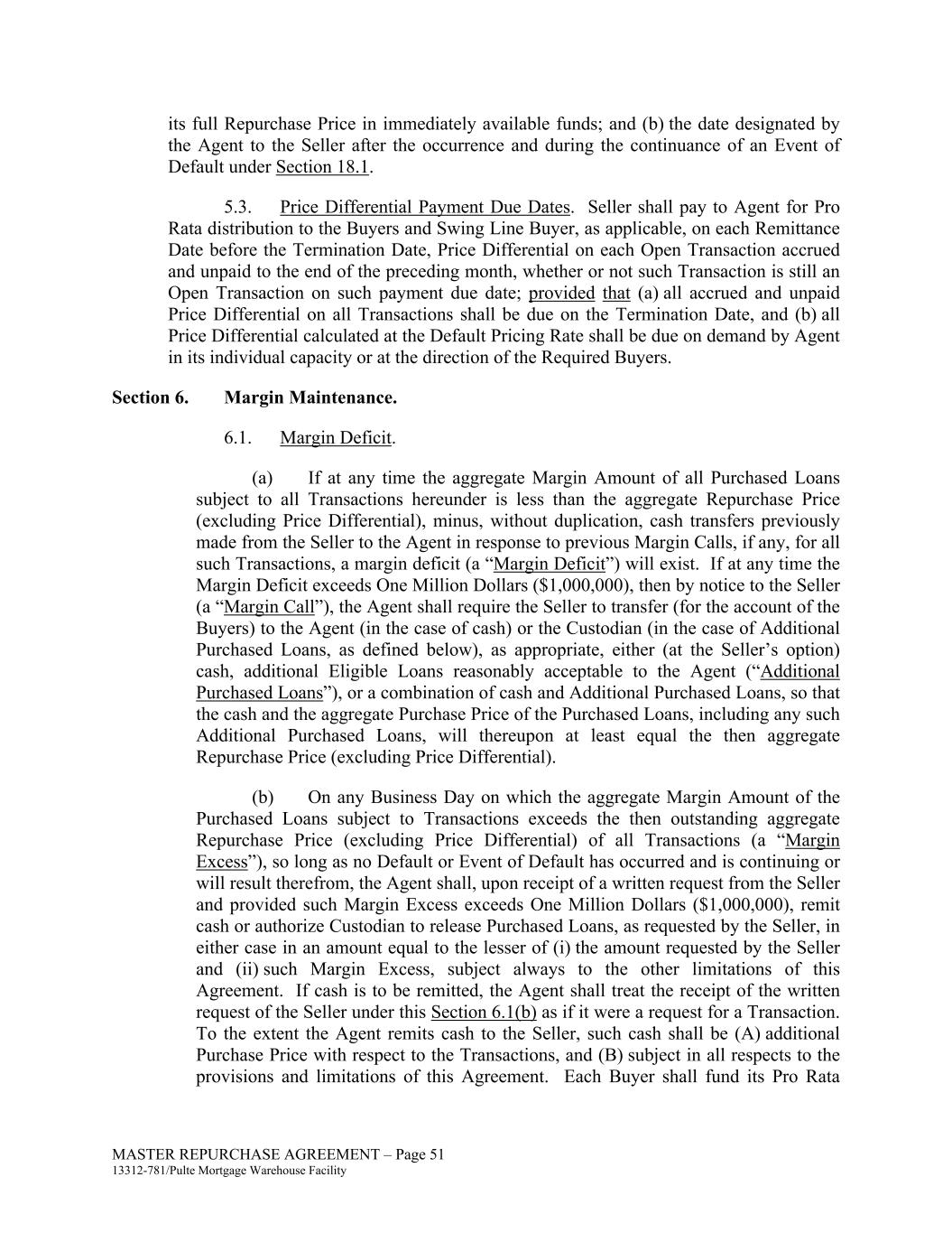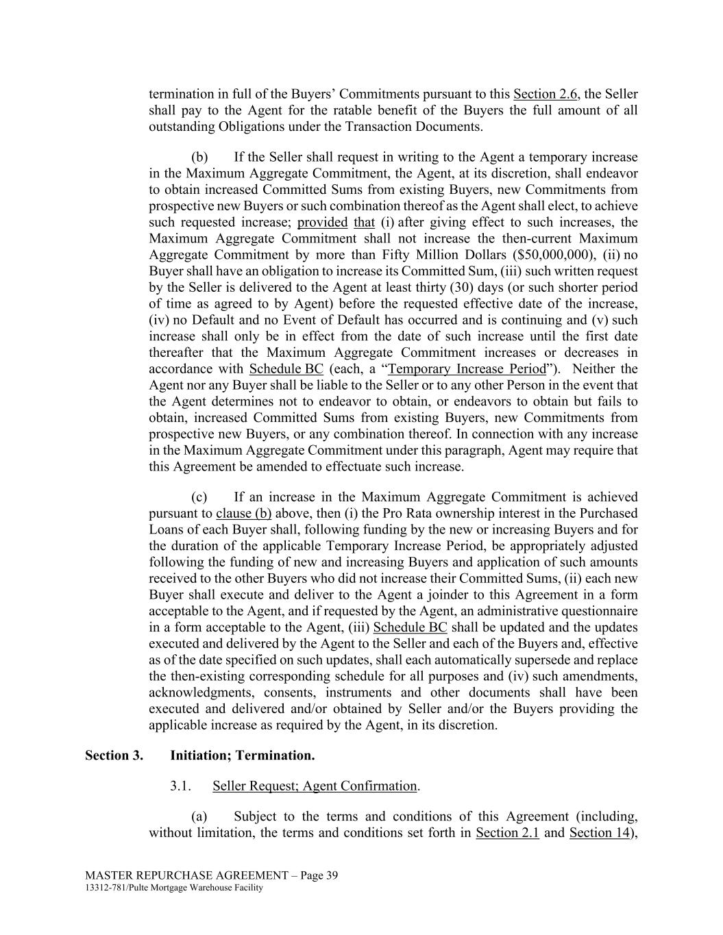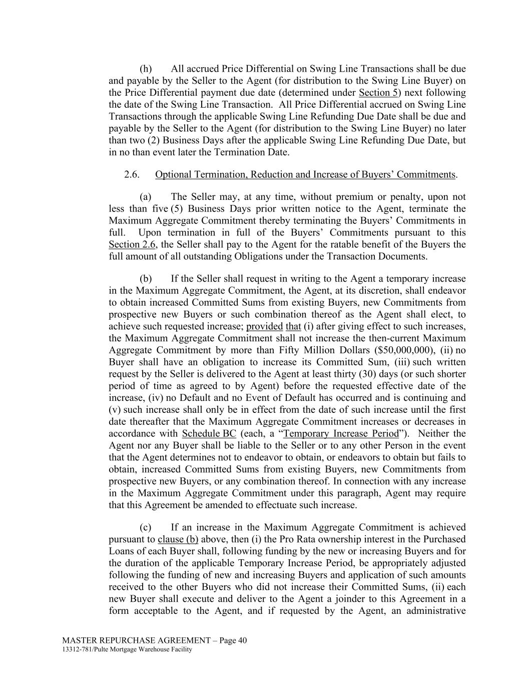 TABLE OF CONTENTS Page i 13312-781/Pulte Mortgage Warehouse Facility Section 1. Applicability and Defined Terms. ........................................................................... 1 1.1. Applicability ................................................................................................................... 1 1.2. Defined Terms ................................................................................................................ 2 1.3. Other Definitional Provisions ....................................................................................... 34 1.4. Rates .............................................................................................................................. 34 Section 2. The Buyers’ Commitments. .............................................................................. 3534 2.1. The Buyers’ Commitments to Purchase ................................................................. 3534 2.2. Expiration or Termination of the Commitments ........................................................... 35 2.3. Disbursement of Purchase Prices .................................................................................. 35 2.4. Swing Line Facility ................................................................................................ 3635 2.5. Swing Line Transactions............................................................................................... 36 2.6. Optional Termination, Reduction and Increase of Buyers’ Commitments ............ 3938 Section 3. Initiation; Termination. ..................................................................................... 4039 3.1. Seller Request; Agent Confirmation ...................................................................... 4039 3.2. Request/Confirmation ................................................................................................... 40 3.3. Transaction Termination; Purchase Price Decrease ............................................... 4140 3.4. Place for Payments of Repurchase Prices ..................................................................... 41 3.5. Withdrawals from and Credits to Operating Account ............................................ 4241 3.6. [Reserved] ..................................................................................................................... 42 3.7. Disbursements from Repurchase Settlement Account .................................................. 42 3.8. Delivery of Additional Mortgage Loans ....................................................................... 42 3.9. Application of Purchase Price Decreases ............................................................... 4342 3.10. Defaulting Buyers ......................................................................................................... 43 3.11. eMortgage Loan Transactions ................................................................................ 4645 Section 4. Transaction Limits and Sublimits. ........................................................................ 47 4.1. Transaction Limits ........................................................................................................ 47 4.2. Transaction Sublimits ................................................................................................... 48 4.3. Compliance ................................................................................................................... 49 Section 5. Price Differential. .................................................................................................. 49 5.1. Pricing Rate ................................................................................................................... 49 5.2. Pricing Rate for Default Pricing Rate Purchased Loans ............................................... 49 5.3. Price Differential Payment Due Dates .......................................................................... 49