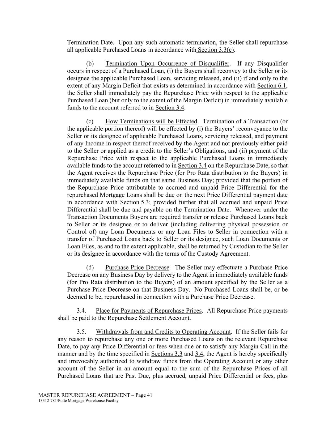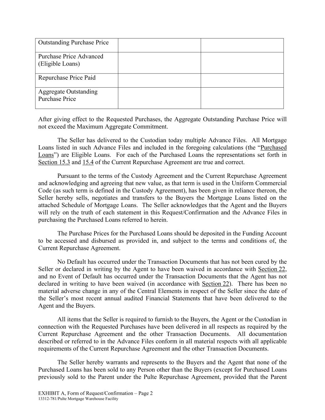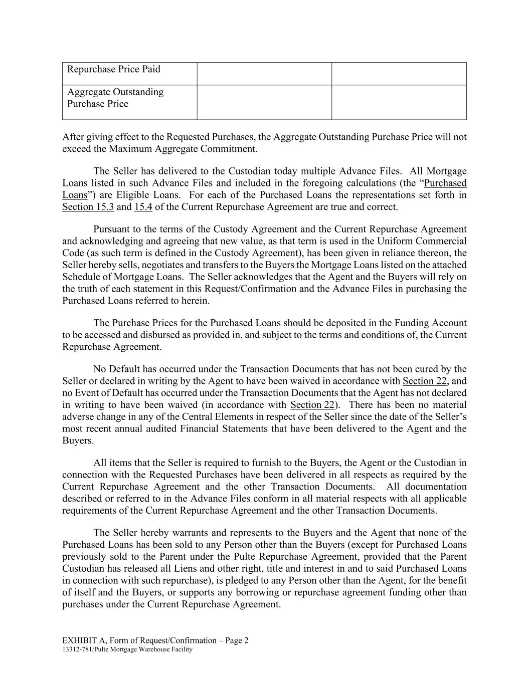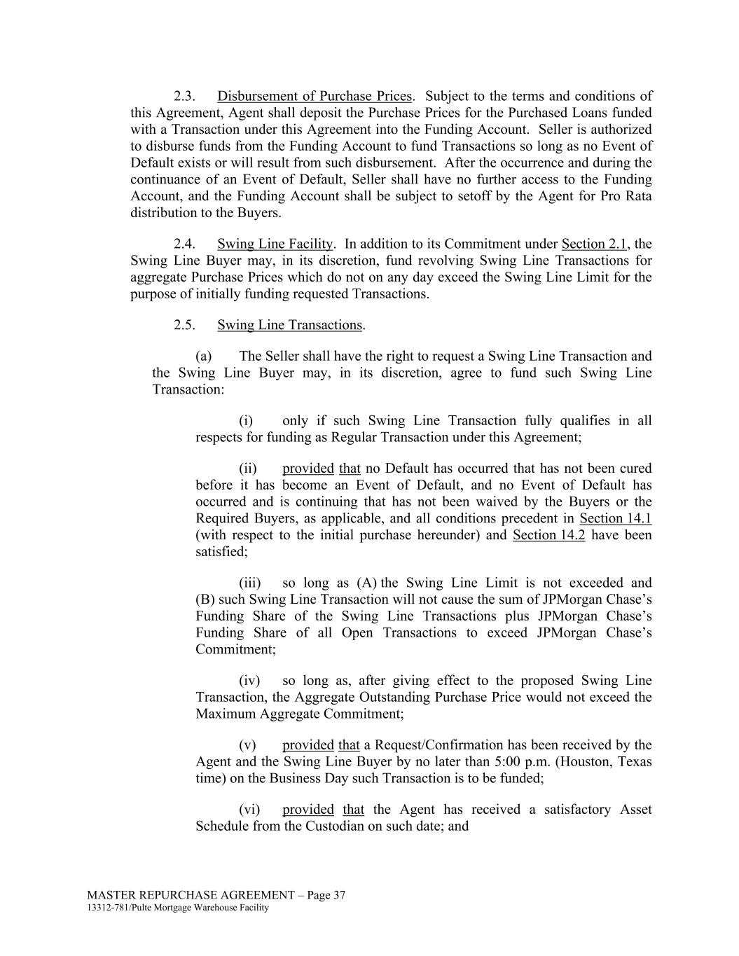 TABLE OF CONTENTS Page i 13312-781/Pulte Mortgage Warehouse Facility Section 1. Applicability and Defined Terms. ........................................................................... 1 1.1. Applicability ................................................................................................................... 1 1.2. Defined Terms ................................................................................................................ 2 1.3. Other Definitional Provisions ....................................................................................... 34 1.4. Rates .............................................................................................................................. 34 Section 2. The Buyers’ Commitments. .............................................................................. 3534 2.1. The Buyers’ Commitments to Purchase ................................................................. 3534 2.2. Expiration or Termination of the Commitments ........................................................... 35 2.3. Disbursement of Purchase Prices .................................................................................. 35 2.4. Swing Line Facility ................................................................................................ 3635 2.5. Swing Line Transactions............................................................................................... 36 2.6. Optional Termination, Reduction and Increase of Buyers’ Commitments ............ 3938 Section 3. Initiation; Termination. ..................................................................................... 4039 3.1. Seller Request; Agent Confirmation ...................................................................... 4039 3.2. Request/Confirmation ................................................................................................... 40 3.3. Transaction Termination; Purchase Price Decrease ............................................... 4140 3.4. Place for Payments of Repurchase Prices ..................................................................... 41 3.5. Withdrawals from and Credits to Operating Account ............................................ 4241 3.6. [Reserved] ..................................................................................................................... 42 3.7. Disbursements from Repurchase Settlement Account .................................................. 42 3.8. Delivery of Additional Mortgage Loans ....................................................................... 42 3.9. Application of Purchase Price Decreases ............................................................... 4342 3.10. Defaulting Buyers ......................................................................................................... 43 3.11. eMortgage Loan Transactions ................................................................................ 4645 Section 4. Transaction Limits and Sublimits. ........................................................................ 47 4.1. Transaction Limits ........................................................................................................ 47 4.2. Transaction Sublimits ................................................................................................... 48 4.3. Compliance ................................................................................................................... 49 Section 5. Price Differential. .................................................................................................. 49 5.1. Pricing Rate ................................................................................................................... 49 5.2. Pricing Rate for Default Pricing Rate Purchased Loans ............................................... 49 5.3. Price Differential Payment Due Dates .......................................................................... 49