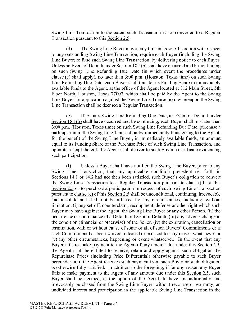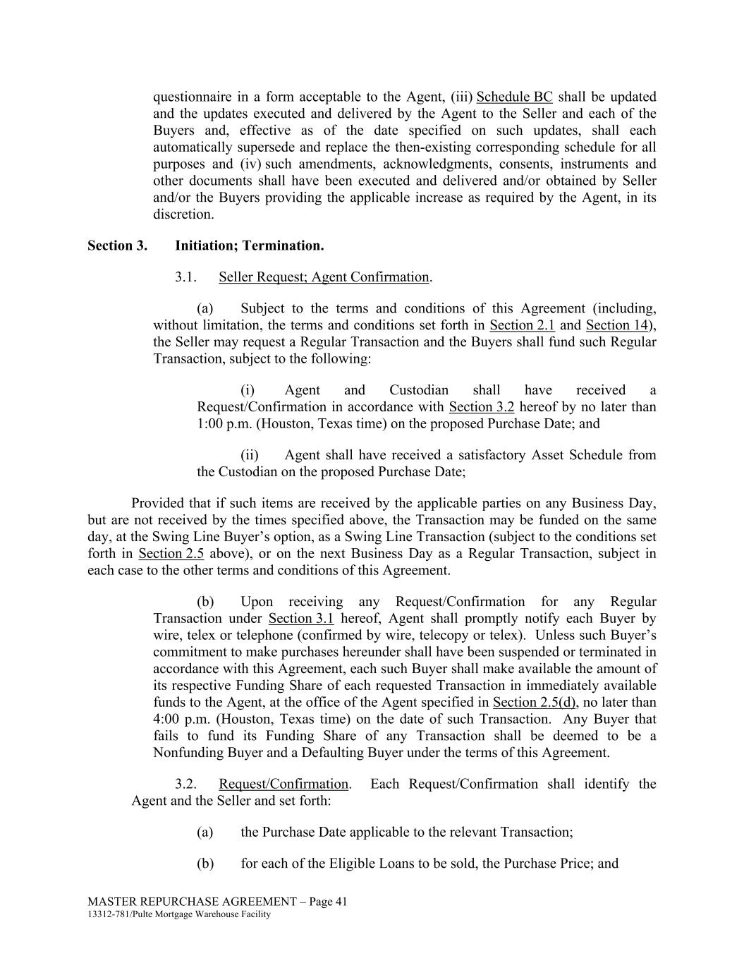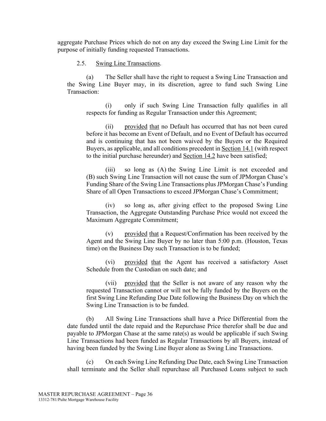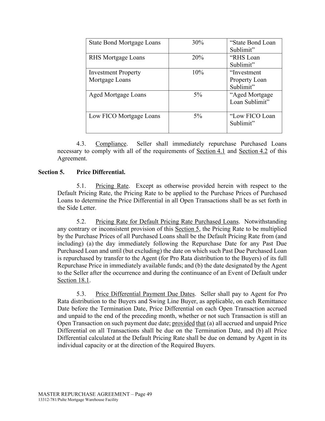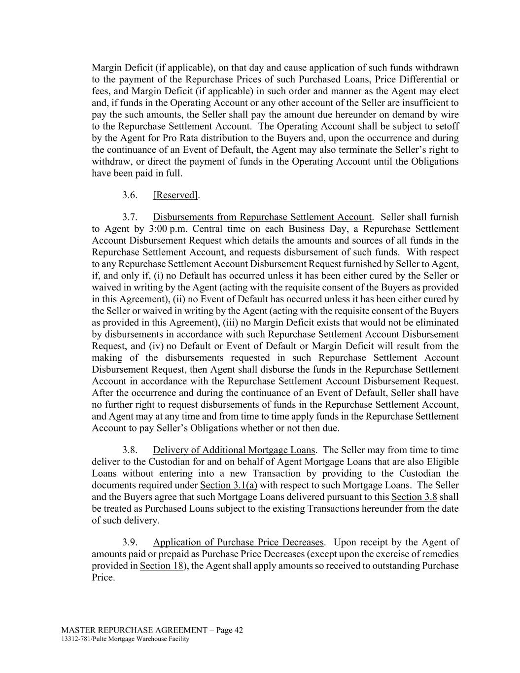 TABLE OF CONTENTS Page i 13312-781/Pulte Mortgage Warehouse Facility Section 1. Applicability and Defined Terms. ........................................................................... 1 1.1. Applicability ................................................................................................................... 1 1.2. Defined Terms ................................................................................................................ 2 1.3. Other Definitional Provisions ....................................................................................... 34 1.4. Rates .............................................................................................................................. 34 Section 2. The Buyers’ Commitments. .............................................................................. 3534 2.1. The Buyers’ Commitments to Purchase ................................................................. 3534 2.2. Expiration or Termination of the Commitments ........................................................... 35 2.3. Disbursement of Purchase Prices .................................................................................. 35 2.4. Swing Line Facility ................................................................................................ 3635 2.5. Swing Line Transactions............................................................................................... 36 2.6. Optional Termination, Reduction and Increase of Buyers’ Commitments ............ 3938 Section 3. Initiation; Termination. ..................................................................................... 4039 3.1. Seller Request; Agent Confirmation ...................................................................... 4039 3.2. Request/Confirmation ................................................................................................... 40 3.3. Transaction Termination; Purchase Price Decrease ............................................... 4140 3.4. Place for Payments of Repurchase Prices ..................................................................... 41 3.5. Withdrawals from and Credits to Operating Account ............................................ 4241 3.6. [Reserved] ..................................................................................................................... 42 3.7. Disbursements from Repurchase Settlement Account .................................................. 42 3.8. Delivery of Additional Mortgage Loans ....................................................................... 42 3.9. Application of Purchase Price Decreases ............................................................... 4342 3.10. Defaulting Buyers ......................................................................................................... 43 3.11. eMortgage Loan Transactions ................................................................................ 4645 Section 4. Transaction Limits and Sublimits. ........................................................................ 47 4.1. Transaction Limits ........................................................................................................ 47 4.2. Transaction Sublimits ................................................................................................... 48 4.3. Compliance ................................................................................................................... 49 Section 5. Price Differential. .................................................................................................. 49 5.1. Pricing Rate ................................................................................................................... 49 5.2. Pricing Rate for Default Pricing Rate Purchased Loans ............................................... 49 5.3. Price Differential Payment Due Dates .......................................................................... 49