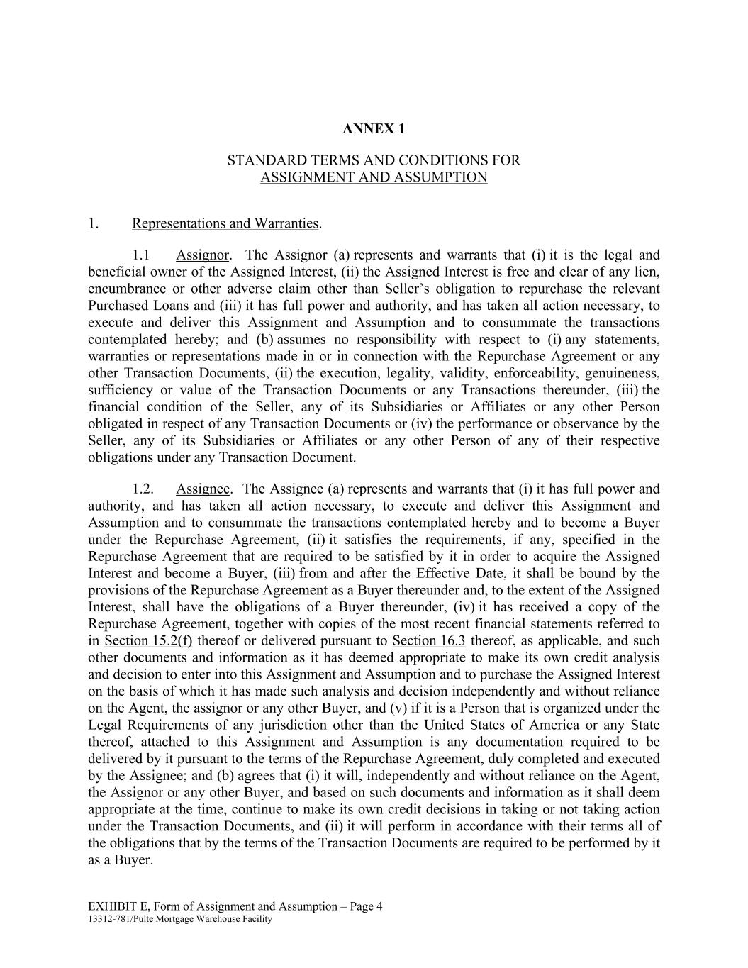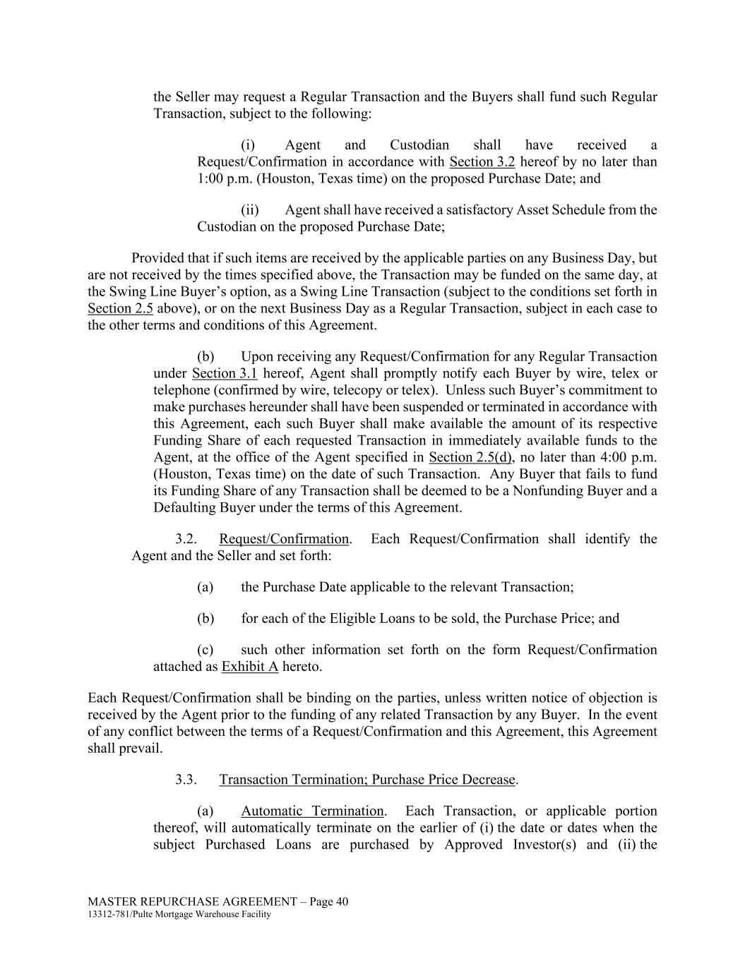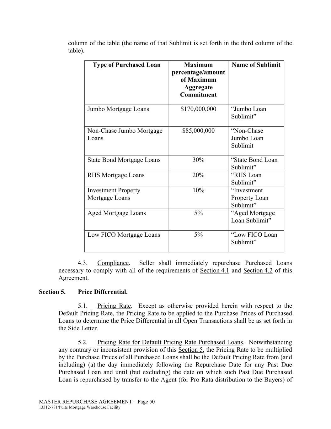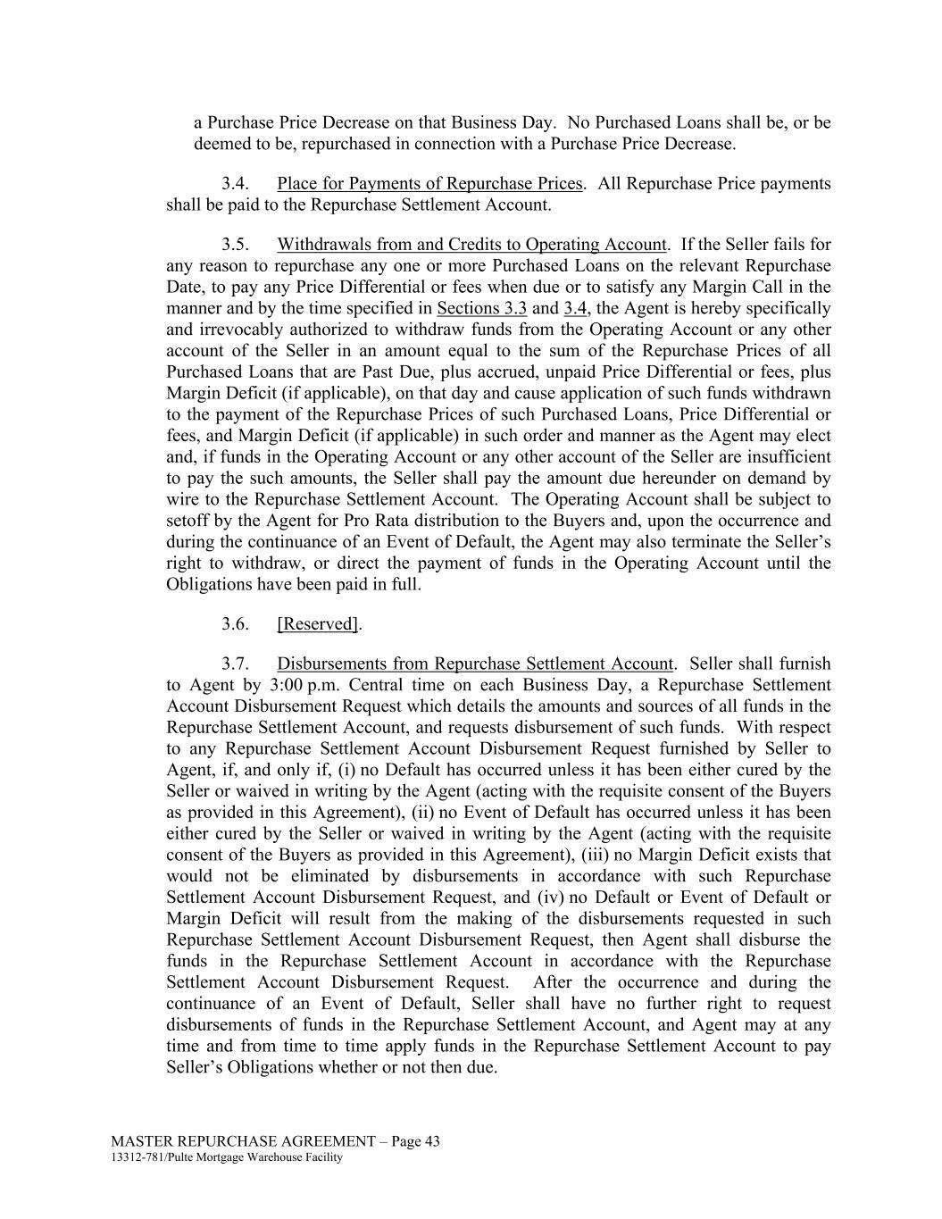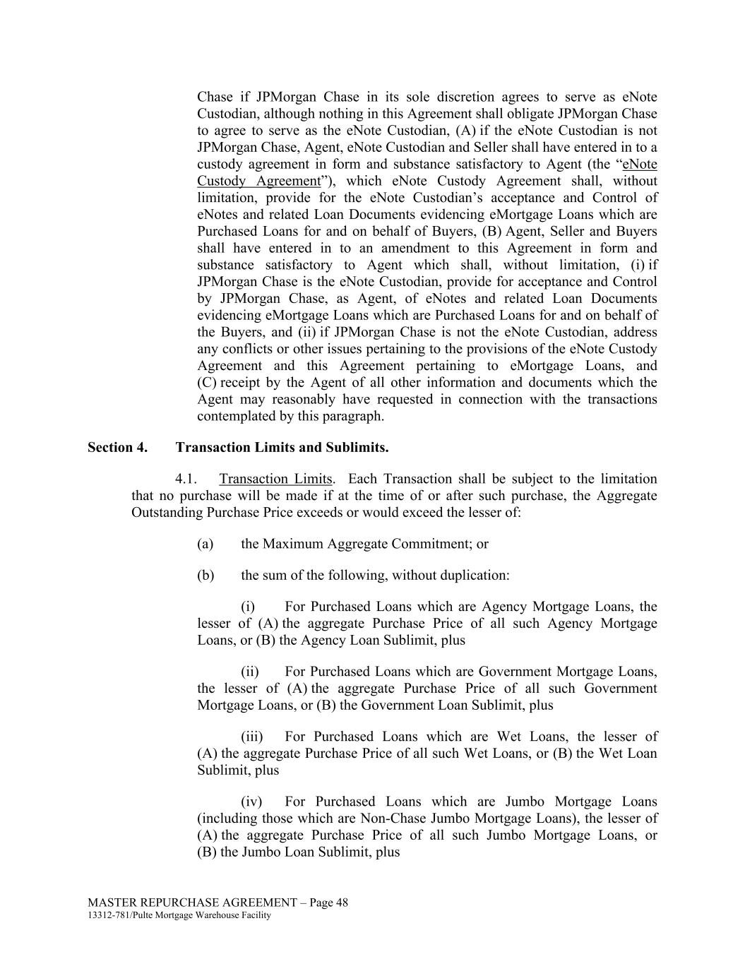 TABLE OF CONTENTS Page i 13312-781/Pulte Mortgage Warehouse Facility Section 1. Applicability and Defined Terms. ........................................................................... 1 1.1. Applicability ................................................................................................................... 1 1.2. Defined Terms ................................................................................................................ 2 1.3. Other Definitional Provisions ....................................................................................... 34 1.4. Rates .............................................................................................................................. 34 Section 2. The Buyers’ Commitments. .............................................................................. 3534 2.1. The Buyers’ Commitments to Purchase ................................................................. 3534 2.2. Expiration or Termination of the Commitments ........................................................... 35 2.3. Disbursement of Purchase Prices .................................................................................. 35 2.4. Swing Line Facility ................................................................................................ 3635 2.5. Swing Line Transactions............................................................................................... 36 2.6. Optional Termination, Reduction and Increase of Buyers’ Commitments ............ 3938 Section 3. Initiation; Termination. ..................................................................................... 4039 3.1. Seller Request; Agent Confirmation ...................................................................... 4039 3.2. Request/Confirmation ................................................................................................... 40 3.3. Transaction Termination; Purchase Price Decrease ............................................... 4140 3.4. Place for Payments of Repurchase Prices ..................................................................... 41 3.5. Withdrawals from and Credits to Operating Account ............................................ 4241 3.6. [Reserved] ..................................................................................................................... 42 3.7. Disbursements from Repurchase Settlement Account .................................................. 42 3.8. Delivery of Additional Mortgage Loans ....................................................................... 42 3.9. Application of Purchase Price Decreases ............................................................... 4342 3.10. Defaulting Buyers ......................................................................................................... 43 3.11. eMortgage Loan Transactions ................................................................................ 4645 Section 4. Transaction Limits and Sublimits. ........................................................................ 47 4.1. Transaction Limits ........................................................................................................ 47 4.2. Transaction Sublimits ................................................................................................... 48 4.3. Compliance ................................................................................................................... 49 Section 5. Price Differential. .................................................................................................. 49 5.1. Pricing Rate ................................................................................................................... 49 5.2. Pricing Rate for Default Pricing Rate Purchased Loans ............................................... 49 5.3. Price Differential Payment Due Dates .......................................................................... 49