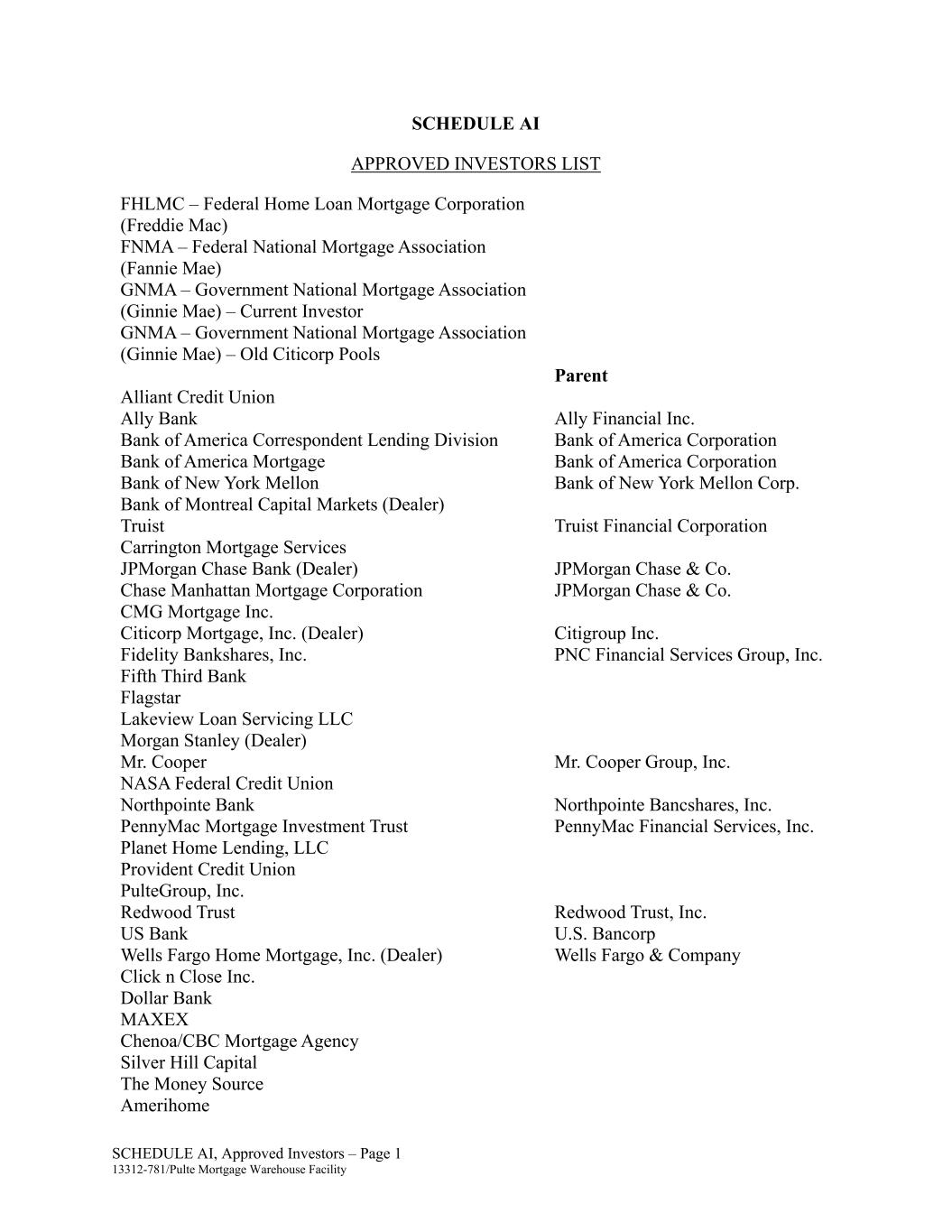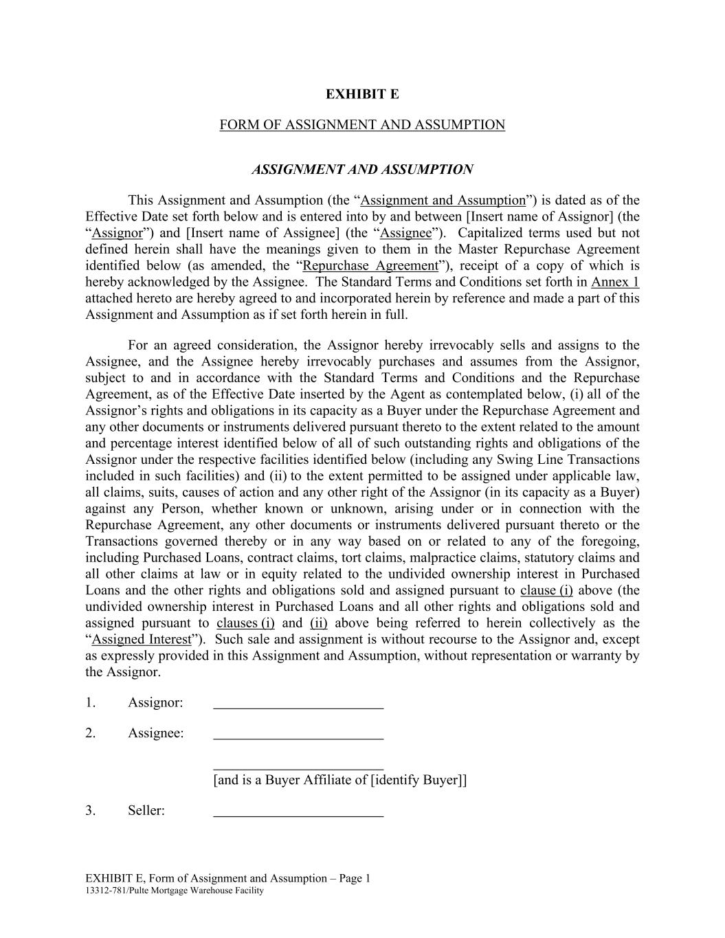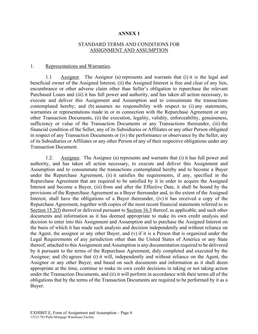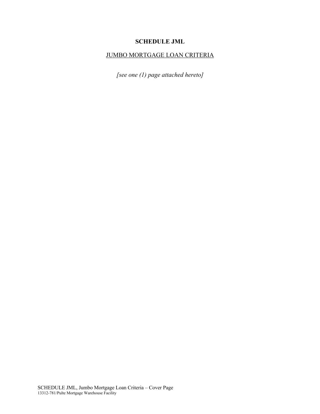 TABLE OF CONTENTS Page i 13312-781/Pulte Mortgage Warehouse Facility Section 1. Applicability and Defined Terms. ........................................................................... 1 1.1. Applicability ................................................................................................................... 1 1.2. Defined Terms ................................................................................................................ 2 1.3. Other Definitional Provisions ....................................................................................... 34 1.4. Rates .............................................................................................................................. 34 Section 2. The Buyers’ Commitments. .............................................................................. 3534 2.1. The Buyers’ Commitments to Purchase ................................................................. 3534 2.2. Expiration or Termination of the Commitments ........................................................... 35 2.3. Disbursement of Purchase Prices .................................................................................. 35 2.4. Swing Line Facility ................................................................................................ 3635 2.5. Swing Line Transactions............................................................................................... 36 2.6. Optional Termination, Reduction and Increase of Buyers’ Commitments ............ 3938 Section 3. Initiation; Termination. ..................................................................................... 4039 3.1. Seller Request; Agent Confirmation ...................................................................... 4039 3.2. Request/Confirmation ................................................................................................... 40 3.3. Transaction Termination; Purchase Price Decrease ............................................... 4140 3.4. Place for Payments of Repurchase Prices ..................................................................... 41 3.5. Withdrawals from and Credits to Operating Account ............................................ 4241 3.6. [Reserved] ..................................................................................................................... 42 3.7. Disbursements from Repurchase Settlement Account .................................................. 42 3.8. Delivery of Additional Mortgage Loans ....................................................................... 42 3.9. Application of Purchase Price Decreases ............................................................... 4342 3.10. Defaulting Buyers ......................................................................................................... 43 3.11. eMortgage Loan Transactions ................................................................................ 4645 Section 4. Transaction Limits and Sublimits. ........................................................................ 47 4.1. Transaction Limits ........................................................................................................ 47 4.2. Transaction Sublimits ................................................................................................... 48 4.3. Compliance ................................................................................................................... 49 Section 5. Price Differential. .................................................................................................. 49 5.1. Pricing Rate ................................................................................................................... 49 5.2. Pricing Rate for Default Pricing Rate Purchased Loans ............................................... 49 5.3. Price Differential Payment Due Dates .......................................................................... 49