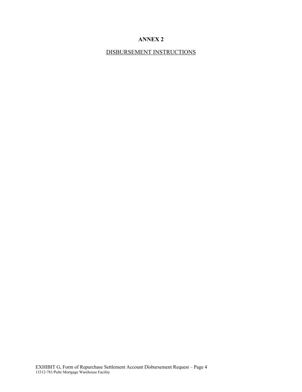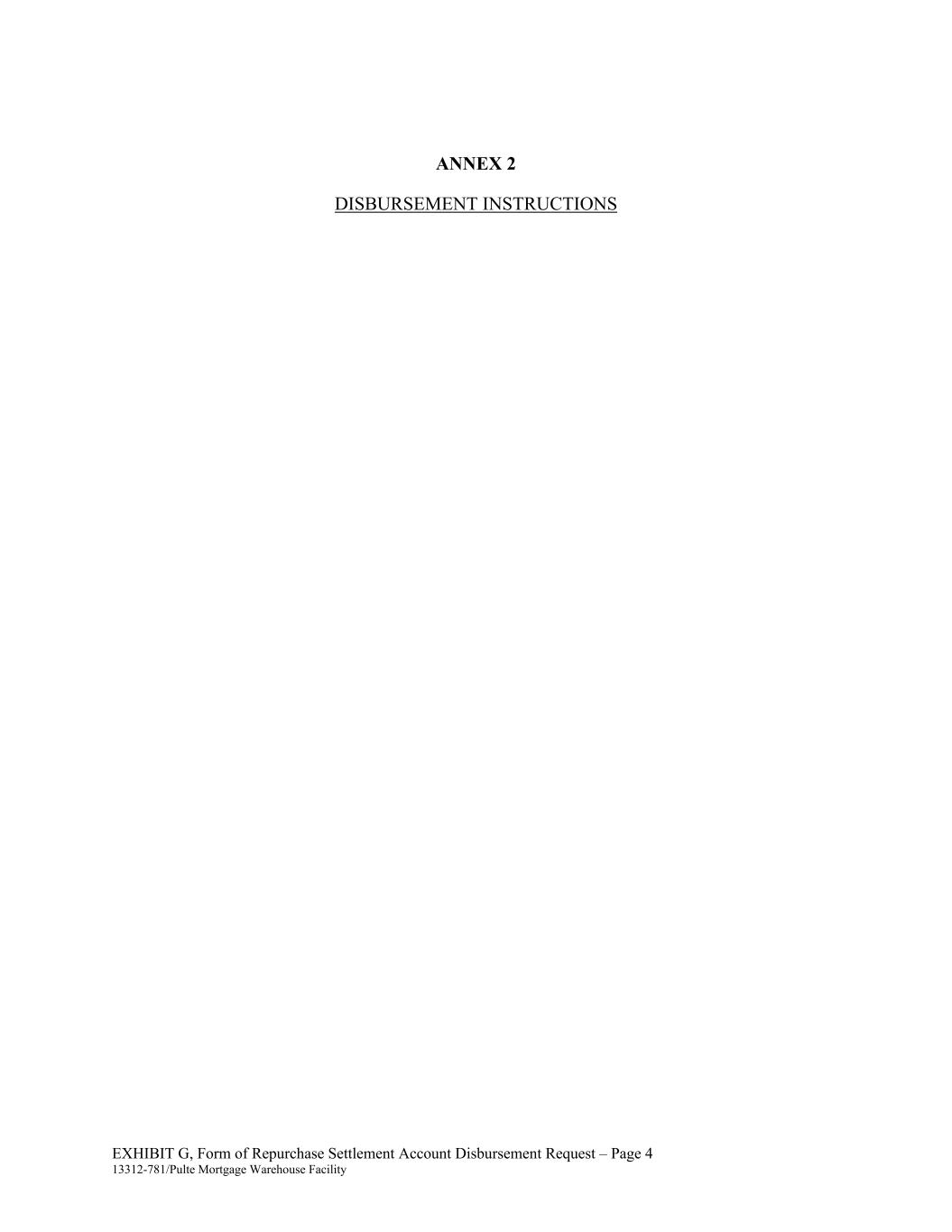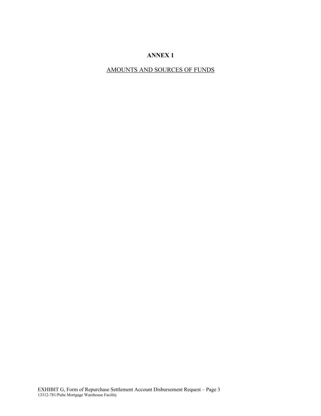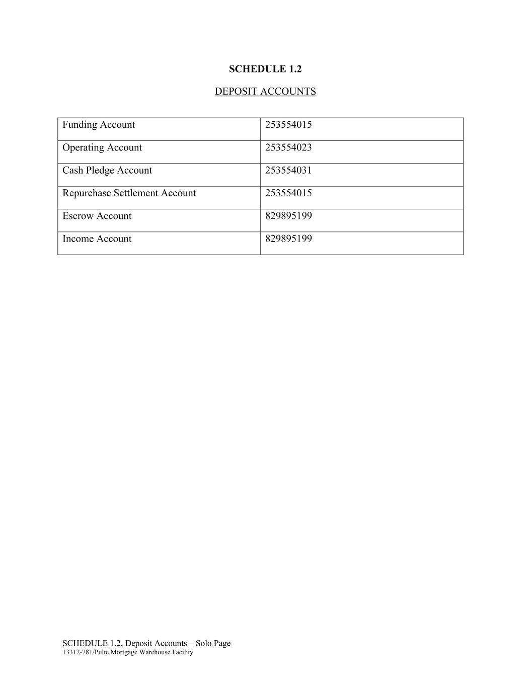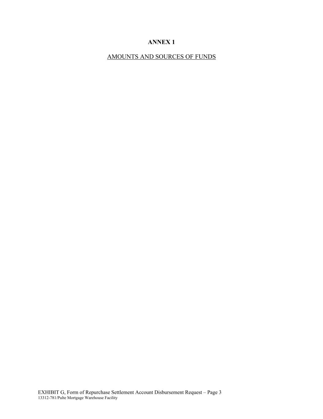 TABLE OF CONTENTS Page i 13312-781/Pulte Mortgage Warehouse Facility Section 1. Applicability and Defined Terms. ........................................................................... 1 1.1. Applicability ................................................................................................................... 1 1.2. Defined Terms ................................................................................................................ 2 1.3. Other Definitional Provisions ....................................................................................... 34 1.4. Rates .............................................................................................................................. 34 Section 2. The Buyers’ Commitments. .............................................................................. 3534 2.1. The Buyers’ Commitments to Purchase ................................................................. 3534 2.2. Expiration or Termination of the Commitments ........................................................... 35 2.3. Disbursement of Purchase Prices .................................................................................. 35 2.4. Swing Line Facility ................................................................................................ 3635 2.5. Swing Line Transactions............................................................................................... 36 2.6. Optional Termination, Reduction and Increase of Buyers’ Commitments ............ 3938 Section 3. Initiation; Termination. ..................................................................................... 4039 3.1. Seller Request; Agent Confirmation ...................................................................... 4039 3.2. Request/Confirmation ................................................................................................... 40 3.3. Transaction Termination; Purchase Price Decrease ............................................... 4140 3.4. Place for Payments of Repurchase Prices ..................................................................... 41 3.5. Withdrawals from and Credits to Operating Account ............................................ 4241 3.6. [Reserved] ..................................................................................................................... 42 3.7. Disbursements from Repurchase Settlement Account .................................................. 42 3.8. Delivery of Additional Mortgage Loans ....................................................................... 42 3.9. Application of Purchase Price Decreases ............................................................... 4342 3.10. Defaulting Buyers ......................................................................................................... 43 3.11. eMortgage Loan Transactions ................................................................................ 4645 Section 4. Transaction Limits and Sublimits. ........................................................................ 47 4.1. Transaction Limits ........................................................................................................ 47 4.2. Transaction Sublimits ................................................................................................... 48 4.3. Compliance ................................................................................................................... 49 Section 5. Price Differential. .................................................................................................. 49 5.1. Pricing Rate ................................................................................................................... 49 5.2. Pricing Rate for Default Pricing Rate Purchased Loans ............................................... 49 5.3. Price Differential Payment Due Dates .......................................................................... 49