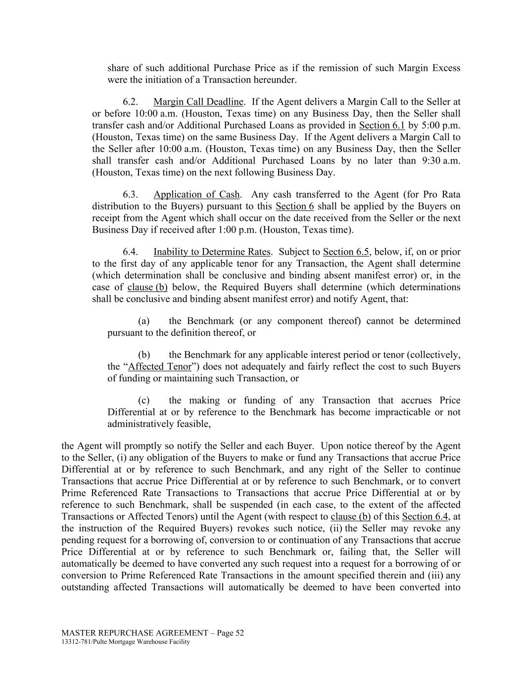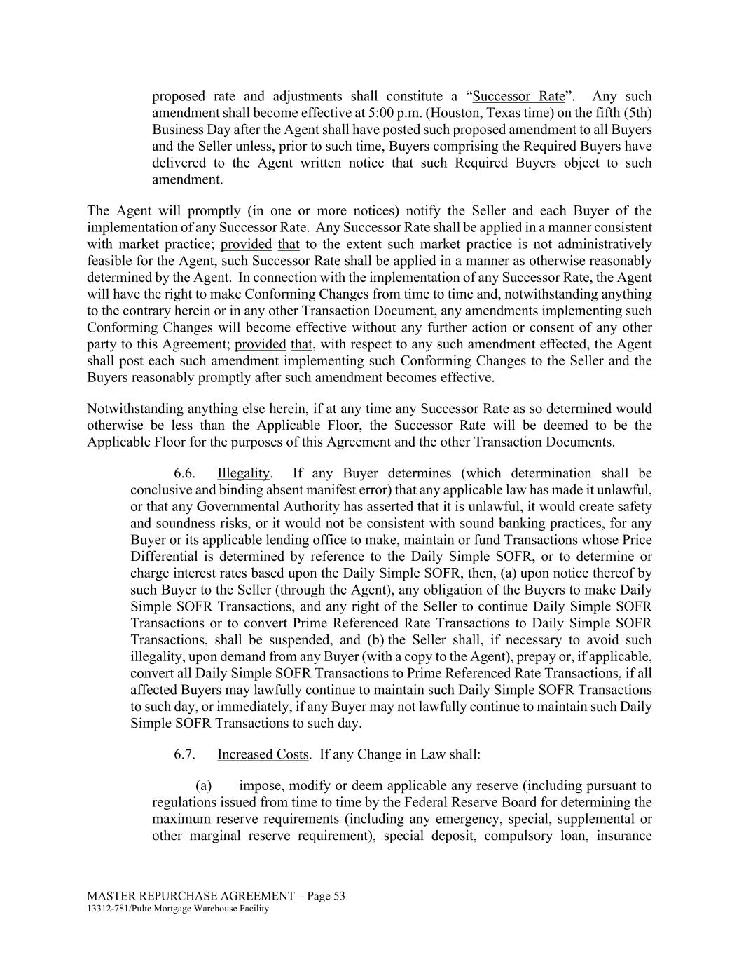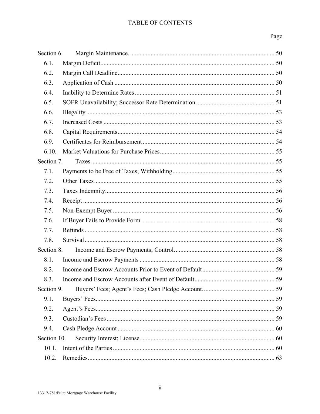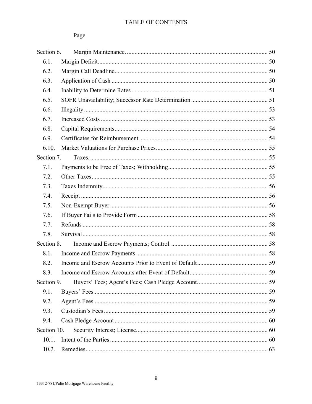 TABLE OF CONTENTS Page ii 13312-781/Pulte Mortgage Warehouse Facility Section 6. Margin Maintenance. ............................................................................................ 50 6.1. Margin Deficit ............................................................................................................... 50 6.2. Margin Call Deadline .................................................................................................... 50 6.3. Application of Cash ...................................................................................................... 50 6.4. Inability to Determine Rates ......................................................................................... 51 6.5. SOFR Unavailability; Successor Rate Determination .................................................. 51 6.6. Illegality ........................................................................................................................ 53 6.7. Increased Costs ............................................................................................................. 53 6.8. Capital Requirements .................................................................................................... 54 6.9. Certificates for Reimbursement .................................................................................... 54 6.10. Market Valuations for Purchase Prices ......................................................................... 55 Section 7. Taxes. .................................................................................................................... 55 7.1. Payments to be Free of Taxes; Withholding ................................................................. 55 7.2. Other Taxes ................................................................................................................... 55 7.3. Taxes Indemnity............................................................................................................ 56 7.4. Receipt .......................................................................................................................... 56 7.5. Non-Exempt Buyer ....................................................................................................... 56 7.6. If Buyer Fails to Provide Form ..................................................................................... 58 7.7. Refunds ......................................................................................................................... 58 7.8. Survival ......................................................................................................................... 58 Section 8. Income and Escrow Payments; Control. ............................................................... 58 8.1. Income and Escrow Payments ...................................................................................... 58 8.2. Income and Escrow Accounts Prior to Event of Default .............................................. 59 8.3. Income and Escrow Accounts after Event of Default ................................................... 59 Section 9. Buyers’ Fees; Agent’s Fees; Cash Pledge Account. ............................................. 59 9.1. Buyers’ Fees.................................................................................................................. 59 9.2. Agent’s Fees.................................................................................................................. 59 9.3. Custodian’s Fees ........................................................................................................... 59 9.4. Cash Pledge Account .................................................................................................... 60 Section 10. Security Interest; License. ..................................................................................... 60 10.1. Intent of the Parties ....................................................................................................... 60 10.2. Remedies ....................................................................................................................... 63