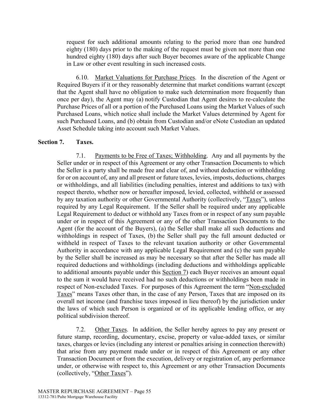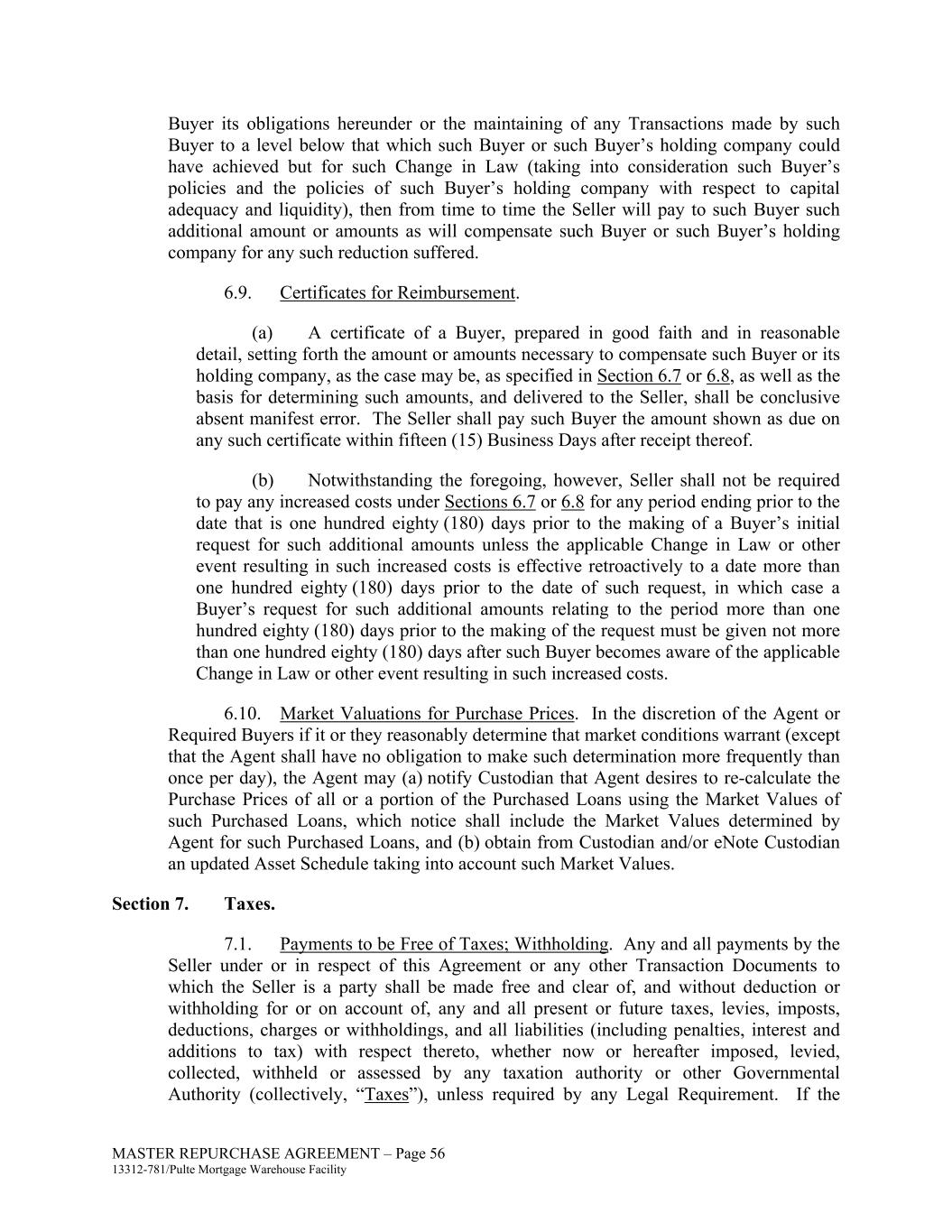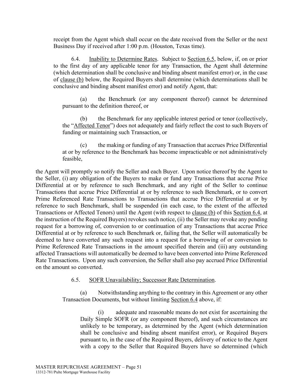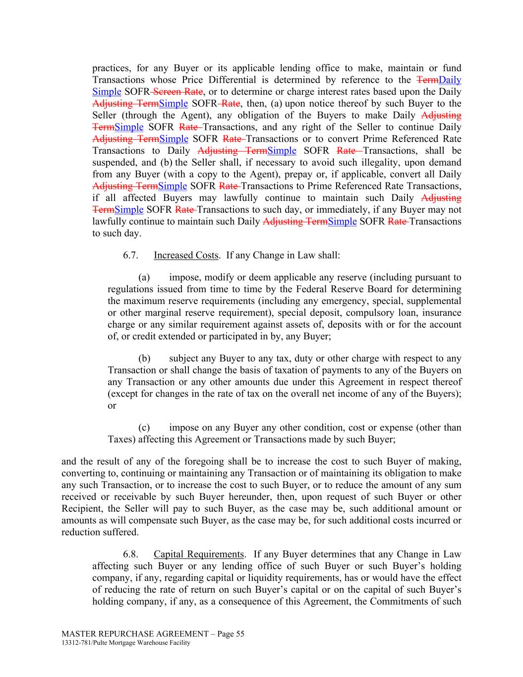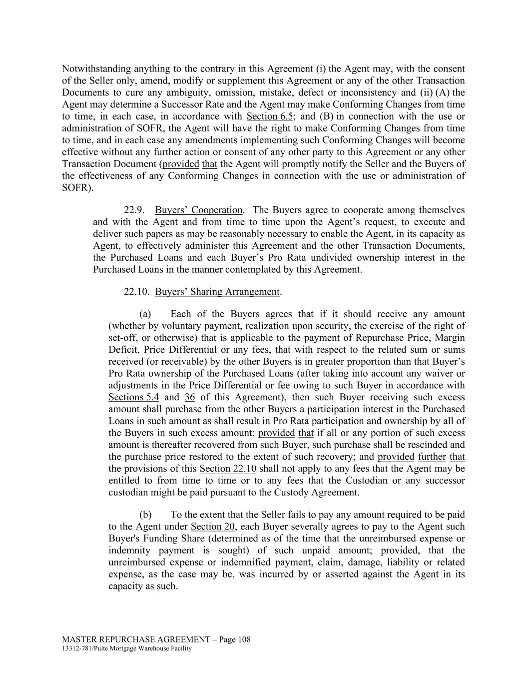 TABLE OF CONTENTS Page ii 13312-781/Pulte Mortgage Warehouse Facility Section 6. Margin Maintenance. ............................................................................................ 50 6.1. Margin Deficit ............................................................................................................... 50 6.2. Margin Call Deadline .................................................................................................... 50 6.3. Application of Cash ...................................................................................................... 50 6.4. Inability to Determine Rates ......................................................................................... 51 6.5. SOFR Unavailability; Successor Rate Determination .................................................. 51 6.6. Illegality ........................................................................................................................ 53 6.7. Increased Costs ............................................................................................................. 53 6.8. Capital Requirements .................................................................................................... 54 6.9. Certificates for Reimbursement .................................................................................... 54 6.10. Market Valuations for Purchase Prices ......................................................................... 55 Section 7. Taxes. .................................................................................................................... 55 7.1. Payments to be Free of Taxes; Withholding ................................................................. 55 7.2. Other Taxes ................................................................................................................... 55 7.3. Taxes Indemnity............................................................................................................ 56 7.4. Receipt .......................................................................................................................... 56 7.5. Non-Exempt Buyer ....................................................................................................... 56 7.6. If Buyer Fails to Provide Form ..................................................................................... 58 7.7. Refunds ......................................................................................................................... 58 7.8. Survival ......................................................................................................................... 58 Section 8. Income and Escrow Payments; Control. ............................................................... 58 8.1. Income and Escrow Payments ...................................................................................... 58 8.2. Income and Escrow Accounts Prior to Event of Default .............................................. 59 8.3. Income and Escrow Accounts after Event of Default ................................................... 59 Section 9. Buyers’ Fees; Agent’s Fees; Cash Pledge Account. ............................................. 59 9.1. Buyers’ Fees.................................................................................................................. 59 9.2. Agent’s Fees.................................................................................................................. 59 9.3. Custodian’s Fees ........................................................................................................... 59 9.4. Cash Pledge Account .................................................................................................... 60 Section 10. Security Interest; License. ..................................................................................... 60 10.1. Intent of the Parties ....................................................................................................... 60 10.2. Remedies ....................................................................................................................... 63