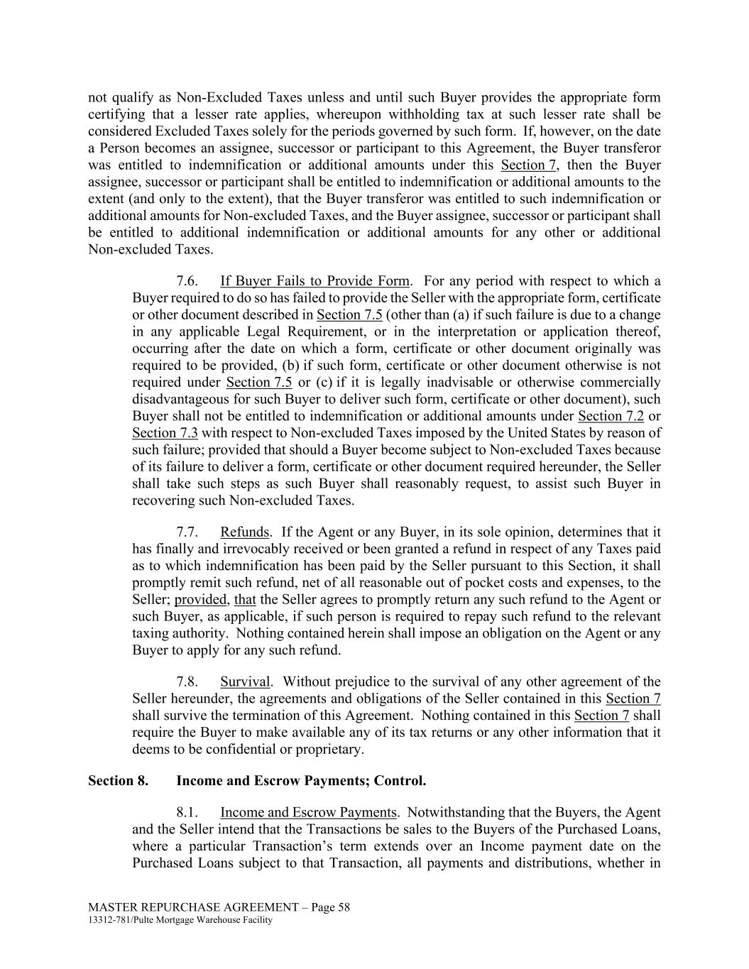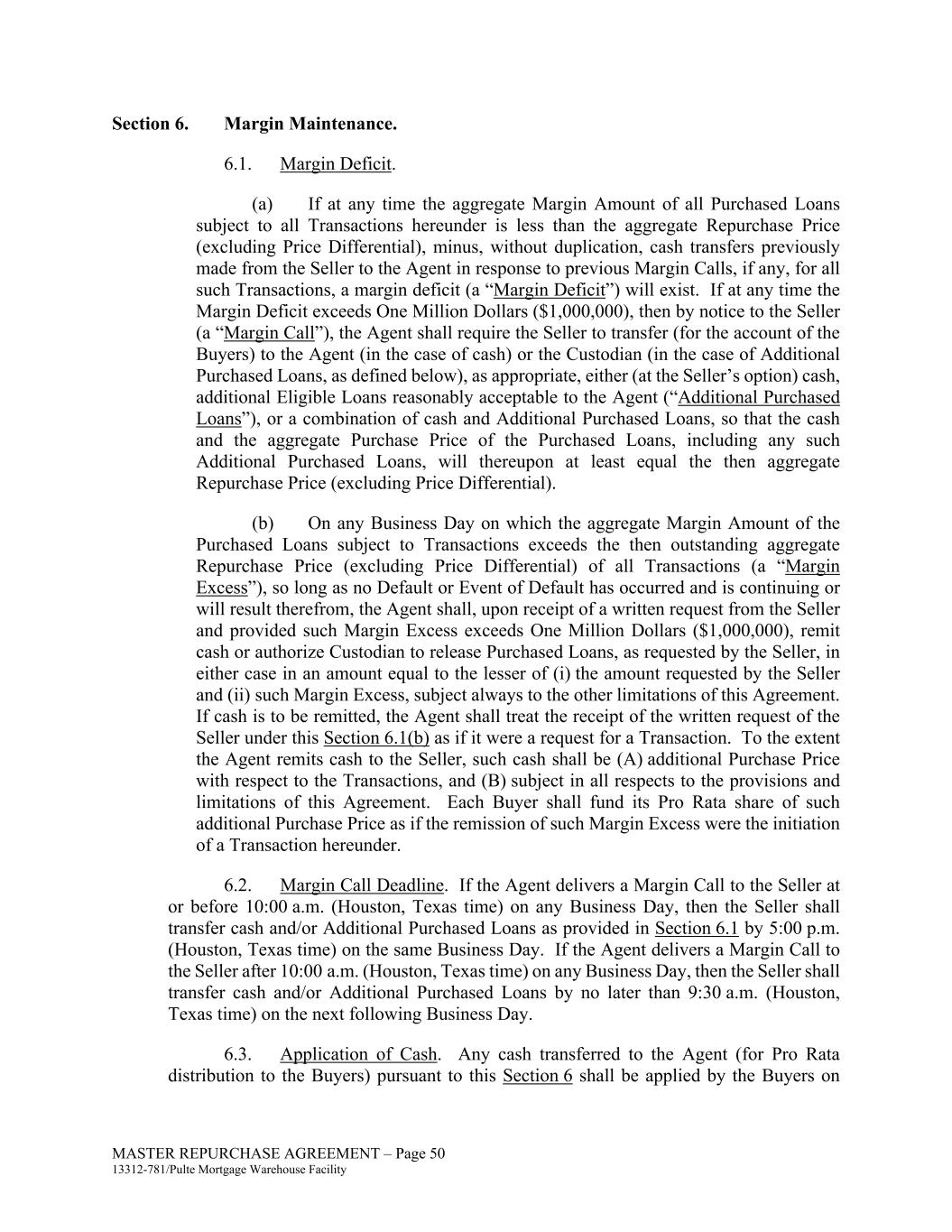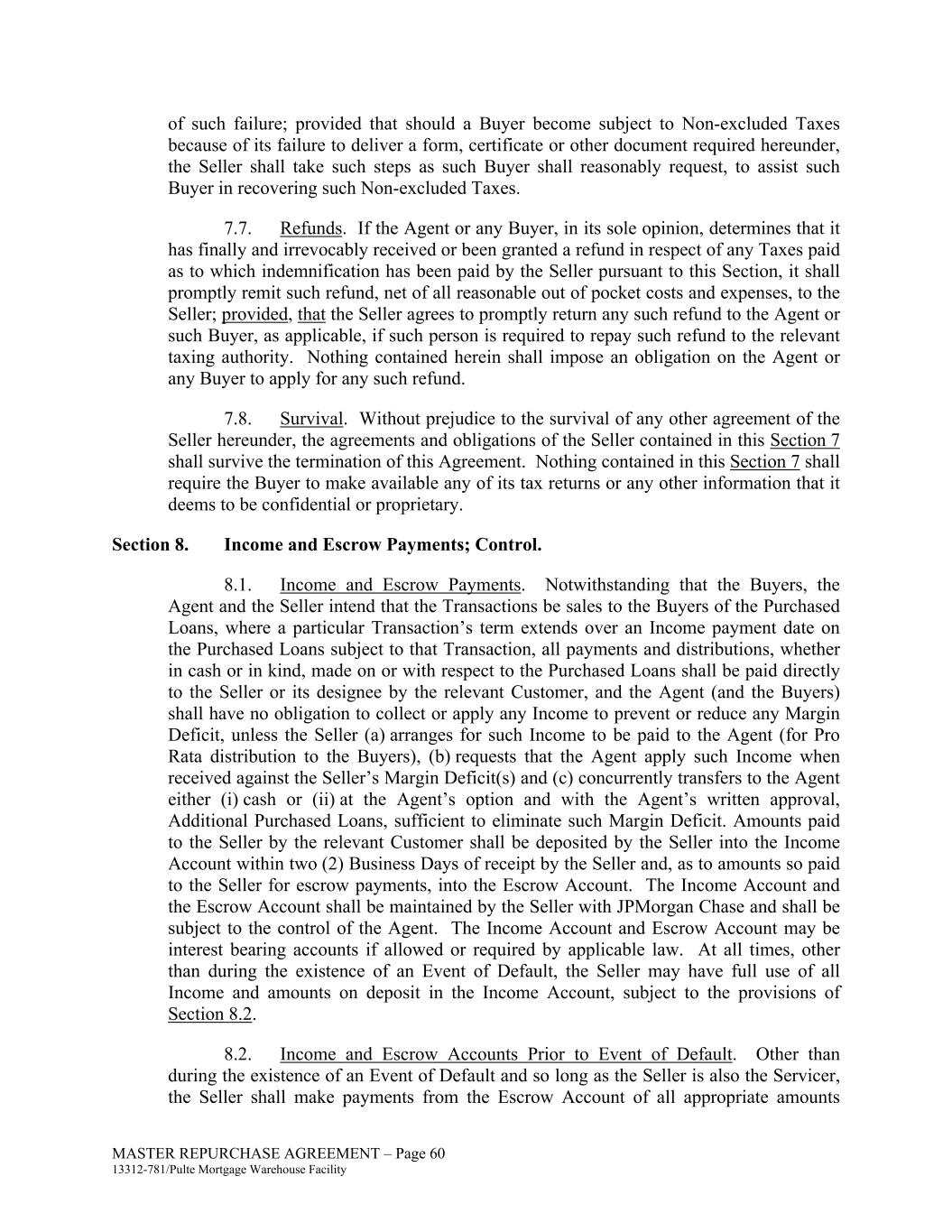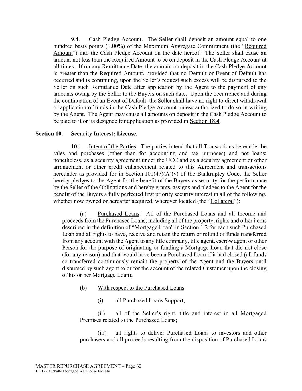 TABLE OF CONTENTS Page ii 13312-781/Pulte Mortgage Warehouse Facility Section 6. Margin Maintenance. ............................................................................................ 50 6.1. Margin Deficit ............................................................................................................... 50 6.2. Margin Call Deadline .................................................................................................... 50 6.3. Application of Cash ...................................................................................................... 50 6.4. Inability to Determine Rates ......................................................................................... 51 6.5. SOFR Unavailability; Successor Rate Determination .................................................. 51 6.6. Illegality ........................................................................................................................ 53 6.7. Increased Costs ............................................................................................................. 53 6.8. Capital Requirements .................................................................................................... 54 6.9. Certificates for Reimbursement .................................................................................... 54 6.10. Market Valuations for Purchase Prices ......................................................................... 55 Section 7. Taxes. .................................................................................................................... 55 7.1. Payments to be Free of Taxes; Withholding ................................................................. 55 7.2. Other Taxes ................................................................................................................... 55 7.3. Taxes Indemnity............................................................................................................ 56 7.4. Receipt .......................................................................................................................... 56 7.5. Non-Exempt Buyer ....................................................................................................... 56 7.6. If Buyer Fails to Provide Form ..................................................................................... 58 7.7. Refunds ......................................................................................................................... 58 7.8. Survival ......................................................................................................................... 58 Section 8. Income and Escrow Payments; Control. ............................................................... 58 8.1. Income and Escrow Payments ...................................................................................... 58 8.2. Income and Escrow Accounts Prior to Event of Default .............................................. 59 8.3. Income and Escrow Accounts after Event of Default ................................................... 59 Section 9. Buyers’ Fees; Agent’s Fees; Cash Pledge Account. ............................................. 59 9.1. Buyers’ Fees.................................................................................................................. 59 9.2. Agent’s Fees.................................................................................................................. 59 9.3. Custodian’s Fees ........................................................................................................... 59 9.4. Cash Pledge Account .................................................................................................... 60 Section 10. Security Interest; License. ..................................................................................... 60 10.1. Intent of the Parties ....................................................................................................... 60 10.2. Remedies ....................................................................................................................... 63