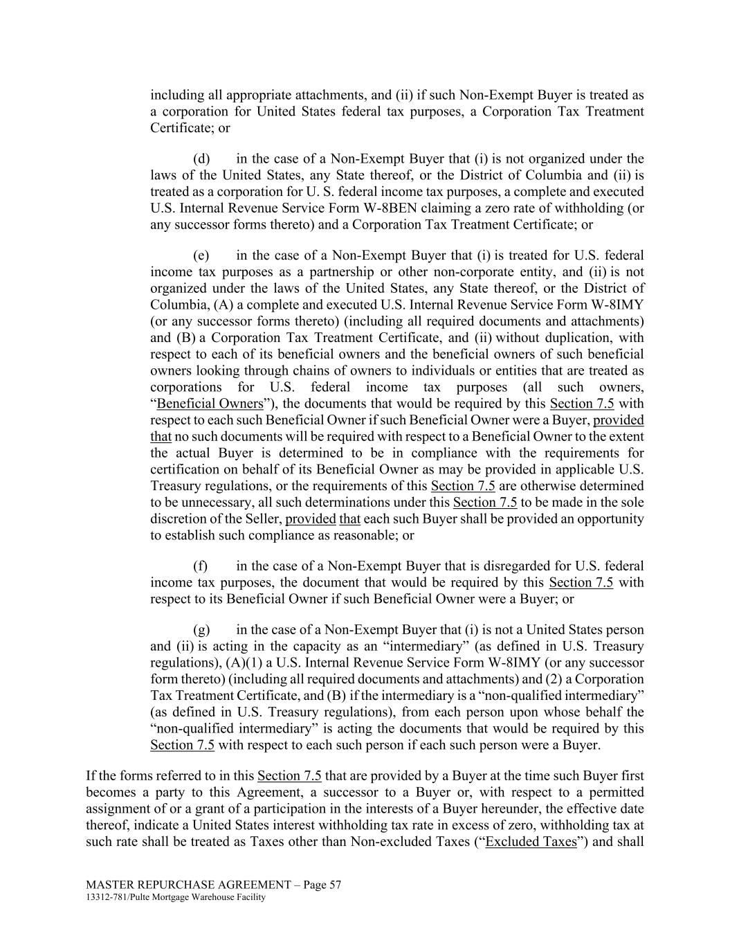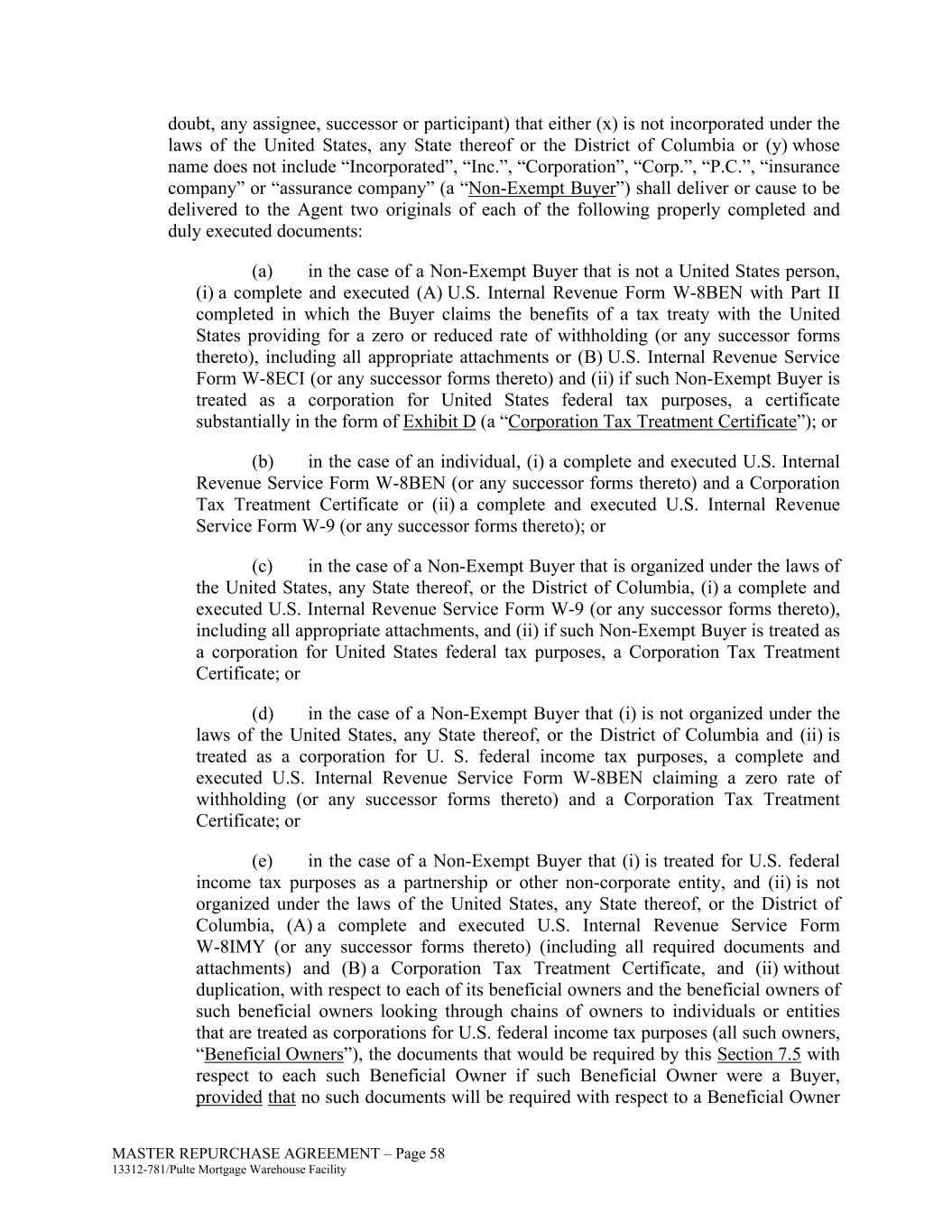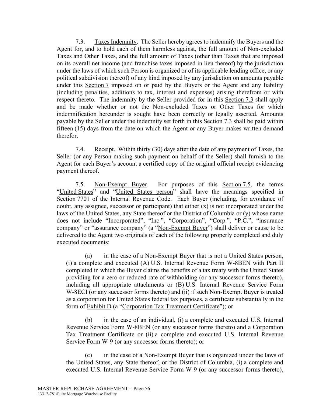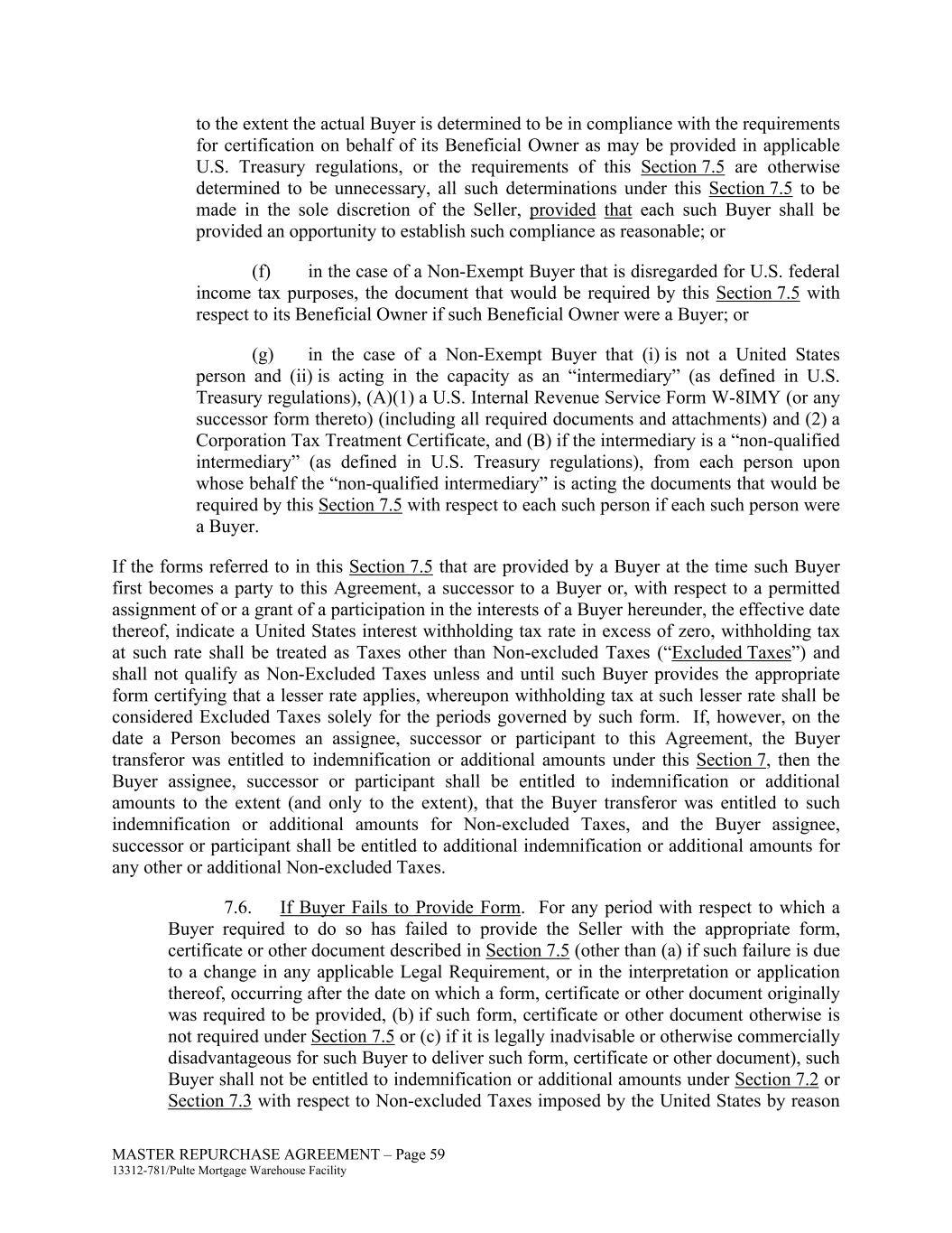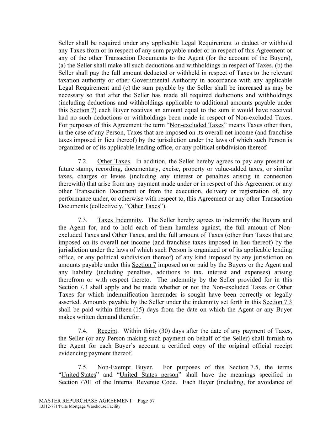 TABLE OF CONTENTS Page ii 13312-781/Pulte Mortgage Warehouse Facility Section 6. Margin Maintenance. ............................................................................................ 50 6.1. Margin Deficit ............................................................................................................... 50 6.2. Margin Call Deadline .................................................................................................... 50 6.3. Application of Cash ...................................................................................................... 50 6.4. Inability to Determine Rates ......................................................................................... 51 6.5. SOFR Unavailability; Successor Rate Determination .................................................. 51 6.6. Illegality ........................................................................................................................ 53 6.7. Increased Costs ............................................................................................................. 53 6.8. Capital Requirements .................................................................................................... 54 6.9. Certificates for Reimbursement .................................................................................... 54 6.10. Market Valuations for Purchase Prices ......................................................................... 55 Section 7. Taxes. .................................................................................................................... 55 7.1. Payments to be Free of Taxes; Withholding ................................................................. 55 7.2. Other Taxes ................................................................................................................... 55 7.3. Taxes Indemnity............................................................................................................ 56 7.4. Receipt .......................................................................................................................... 56 7.5. Non-Exempt Buyer ....................................................................................................... 56 7.6. If Buyer Fails to Provide Form ..................................................................................... 58 7.7. Refunds ......................................................................................................................... 58 7.8. Survival ......................................................................................................................... 58 Section 8. Income and Escrow Payments; Control. ............................................................... 58 8.1. Income and Escrow Payments ...................................................................................... 58 8.2. Income and Escrow Accounts Prior to Event of Default .............................................. 59 8.3. Income and Escrow Accounts after Event of Default ................................................... 59 Section 9. Buyers’ Fees; Agent’s Fees; Cash Pledge Account. ............................................. 59 9.1. Buyers’ Fees.................................................................................................................. 59 9.2. Agent’s Fees.................................................................................................................. 59 9.3. Custodian’s Fees ........................................................................................................... 59 9.4. Cash Pledge Account .................................................................................................... 60 Section 10. Security Interest; License. ..................................................................................... 60 10.1. Intent of the Parties ....................................................................................................... 60 10.2. Remedies ....................................................................................................................... 63