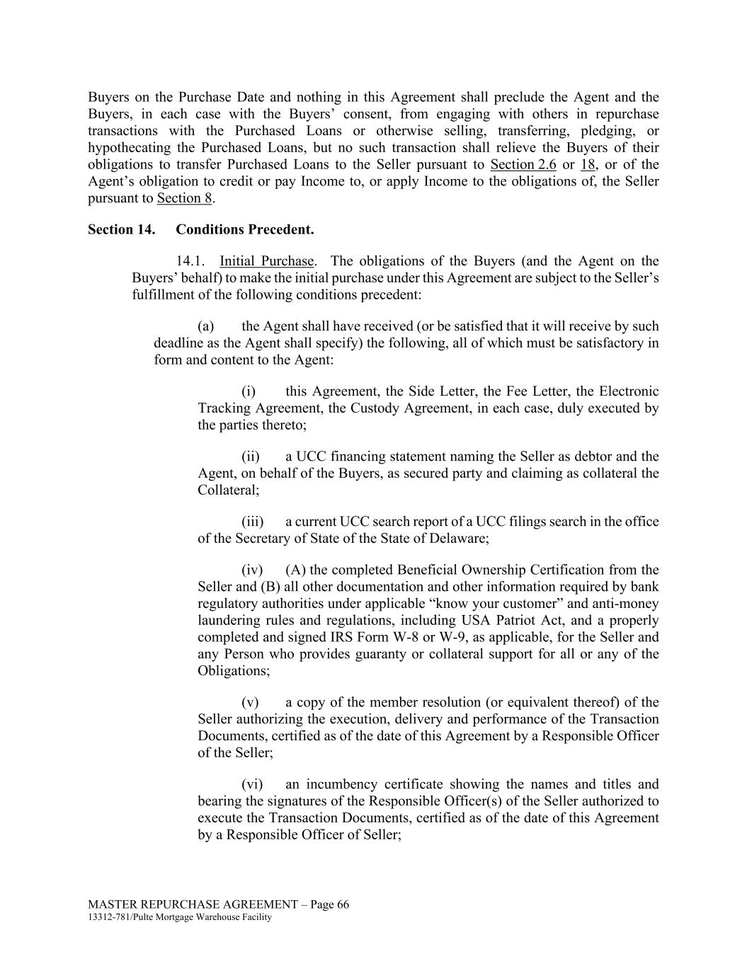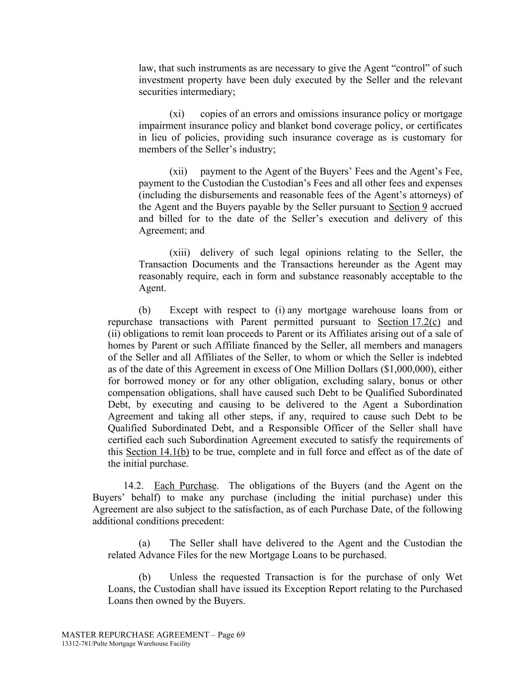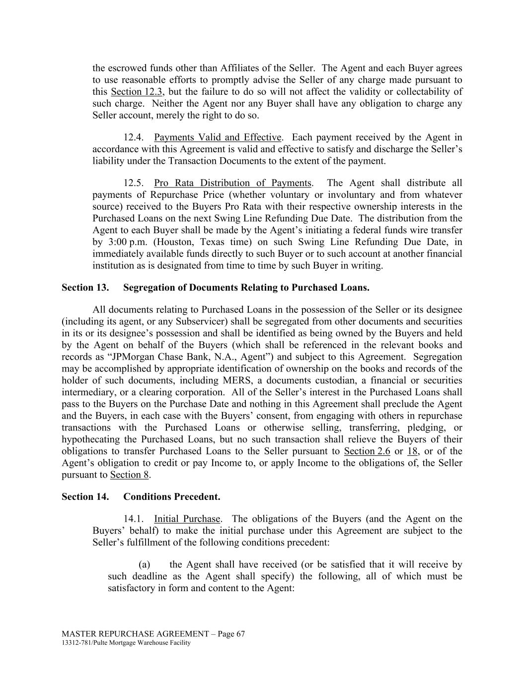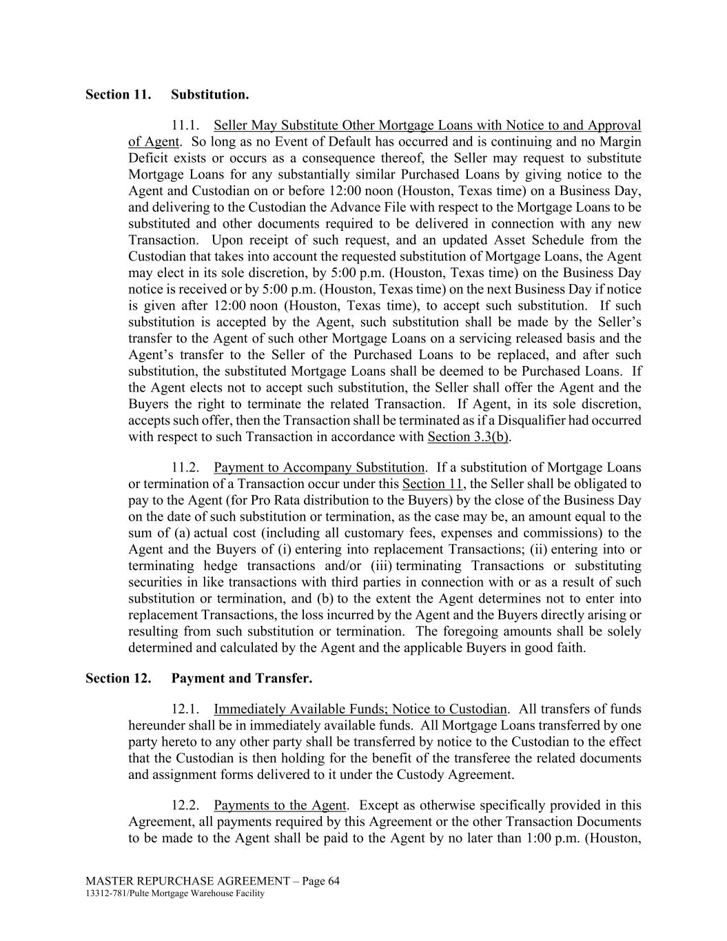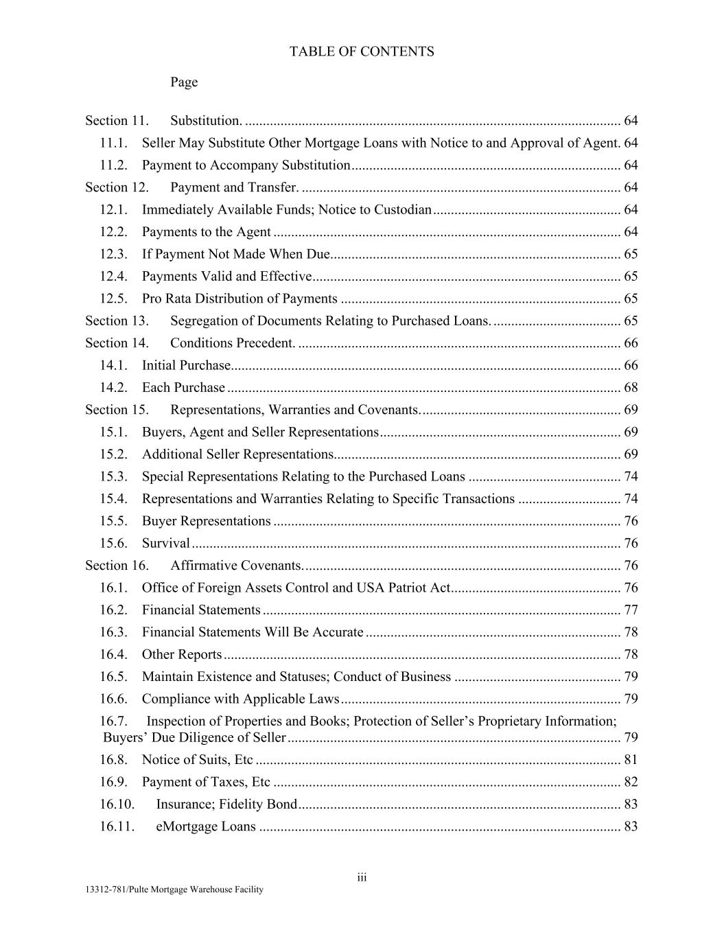 TABLE OF CONTENTS Page iii 13312-781/Pulte Mortgage Warehouse Facility Section 11. Substitution. .......................................................................................................... 64 11.1. Seller May Substitute Other Mortgage Loans with Notice to and Approval of Agent . 64 11.2. Payment to Accompany Substitution ............................................................................ 64 Section 12. Payment and Transfer. .......................................................................................... 64 12.1. Immediately Available Funds; Notice to Custodian ..................................................... 64 12.2. Payments to the Agent .................................................................................................. 64 12.3. If Payment Not Made When Due .................................................................................. 65 12.4. Payments Valid and Effective ....................................................................................... 65 12.5. Pro Rata Distribution of Payments ............................................................................... 65 Section 13. Segregation of Documents Relating to Purchased Loans. .................................... 65 Section 14. Conditions Precedent. ........................................................................................... 66 14.1. Initial Purchase .............................................................................................................. 66 14.2. Each Purchase ............................................................................................................... 68 Section 15. Representations, Warranties and Covenants. ........................................................ 69 15.1. Buyers, Agent and Seller Representations .................................................................... 69 15.2. Additional Seller Representations................................................................................. 69 15.3. Special Representations Relating to the Purchased Loans ........................................... 74 15.4. Representations and Warranties Relating to Specific Transactions ............................. 74 15.5. Buyer Representations .................................................................................................. 76 15.6. Survival ......................................................................................................................... 76 Section 16. Affirmative Covenants. ......................................................................................... 76 16.1. Office of Foreign Assets Control and USA Patriot Act ................................................ 76 16.2. Financial Statements ..................................................................................................... 77 16.3. Financial Statements Will Be Accurate ........................................................................ 78 16.4. Other Reports ................................................................................................................ 78 16.5. Maintain Existence and Statuses; Conduct of Business ............................................... 79 16.6. Compliance with Applicable Laws ............................................................................... 79 16.7. Inspection of Properties and Books; Protection of Seller’s Proprietary Information; Buyers’ Due Diligence of Seller .............................................................................................. 79 16.8. Notice of Suits, Etc ....................................................................................................... 81 16.9. Payment of Taxes, Etc .................................................................................................. 82 16.10. Insurance; Fidelity Bond ........................................................................................... 83 16.11. eMortgage Loans ...................................................................................................... 83