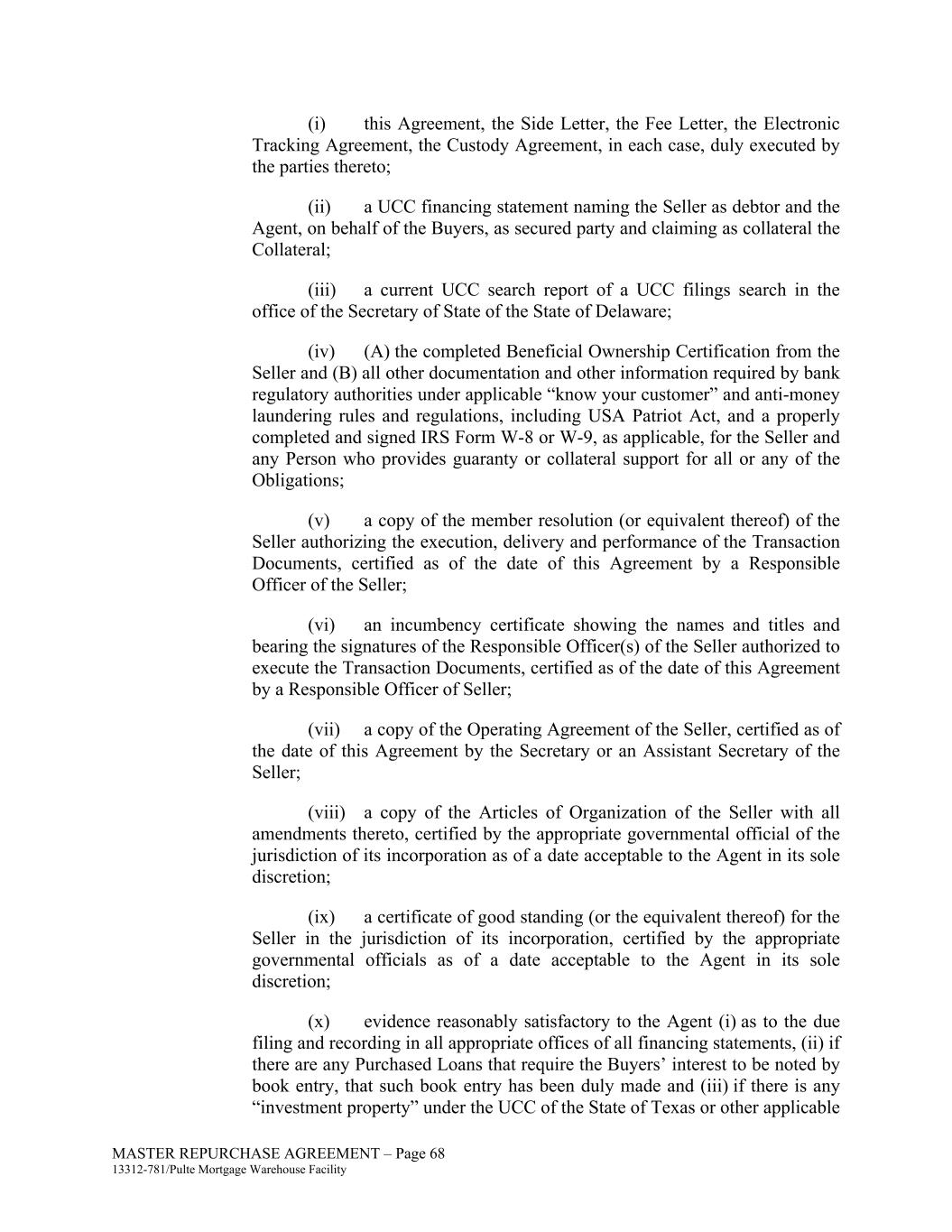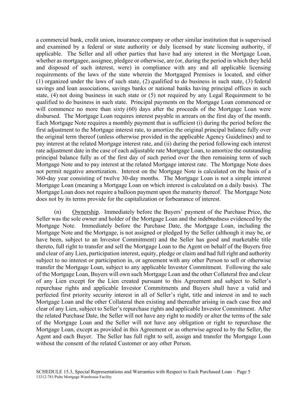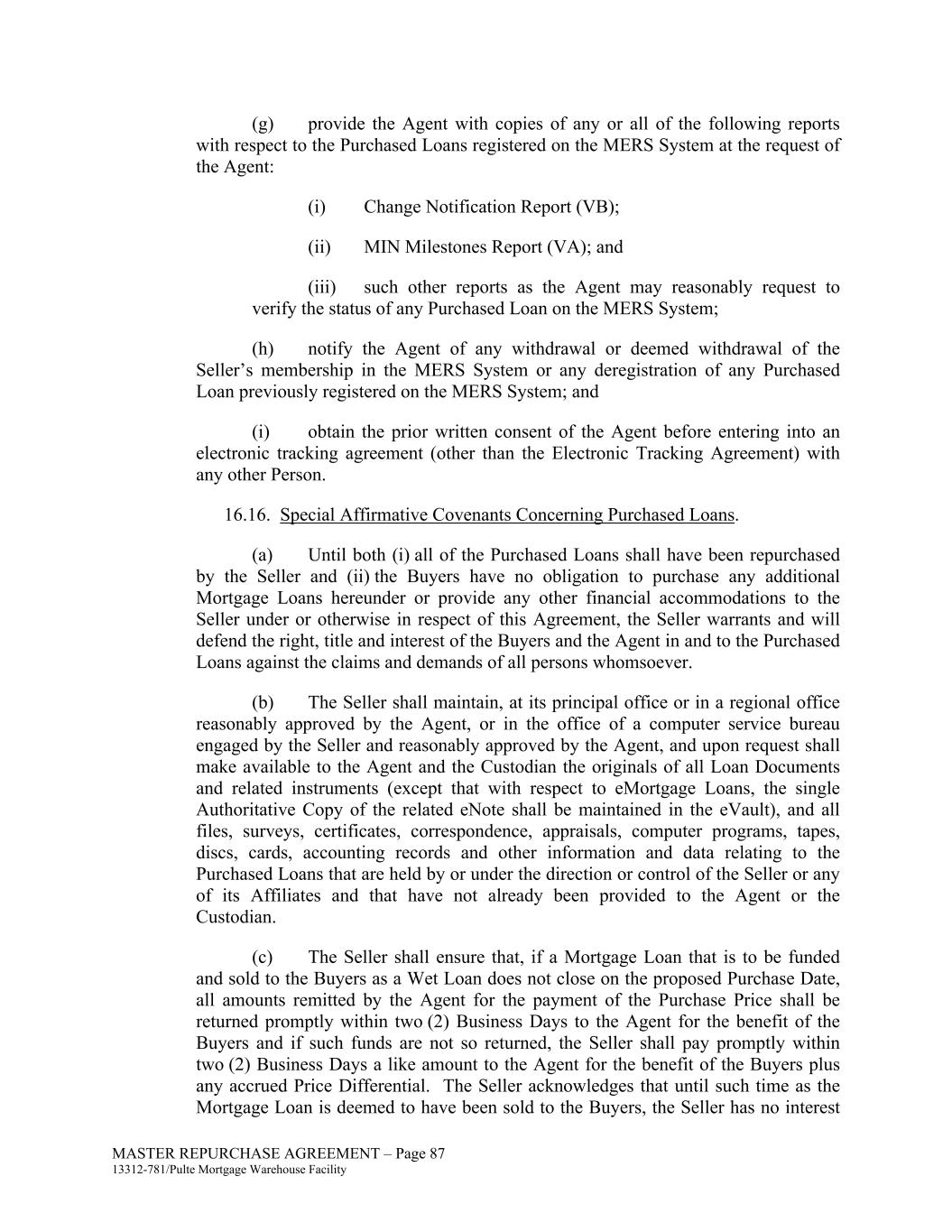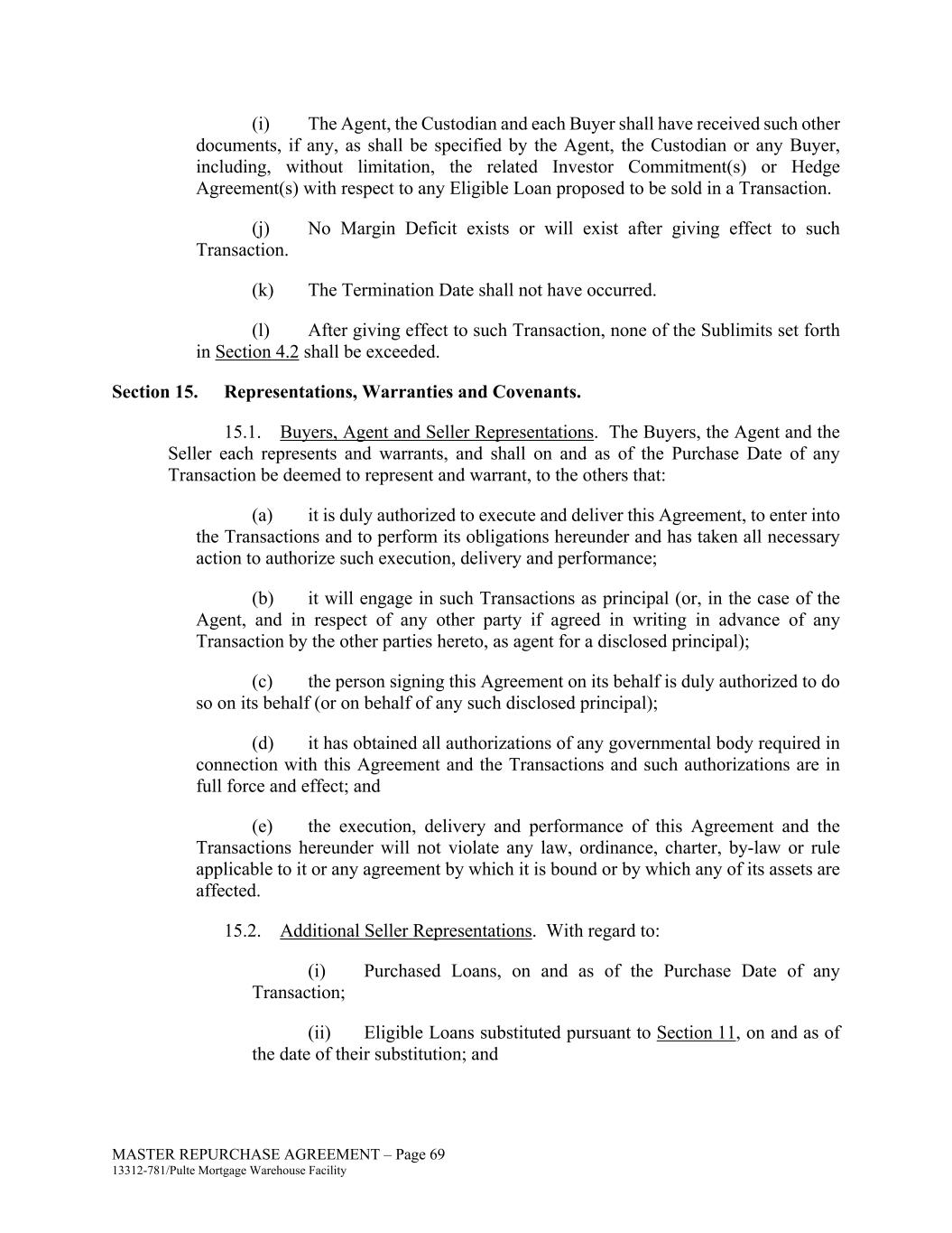 TABLE OF CONTENTS Page iii 13312-781/Pulte Mortgage Warehouse Facility Section 11. Substitution. .......................................................................................................... 64 11.1. Seller May Substitute Other Mortgage Loans with Notice to and Approval of Agent . 64 11.2. Payment to Accompany Substitution ............................................................................ 64 Section 12. Payment and Transfer. .......................................................................................... 64 12.1. Immediately Available Funds; Notice to Custodian ..................................................... 64 12.2. Payments to the Agent .................................................................................................. 64 12.3. If Payment Not Made When Due .................................................................................. 65 12.4. Payments Valid and Effective ....................................................................................... 65 12.5. Pro Rata Distribution of Payments ............................................................................... 65 Section 13. Segregation of Documents Relating to Purchased Loans. .................................... 65 Section 14. Conditions Precedent. ........................................................................................... 66 14.1. Initial Purchase .............................................................................................................. 66 14.2. Each Purchase ............................................................................................................... 68 Section 15. Representations, Warranties and Covenants. ........................................................ 69 15.1. Buyers, Agent and Seller Representations .................................................................... 69 15.2. Additional Seller Representations................................................................................. 69 15.3. Special Representations Relating to the Purchased Loans ........................................... 74 15.4. Representations and Warranties Relating to Specific Transactions ............................. 74 15.5. Buyer Representations .................................................................................................. 76 15.6. Survival ......................................................................................................................... 76 Section 16. Affirmative Covenants. ......................................................................................... 76 16.1. Office of Foreign Assets Control and USA Patriot Act ................................................ 76 16.2. Financial Statements ..................................................................................................... 77 16.3. Financial Statements Will Be Accurate ........................................................................ 78 16.4. Other Reports ................................................................................................................ 78 16.5. Maintain Existence and Statuses; Conduct of Business ............................................... 79 16.6. Compliance with Applicable Laws ............................................................................... 79 16.7. Inspection of Properties and Books; Protection of Seller’s Proprietary Information; Buyers’ Due Diligence of Seller .............................................................................................. 79 16.8. Notice of Suits, Etc ....................................................................................................... 81 16.9. Payment of Taxes, Etc .................................................................................................. 82 16.10. Insurance; Fidelity Bond ........................................................................................... 83 16.11. eMortgage Loans ...................................................................................................... 83