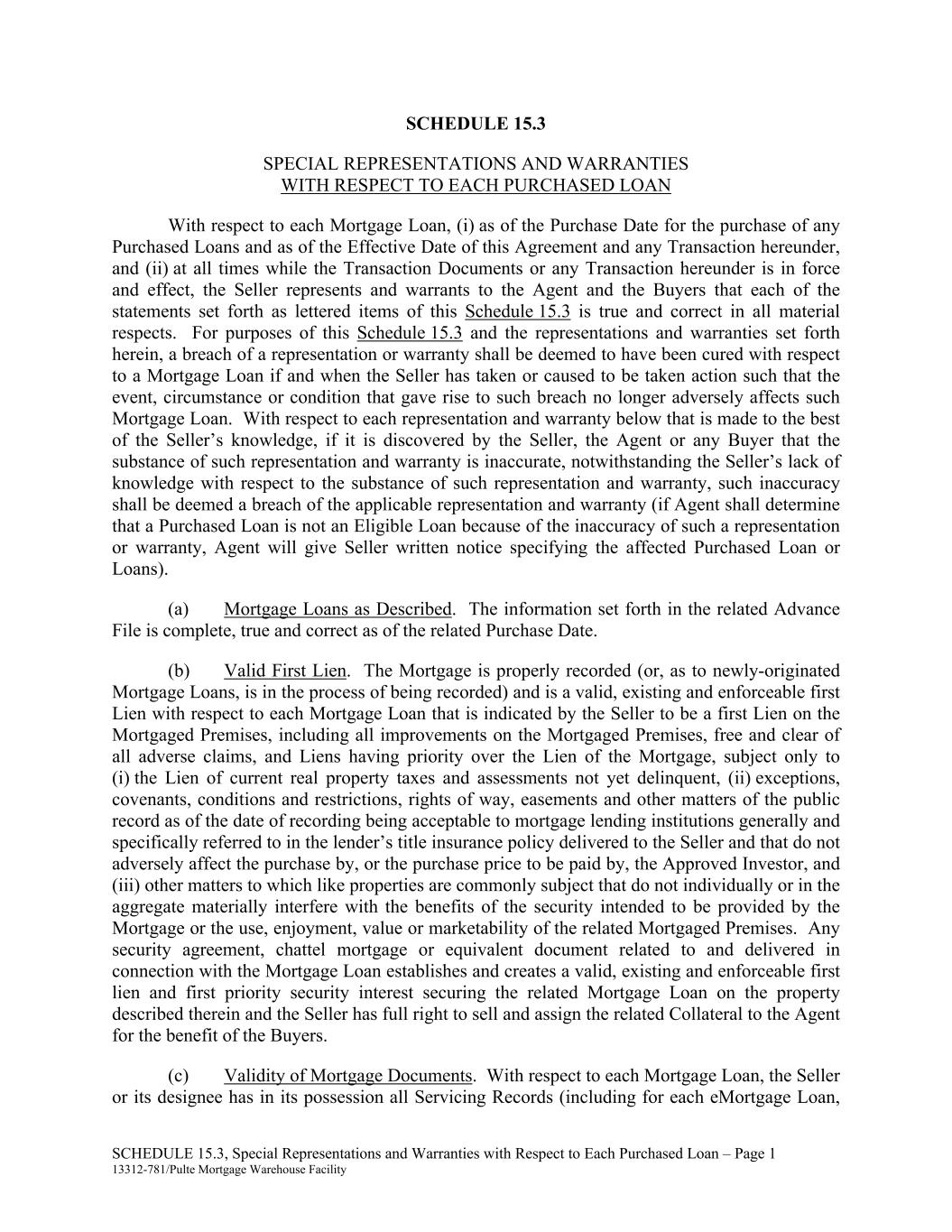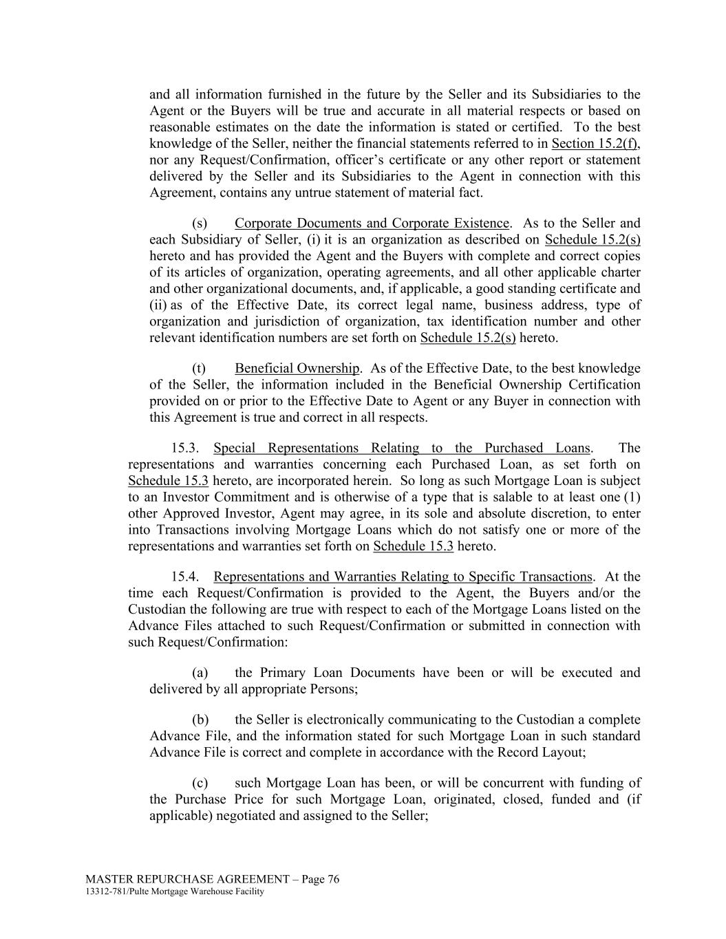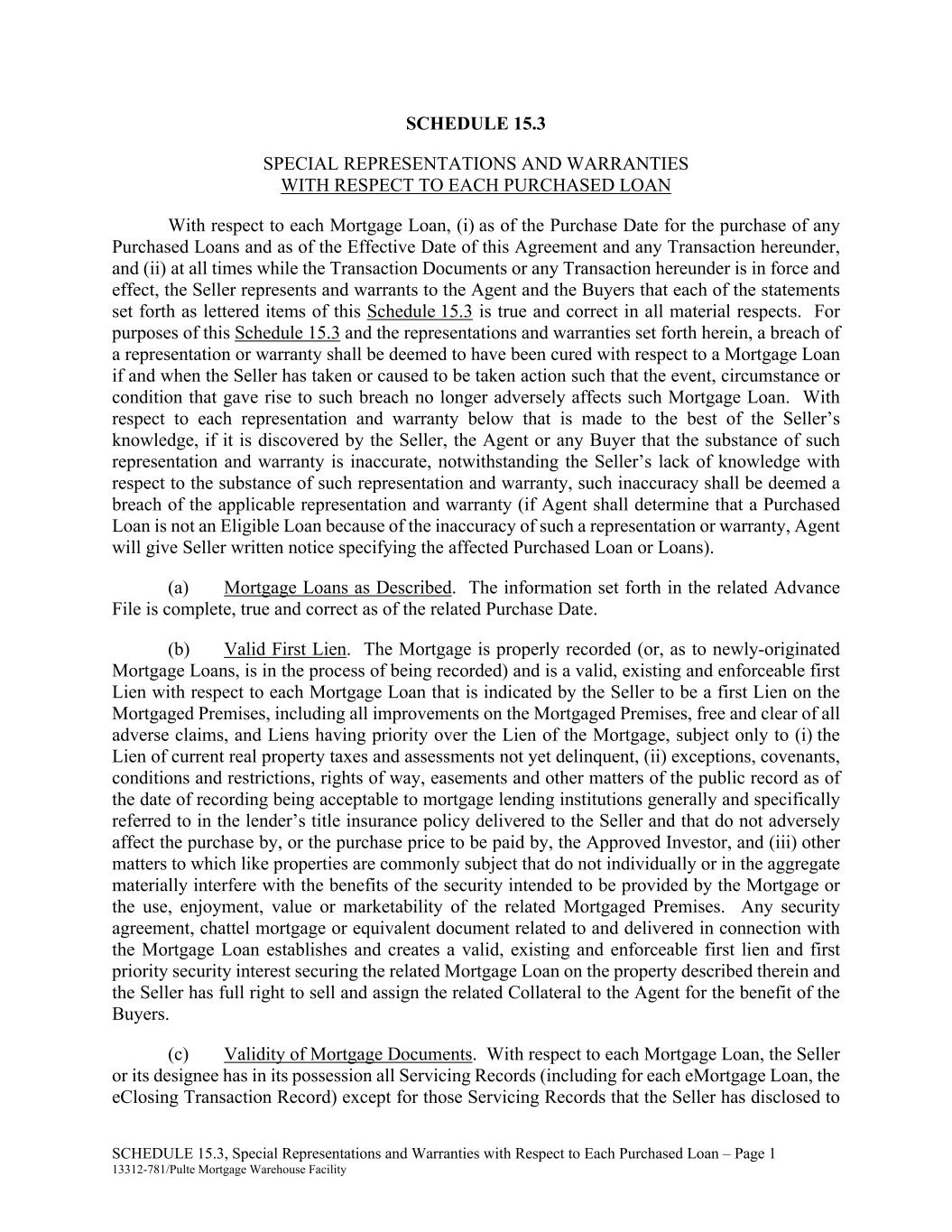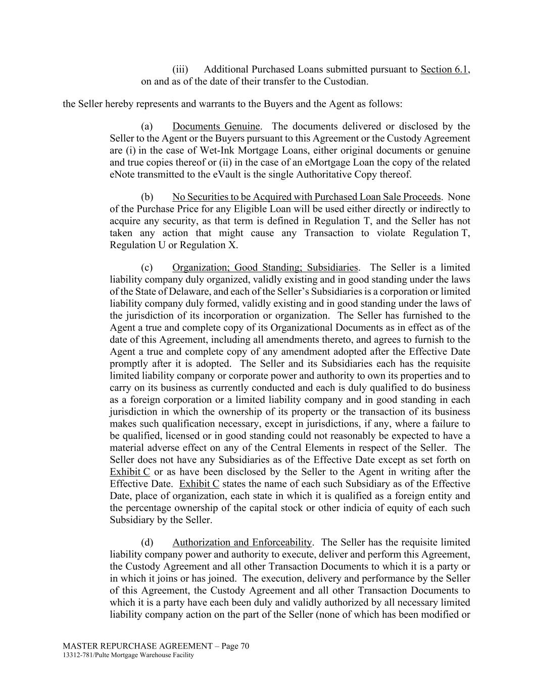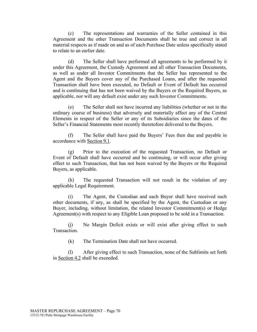 TABLE OF CONTENTS Page iii 13312-781/Pulte Mortgage Warehouse Facility Section 11. Substitution. .......................................................................................................... 64 11.1. Seller May Substitute Other Mortgage Loans with Notice to and Approval of Agent . 64 11.2. Payment to Accompany Substitution ............................................................................ 64 Section 12. Payment and Transfer. .......................................................................................... 64 12.1. Immediately Available Funds; Notice to Custodian ..................................................... 64 12.2. Payments to the Agent .................................................................................................. 64 12.3. If Payment Not Made When Due .................................................................................. 65 12.4. Payments Valid and Effective ....................................................................................... 65 12.5. Pro Rata Distribution of Payments ............................................................................... 65 Section 13. Segregation of Documents Relating to Purchased Loans. .................................... 65 Section 14. Conditions Precedent. ........................................................................................... 66 14.1. Initial Purchase .............................................................................................................. 66 14.2. Each Purchase ............................................................................................................... 68 Section 15. Representations, Warranties and Covenants. ........................................................ 69 15.1. Buyers, Agent and Seller Representations .................................................................... 69 15.2. Additional Seller Representations................................................................................. 69 15.3. Special Representations Relating to the Purchased Loans ........................................... 74 15.4. Representations and Warranties Relating to Specific Transactions ............................. 74 15.5. Buyer Representations .................................................................................................. 76 15.6. Survival ......................................................................................................................... 76 Section 16. Affirmative Covenants. ......................................................................................... 76 16.1. Office of Foreign Assets Control and USA Patriot Act ................................................ 76 16.2. Financial Statements ..................................................................................................... 77 16.3. Financial Statements Will Be Accurate ........................................................................ 78 16.4. Other Reports ................................................................................................................ 78 16.5. Maintain Existence and Statuses; Conduct of Business ............................................... 79 16.6. Compliance with Applicable Laws ............................................................................... 79 16.7. Inspection of Properties and Books; Protection of Seller’s Proprietary Information; Buyers’ Due Diligence of Seller .............................................................................................. 79 16.8. Notice of Suits, Etc ....................................................................................................... 81 16.9. Payment of Taxes, Etc .................................................................................................. 82 16.10. Insurance; Fidelity Bond ........................................................................................... 83 16.11. eMortgage Loans ...................................................................................................... 83